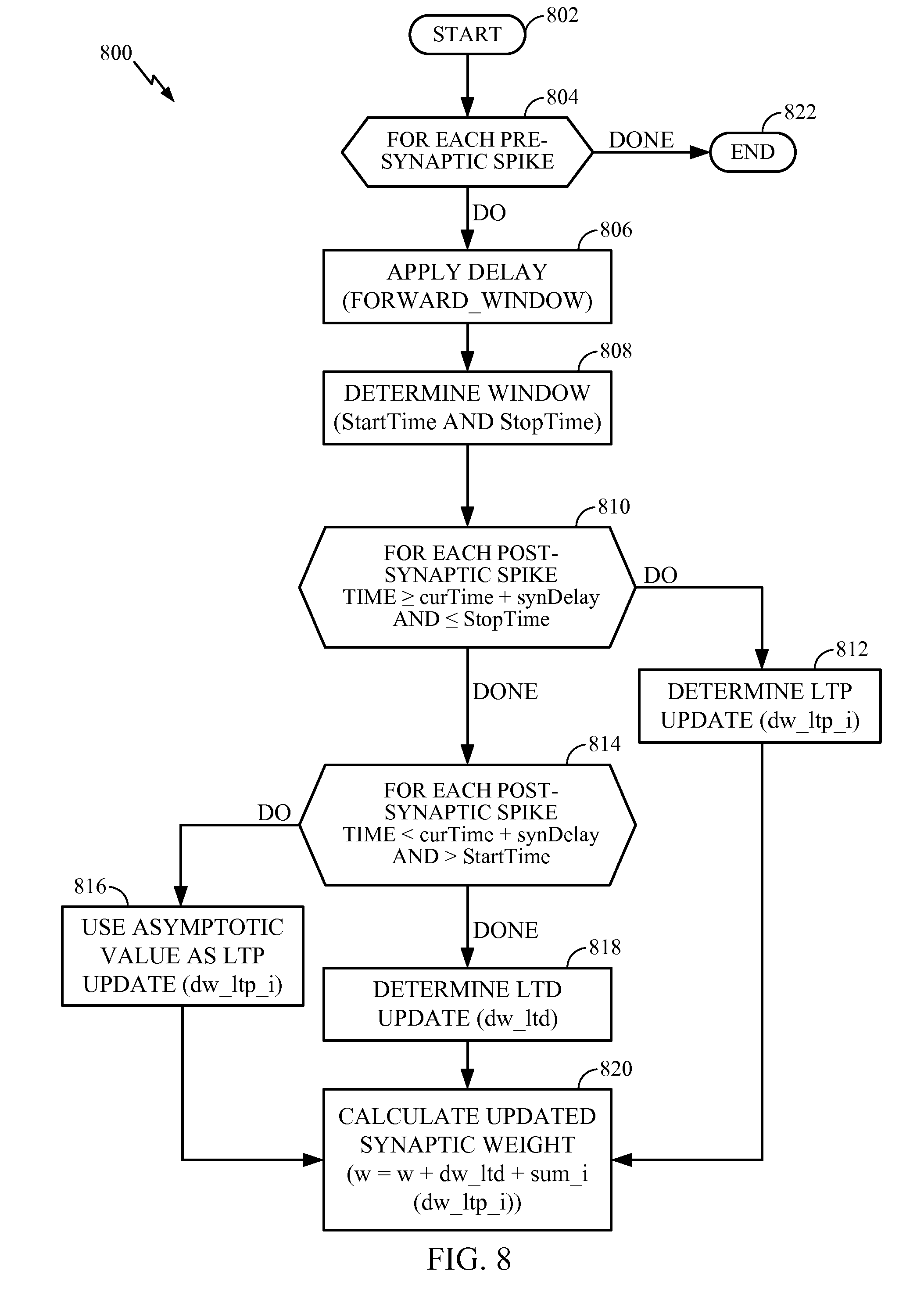 record spike times for a first artificial neuron; record spike times for a second artificial neuron coupled to the first artificial neuron via a synapse, wherein recording the spike times for the second artificial neuron comprises keeping up to a predetermined number of the spike times for the second artificial neuron; process spikes for the second artificial neuron according to a window based at least in part on the spike times for the first artificial neuron; and update a parameter of the synapse based on the processing.