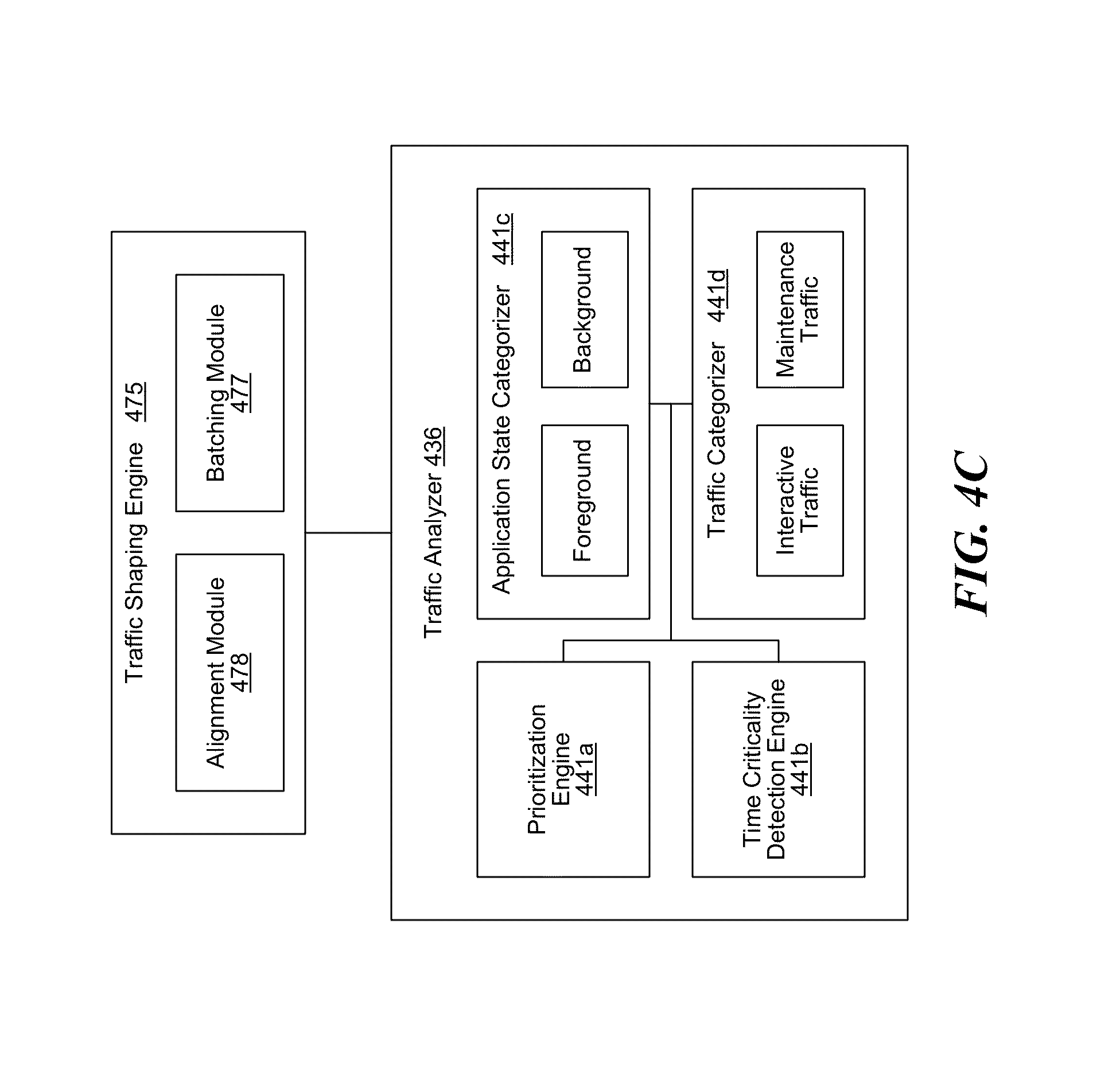 FIG. 4C depicts a block diagram illustrating examples of additional components in certain embodiments in a proxy server 125 shown in the example of FIG. 4A which is further capable of performing mobile traffic categorization and policy implementation based on application behavior and/or traffic priority to enhance mobile traffic management and resource conservation in a mobile network.