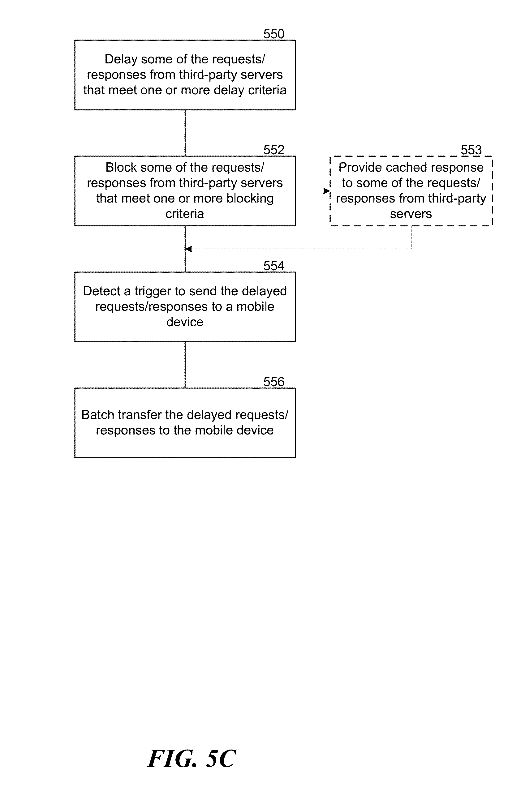 FIG. 5C illustrates a logic flow diagram of an example method for batch transferring delayed requests/responses from the network-side proxy 114 to a mobile device 250. At block 550, the network-side proxy 114 delays requests and/or responses from third-party servers that meet one or more delay criteria, which can include device state, application state, user behavior, time of day, day of the week, application type, category of the requests and/or responses, network settings (e.g., inactivity timer expiry), and the like. In some embodiments, the delay criteria can be specified by traffic management policies. At block 552, the network-side proxy 114 can block some of the requests and/or responses from the third-party servers that meet one or more blocking criteria. At block 553, the network-side proxy 114 can provide cached responses to some of the requests from the third-party servers. At block 554, the network-side proxy 114 detects a trigger to send the delayed requests/responses to a mobile device. The trigger can include, for example, a change in the radio state of the mobile device (e.g., radio state promotion to active or high power state), screen of the mobile device turning on, detecting of user interaction, receiving of a request/response having high priority, size of the aggregated delayed requests, and the like. At block 556, the network-side proxy 114 initiates a batch transfer of the delayed requests and/or responses to the mobile device. In some embodiments, the network-side proxy can signal the mobile device to turn on the radio or up the power of the radio to allow batch transfer of some or all of the delayed requests and/or responses from the network-side proxy 114 to the mobile device.