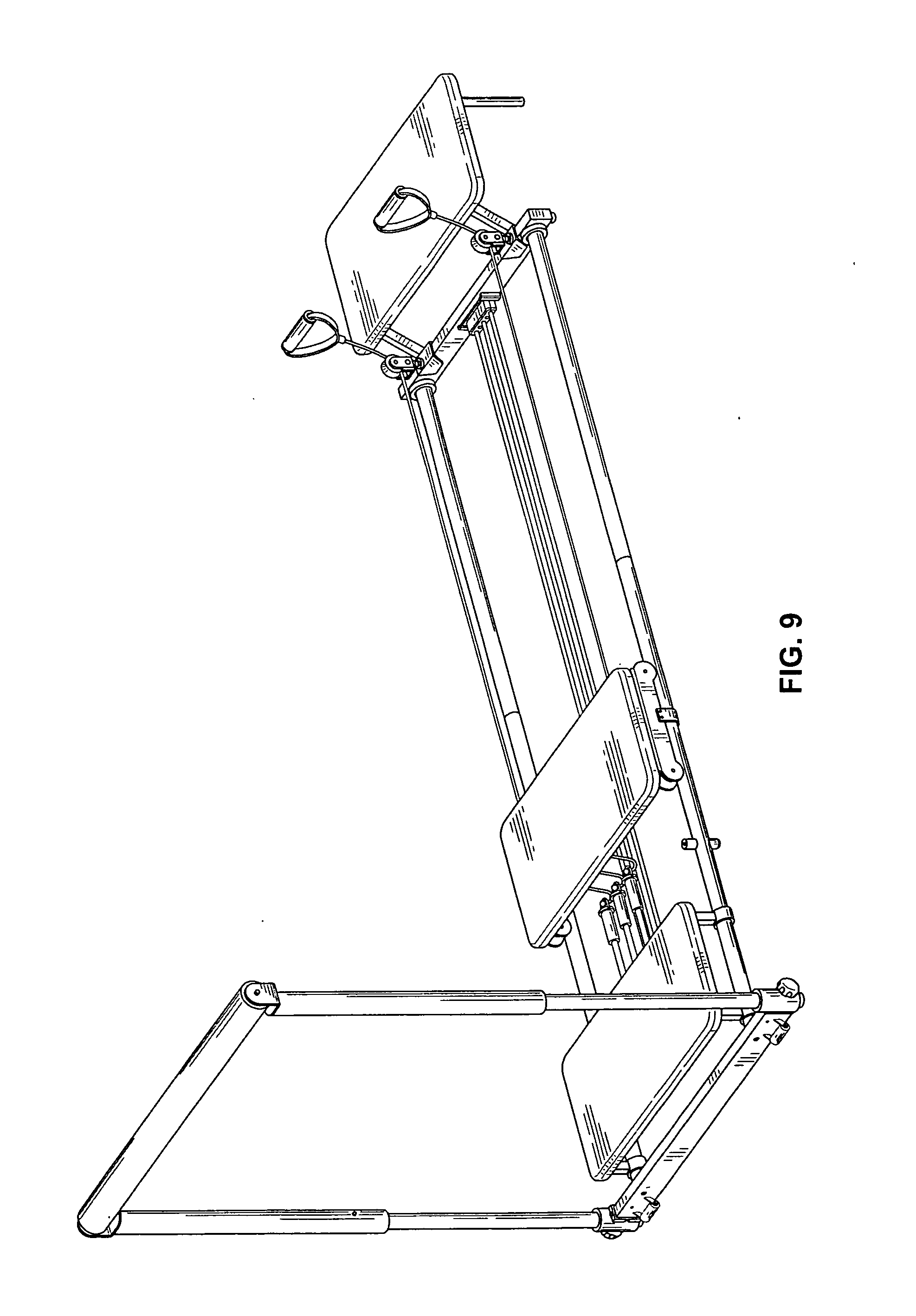 The carriage 21 has a flat top portion that includes the carriage frame pad. Flat top portion of the carriage frame pad provides sufficient space for a user to stand, sit or kneel. The rear platform 41 has a flat top portion that includes a padded top as well. Similarly, the extension platform 95 also has a flat top portion. The usage of the present invention reformer relies on a user engaging the carriage, the rear platform and the extension platform with feet such that the user has a stance on the reformer. The cable handles 79 that are attached to the cable 76 are preferably pulled with the hands, but can also be engaged with feet or toes. The present invention preferably has three platforms including a carriage platform, a rear platform and an extension platform.