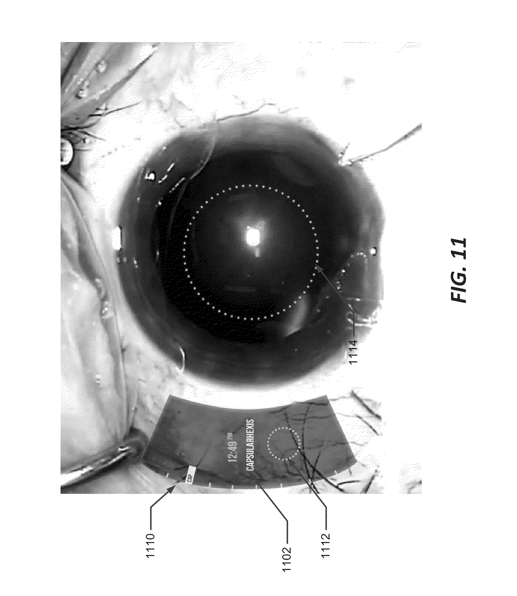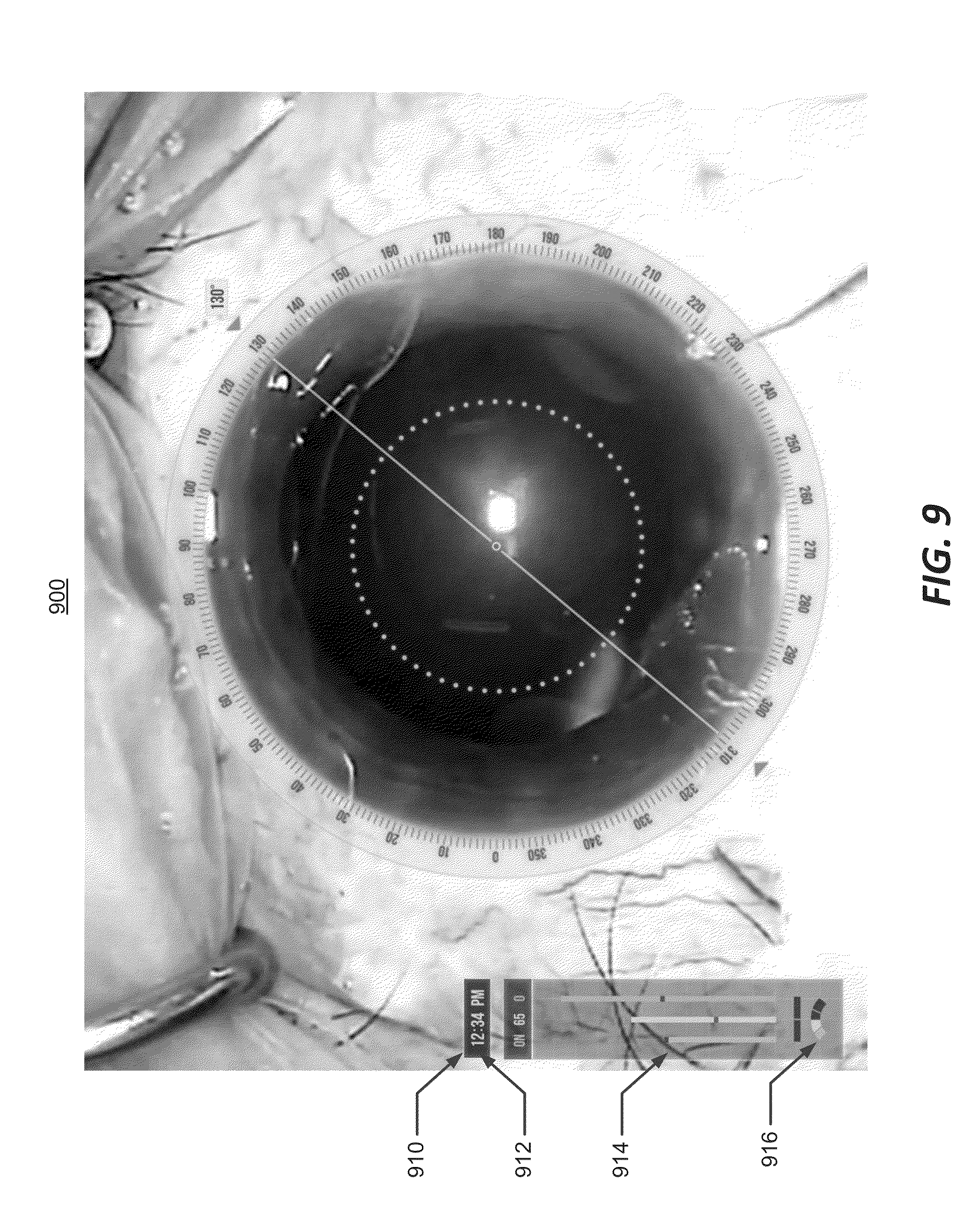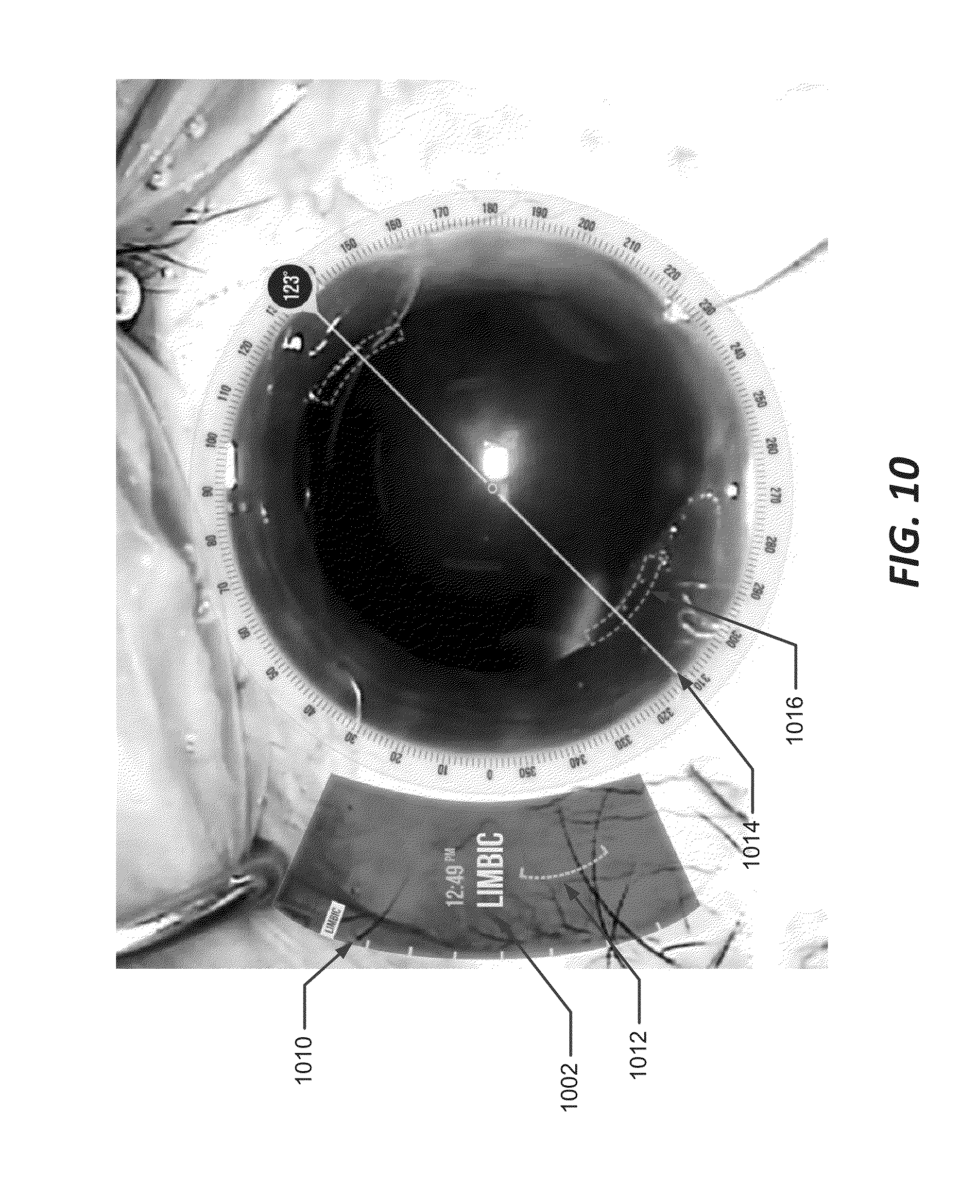 In FIG. 18B, system 10 identifies a desired anatomical structure based on the marks during the surgical procedure. In an embodiment, system 10 identifies an orientation of a cornea or a limbus of the patient's eye, based on the marks, and defines a circular coordinate system based on the identified anatomical feature and the coordinate indications associated with the marks. System 10 may display a circular protractor 1806 similar to that of FIG. 7 representing the circular coordinate system.
