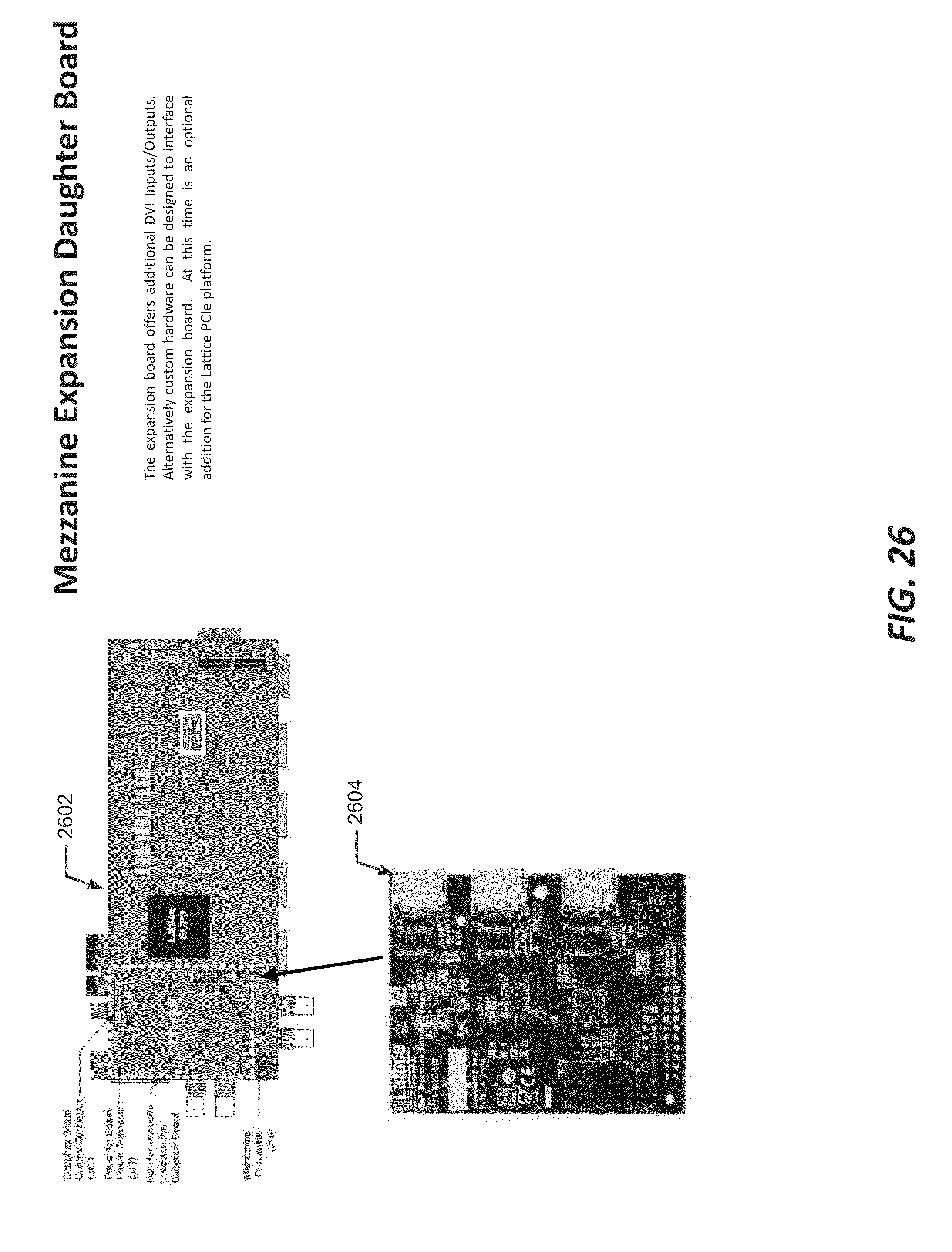 FIG. 26 illustrates an embodiment of a mezzanine expansion card for providing additional DVI inputs and outputs in the Lattice Video Protocol PCIe Board of processing unit 4 described above. In this embodiment, processing unit 4 may include a Lattice Video Protocol PCIe Board 2602 similar to that described above to process video data from image source 3 and generate the overlaid images for the display device. Lattice Video Protocol PCIe Board 2602 may include a Mezzanine Expansion Daughter Board 2604 to provide the additional inputs and outputs for further functional expansion. Mezzanine Expansion Daughter Board 2604 may be coupled to Lattice Video Protocol PCIe Board 2602 through a daughter board control connector (e.g., a J47 connector), a daughter board power connector (e.g., a J17 connector), and a mezzanine connector (e.g., a J19 connector). Lattice Video Protocol PCIe Board 2602 may further include one or more holes to secure Mezzanine Expansion Daughter Board 2604 thereon.