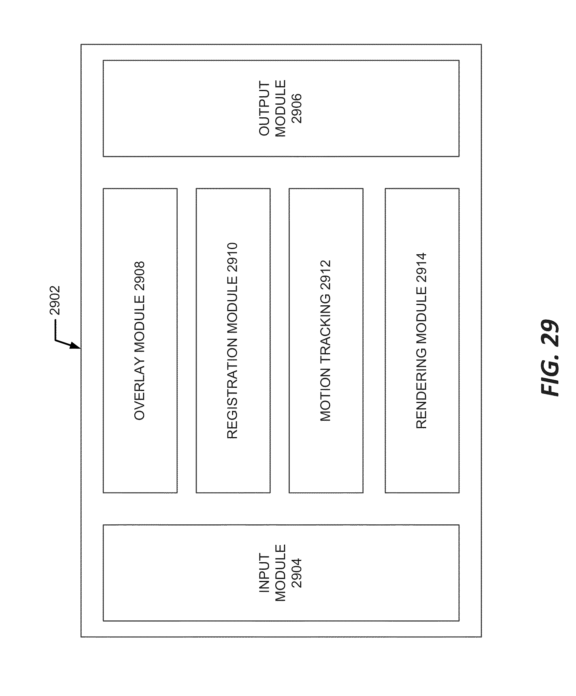 FIG. 29 is a block diagram of a software program 2902 implemented on processing unit 4 for assisting a surgeon in a surgical procedure, according to an embodiment. Program 2902 may be stored in non-transitory computer-readable media in or coupled to processing unit 4 in the form of computer instructions to be executed by processing unit 4 for carrying out the image processing techniques disclosed herein. Program 2902 includes an input module 2904, an output module 2906, an overlay module 2908, a registration module 2910, a motion tracking module 2912, and a rendering module 2914.
