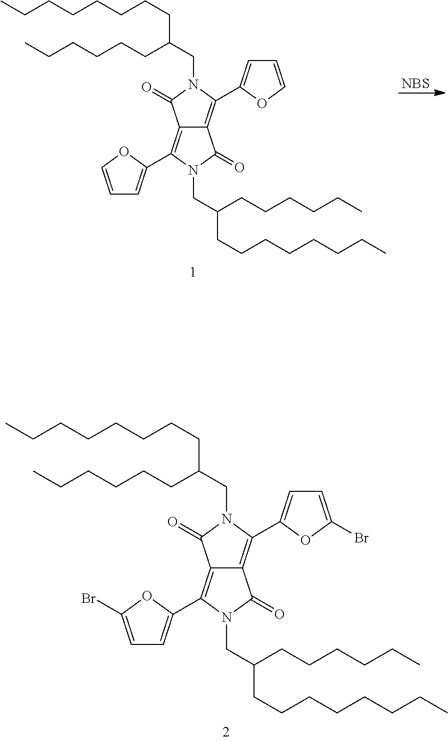 The synthesis of the compounds of formula Br-A-Br is described in WO08/000664, and WO09/047104, or can be done in analogy to the methods described therein. The synthesis of N-aryl substituted compounds of formula Br-A-Br can be done in analogy to the methods described in U.S. Pat. No. 5,354,869 and WO03/022848. Halogen is fluorine, chlorine, bromine and iodine. C1-C25alkyl (C1-C18alkyl) is typically linear or branched, where possible. Examples are methyl, ethyl, n-propyl, isopropyl, n-butyl, sec.-butyl, isobutyl, tert.-butyl, n-pentyl, 2-pentyl, 3-pentyl, 2,2-dimethylpropyl, 1,1,3,3-tetramethylpentyl, n-hexyl, 1-methylhexyl, 1,1,3,3,5,5-hexamethylhexyl, n-heptyl, isoheptyl, 1,1,3,3-tetramethylbutyl, 1-methylheptyl, 3-methylheptyl, n-octyl, 1,1,3,3-tetramethylbutyl and 2-ethylhexyl, n-nonyl, decyl, undecyl, dodecyl, tridecyl, tetradecyl, pentadecyl, hexadecyl, heptadecyl, octadecyl, eicosyl, heneicosyl, docosyl, tetracosyl or pentacosyl. C1-C8alkyl is typically methyl, ethyl, n-propyl, isopropyl, n-butyl, sec.-butyl, isobutyl, tert.-butyl, n-pentyl, 2-pentyl, 3-pentyl, 2,2-dimethyl-propyl, n-hexyl, n-heptyl, n-octyl, 1,1,3,3-tetrannethylbutyl and 2-ethylhexyl. C1-C4alkyl is typically methyl, ethyl, n-propyl, isopropyl, n-butyl, sec.-butyl, isobutyl, tert.-butyl. C2-C18alkenyl groups are straight-chain or branched alkenyl groups, such as e.g. vinyl, allyl, methallyl, isopropenyl, 2-butenyl, 3-butenyl, isobutenyl, n-penta-2,4-dienyl, 3-methyl-but-2-enyl, n-oct-2-enyl, n-dodec-2-enyl, isododecenyl, n-dodec-2-enyl or n-octadec-4-enyl. C2-18alkynyl is straight-chain or branched and preferably C2-8alkynyl, which may be unsubstituted or substituted, such as, for example, ethynyl, 1-propyn-3-yl, 1-butyn-4-yl, 1-pentyn-5-yl, 2-methyl-3-butyn-2-yl, 1,4-pentadiyn-3-yl, 1,3-pentadiyn-5-yl, 1-hexyn-6-yl, cis-3-methyl-2-penten-4-yn-1-yl, trans-3-methyl-2-penten-4-yn-1-yl, 1,3-hexadiyn-5-yl, 1-octyn-8-yl, 1-nonyn-9-yl, 1-decyn-10-yl, or 1-tetracosyn-24-yl. C1-C25alkoxy groups (C1-C18alkoxy groups) are straight-chain or branched alkoxy groups, e.g. methoxy, ethoxy, n-propoxy, isopropoxy, n-butoxy, sec-butoxy, tert-butoxy, amyloxy, isoamyloxy or tert-amyloxy, heptyloxy, octyloxy, isooctyloxy, nonyloxy, decyloxy, undecyloxy, dodecyloxy, tetradecyloxy, pentadecyloxy, hexadecyloxy, heptadecyloxy and octadecyloxy. Examples of C1-C8alkoxy are methoxy, ethoxy, n-propoxy, isopropoxy, n-butoxy, sec.-butoxy, isobutoxy, tert.-butoxy, n-pentoxy, 2-pentoxy, 3-pentoxy, 2,2-dimethylpropoxy, n-hexoxy, n-heptoxy, n-octoxy, 1,1,3,3-tetramethylbutoxy and 2-ethylhexoxy, preferably C1-C4alkoxy such as typically methoxy, ethoxy, n-propoxy, isopropoxy, n-butoxy, sec.-butoxy, isobutoxy, tert.-butoxy. The term “alkylthio group” means the same groups as the alkoxy groups, except that the oxygen atom of the ether linkage is replaced by a sulfur atom. C1-C18perfluoroalkyl, especially C1-C4perfluoroalkyl, is a branched or unbranched radical such as for example —CF3, —CF2CF3, —CF2CF2CF3, —CF(CF3)2, —(CF2)3CF3, and —C(CF3)3. The term “carbamoyl group” is typically a C1-18carbamoyl radical, preferably C1-8carbamoyl radical, which may be unsubstituted or substituted, such as, for example, carbamoyl, methylcarbamoyl, ethylcarbamoyl, n-butylcarbamoyl, tert-butylcarbamoyl, dimethylcarbamoyloxy, morpholinocarbamoyl or pyrrolidinocarbamoyl. C5-C12cycloalkyl is typically cyclopentyl, cyclohexyl, cycloheptyl, cyclooctyl, cyclononyl, cyclodecyl, cycloundecyl, cyclododecyl, preferably cyclopentyl, cyclohexyl, cycloheptyl, or cyclooctyl, which may be unsubstituted or substituted. The cycloalkyl group, in particular a cyclohexyl group, can be condensed one or two times by phenyl which can be substituted one to three times with C1-C4-alkyl, halogen and cyano. Examples of such condensed cyclohexyl groups are: in particular wherein R151, R152, R153, R154, R155and R156are independently of each other C1-C8-alkyl, C1-C8-alkoxy, halogen and cyano, in particular hydrogen. C6-C24aryl (C6-C18aryl) is typically phenyl, indenyl, azulenyl, naphthyl, biphenyl, as-indacenyl, s-indacenyl, acenaphthylenyl, fluorenyl, phenanthryl, fluoranthenyl, triphenlenyl, chrysenyl, naphthacen, picenyl, perylenyl, pentaphenyl, hexacenyl, pyrenyl, or anthracenyl, preferably phenyl, 1-naphthyl, 2-naphthyl, 4-biphenyl, 9-phenanthryl, 2- or 9-fluorenyl, 3- or 4-biphenyl, which may be unsubstituted or substituted. Examples of C6-C12aryl are phenyl, 1-naphthyl, 2-naphthyl, 3- or 4-biphenyl, 2- or 9-fluorenyl or 9-phenanthryl, which may be unsubstituted or substituted. C7-C25aralkyl is typically benzyl, 2-benzyl-2-propyl, β-phenyl-ethyl, α,α-dimethylbenzyl, ω-phenyl-butyl, ω,ω-dimethyl-ω-phenyl-butyl, ω-phenyl-dodecyl, ω-phenyl-octadecyl, ω-phenyl-eicosyl or ω-phenyl-docosyl, preferably C7-C18aralkyl such as benzyl, 2-benzyl-2-propyl, β-phenyl-ethyl, α,α-dimethylbenzyl, ω-phenyl-butyl, ω,ω-dimethyl-ω-phenyl-butyl, ω-phenyl-dodecyl or ω-phenyl-octadecyl, and particularly preferred C7-C12aralkyl such as benzyl, 2-benzyl-2-propyl, β-phenyl-ethyl, α,α-dimethylbenzyl, ω-phenyl-butyl, or ω,ω-dimethyl-ω-phenyl-butyl, in which both the aliphatic hydrocarbon group and aromatic hydrocarbon group may be unsubstituted or substituted. Preferred examples are benzyl, 2-phenylethyl, 3-phenylpropyl, naphthylethyl, naphthylmethyl, and cumyl. Heteroaryl is typically C2-C20heteroaryl, i.e. a ring with five to seven ring atoms or a condensed ring system, wherein nitrogen, oxygen or sulfur are the possible hetero atoms, and is typically an unsaturated heterocyclic group with five to 30 atoms having at least six conjugated π-electrons such as thienyl, benzo[b]thienyl, dibenzo[b,d]thienyl, thianthrenyl, furyl, furfuryl, 2H-pyranyl, benzofuranyl, isobenzofuranyl, dibenzofuranyl, phenoxythienyl, pyrrolyl, imidazolyl, pyrazolyl, pyridyl, bipyridyl, triazinyl, pyrimidinyl, pyrazinyl, pyridazinyl, indolizinyl, isoindolyl, indolyl, indazolyl, purinyl, quinolizinyl, c