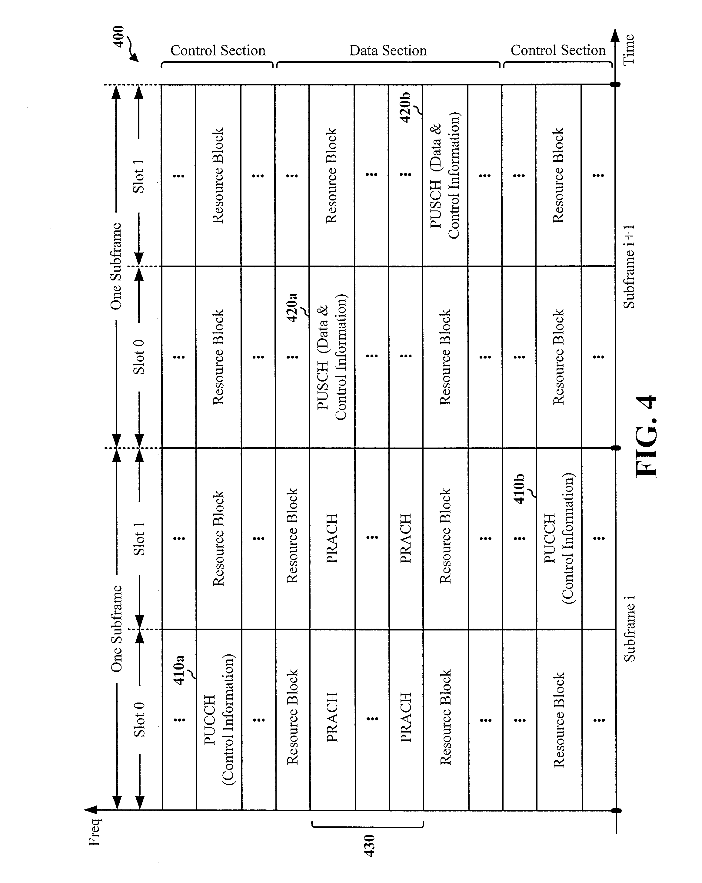 A UE may be assigned resource blocks 410a, 410b in the control section to transmit control information to an eNB. The UE may also be assigned resource blocks 420a, 420b in the data section to transmit data to the eNB. The UE may transmit control information in a physical UL control channel (PUCCH) on the assigned resource blocks in the control section. The UE may transmit only data or both data and control information in a physical UL shared channel (PUSCH) on the assigned resource blocks in the data section. A UL transmission may span both slots of a subframe and may hop across frequency.