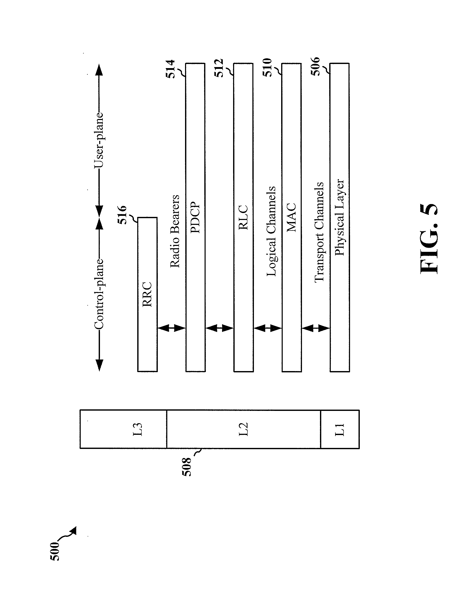 FIG. 5 is a diagram 500 illustrating an example of a radio protocol architecture for the user and control planes in LTE. The radio protocol architecture for the UE and the eNB is shown with three layers: Layer 1, Layer 2, and Layer 3. Layer 1 (L1 layer) is the lowest layer and implements various physical layer signal processing functions. The L1 layer will be referred to herein as the physical layer 506. Layer 2 (L2 layer) 508 is above the physical layer 506 and is responsible for the link between the UE and eNB over the physical layer 506.