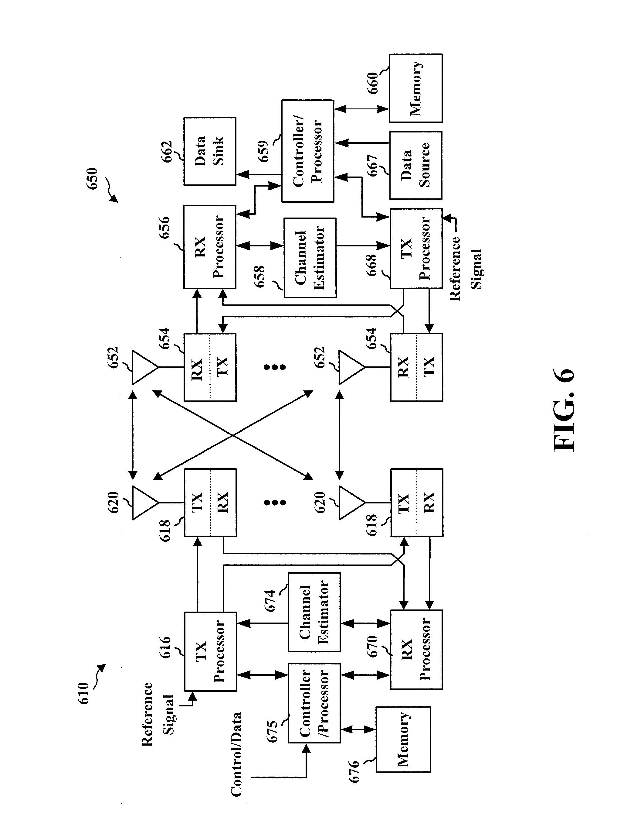 FIG. 6 is a block diagram of an eNB 610 in communication with a UE 650 in an access network. In the DL, upper layer packets from the core network are provided to a controller/processor 675. The controller/processor 675 implements the functionality of the L2 layer. In the DL, the controller/processor 675 provides header compression, ciphering, packet segmentation and reordering, multiplexing between logical and transport channels, and radio resource allocations to the UE 650 based on various priority metrics. The controller/processor 675 is also responsible for HARQ operations, retransmission of lost packets, and signaling to the UE 650.