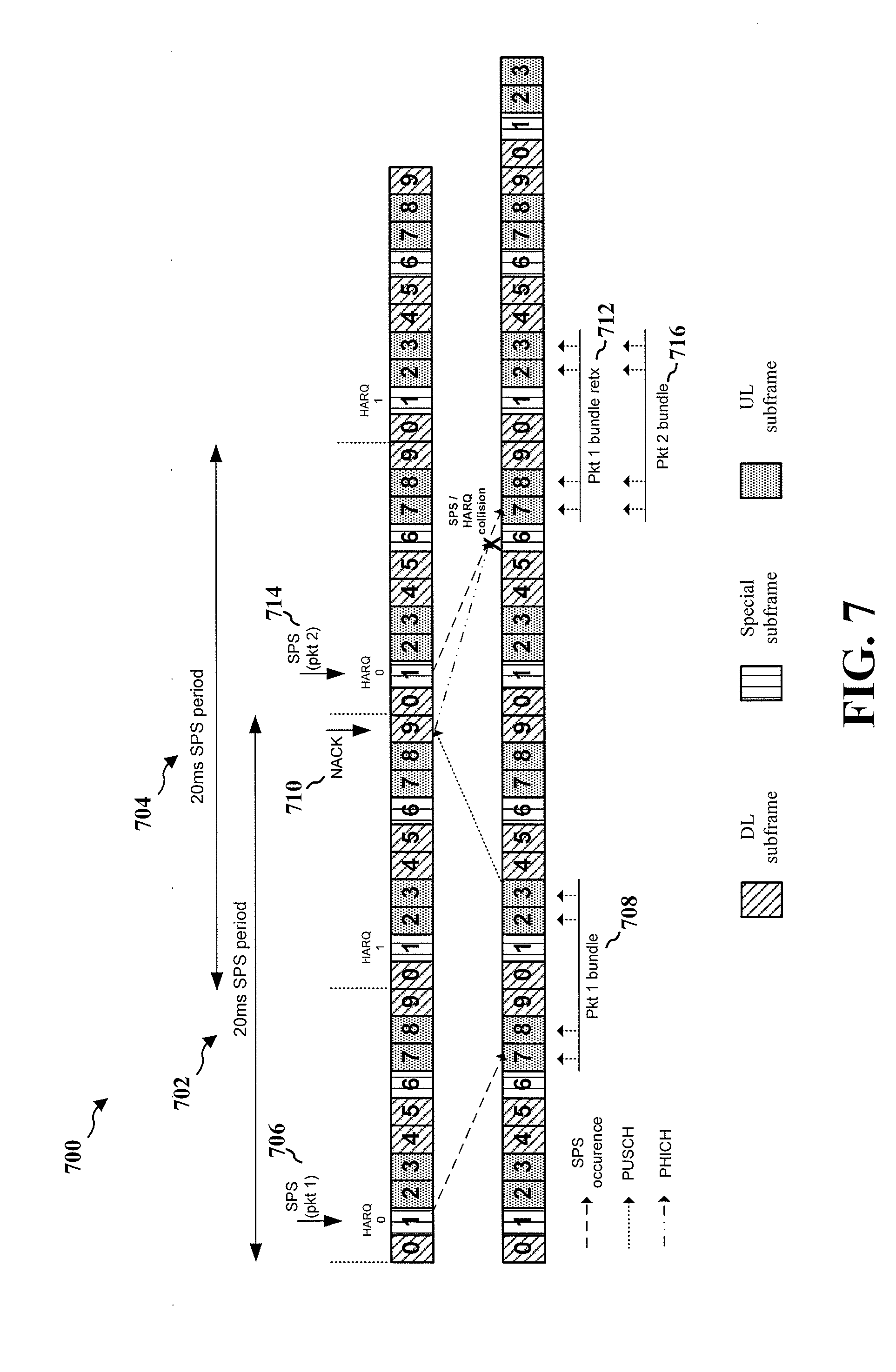 FIG. 7 is a diagram 700 illustrating an example of a joint SPS and TTI-B operation according to a conventional approach. The example of FIG. 7 utilizes uplink-downlink configuration #1, where the example supports TTI-B and two UL HARQ processes (e.g., HARQ 0 and HARQ 1). The SPS period is 20 ms, and an SPS grant occurs every 20 ms in a typical VoIP configuration. Thus, the SPS period for each HARQ process is 20 ms. FIG. 7 illustrates that the SPS period for a HARQ 0 process 702 is 20 ms. The SPS period for a HARQ 1 process 704 is also 20 ms. According to FIG. 7, the UE receives a first SPS grant 706 for a first packet at subframe 1 during the HARQ 0 process, thereby activating SPS grants. The first SPS grant 706 includes information to enable the UE to transmit a TTI-bundled packet of the first packet (a first TTI-bundled packet) 708 at subframes 7, 8, 2, and 3. For example, the first SPS grant 706 may include information about resources such as subframes 7, 8, 2, and 3 that may be used to transmit the first TTI-bundled packet. The UE subsequently receives a response from the eNB indicating whether the first packet is successfully received at the eNB. The response may be an ACK that indicates that the first packet is successfully received or a NACK that indicates that the first packet is not successfully received. In the example illustrated in FIG. 7, the response from the eNB is a NACK response 710 received at subframe 9. The NACK response 710 triggers the UE to perform retransmission of the first TTI-bundled packet 712 at subframes 7, 8, 2, and 3. However, the UE also has a second SPS grant 714 for a second packet during a next HARQ 0 process, based on the first SPS grant 706 received at the UE. The second SPS grant 714 may include information about resources such as subframes 7, 8, 2, and 3 that may be used to transmit a TTI-bundled packet of the second packet (a second TTI-bundled packet) 716. The second SPS grant 714 enables the UE to transmit the second TTI-bundled packet 716 at subframes 7, 8, 2, and 3. As a result, the resources used for the retransmission of the first TTI-bundled packet 712 overlap with the resources used for the transmission of the second TTI-bundled packet 716 associated with the second SPS grant 714, thereby causing collision of the retransmission of the first TTI-bundled packet 712 and the transmission of the second TTI-bundled packet 716.