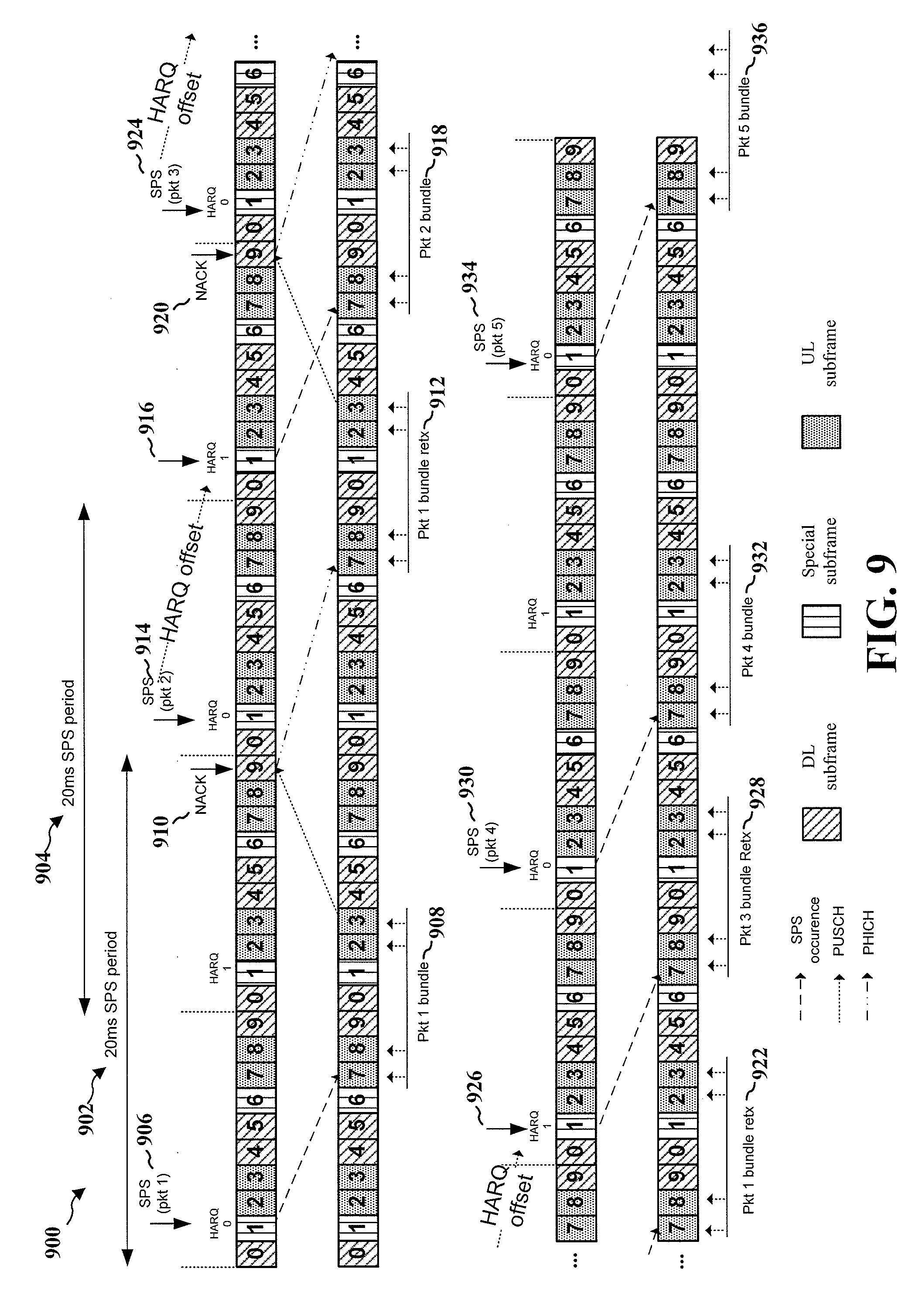 However, if the UE receives a NACK response 920 indicating that the first retransmission of the first TTI-bundled packet 912 is not successfully received at the eNB, then the UE performs a second retransmission of the first TTI-bundled packet 922. Because the UE expects the second retransmission of the first TTI-bundled packet 922 based on the NACK response 920, a third SPS grant 924 received at a HARQ 0 process is offset to an offset location 926 in a next available HARQ process (e.g., a HARQ 1 process) to avoid collision with the second retransmission of the first TTI-bundled packet 922. Because the UE treats the offset location 926 to be the SPS location for the third SPS grant 924, the UE performs the transmission of the third TTI-bundled packet 928 after the second retransmission of the first TTI-bundled packet 922. Then, in the example of FIG. 9, the UE has a fourth SPS grant 930 at a HARQ 0 process to enable transmission of a fourth TTI-bundled packet 932, and subsequently has a fifth SPS grant 934 at a HARQ 0 process to enable transmission of a fifth TTI-bundled packet 936.