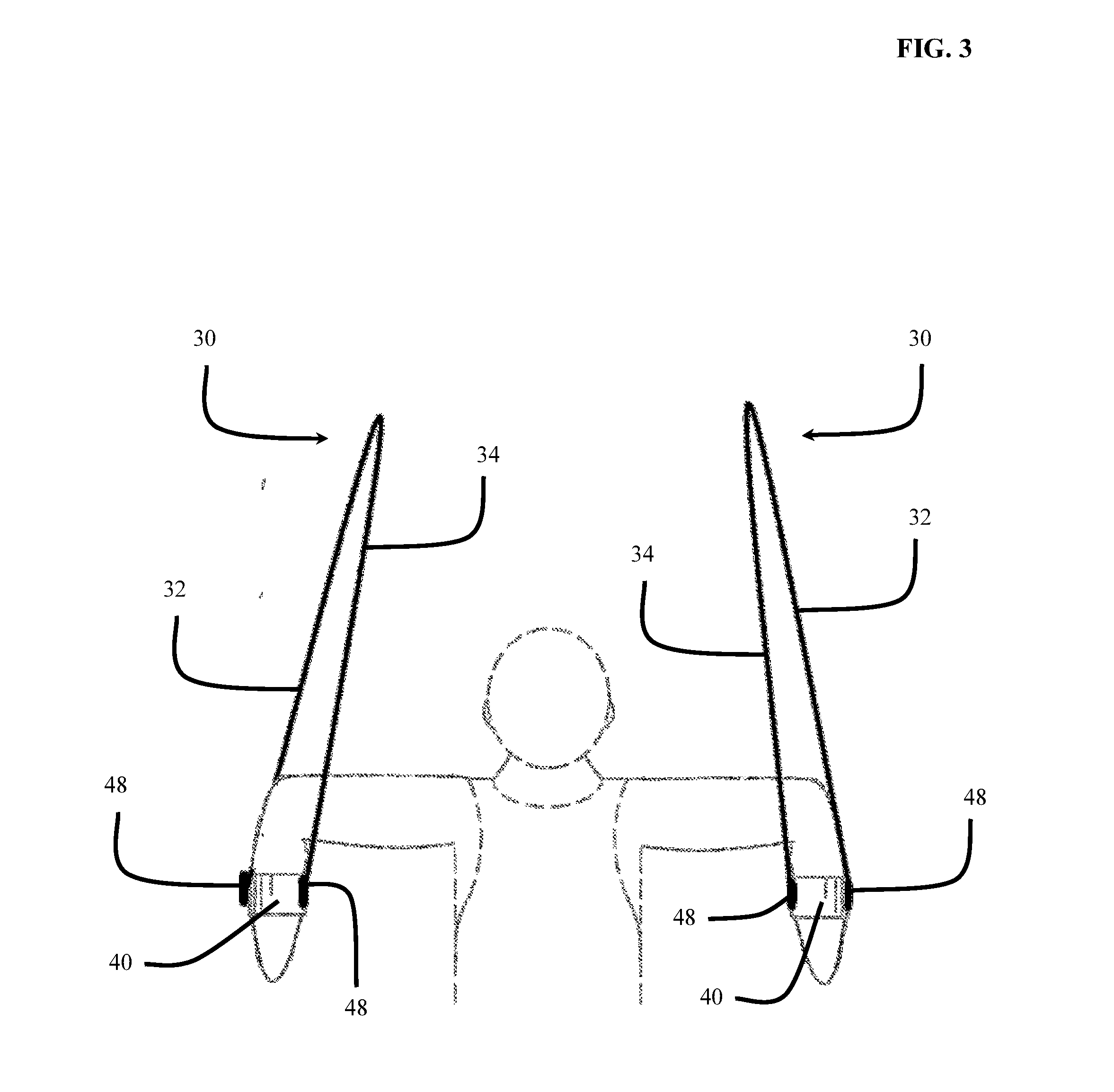 a. a first support assembly configured to circumferentially engage an arm of the user at a first location adjacent to an elbow joint; b. a second support assembly configured to circumferentially engage an arm of the user at a first location adjacent to an elbow joint; c. a first elongated member having a pair of ends separated by a length where said elongated member is a substantially flat strap and, where said pair of ends includes a first end releasably connected to a first side of the first support assembly and a second end releasably connected to a second side of the first support assembly; and d. a second elongated member having a pair of ends separated by a length where said elongated member is a substantially flat strap and, where said pair of ends includes a first end releasably connected to a first side of the second support assembly and a second end releasably connected to a second side of the second support assembly. 2. The exercise device of 3. The exercise device of 4. The exercise device of 5. The exercise device of 6. The exercise device of 7. The exercise device of 8. The exercise device of 9. The exercise device of 10. The exercise device of