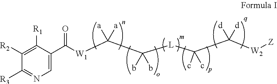 • wherein the representation of L is not limited directionally left to right as as depicted, rather either the left side or the right side of L can be bound to the W1 side of the compound of Formula I;
