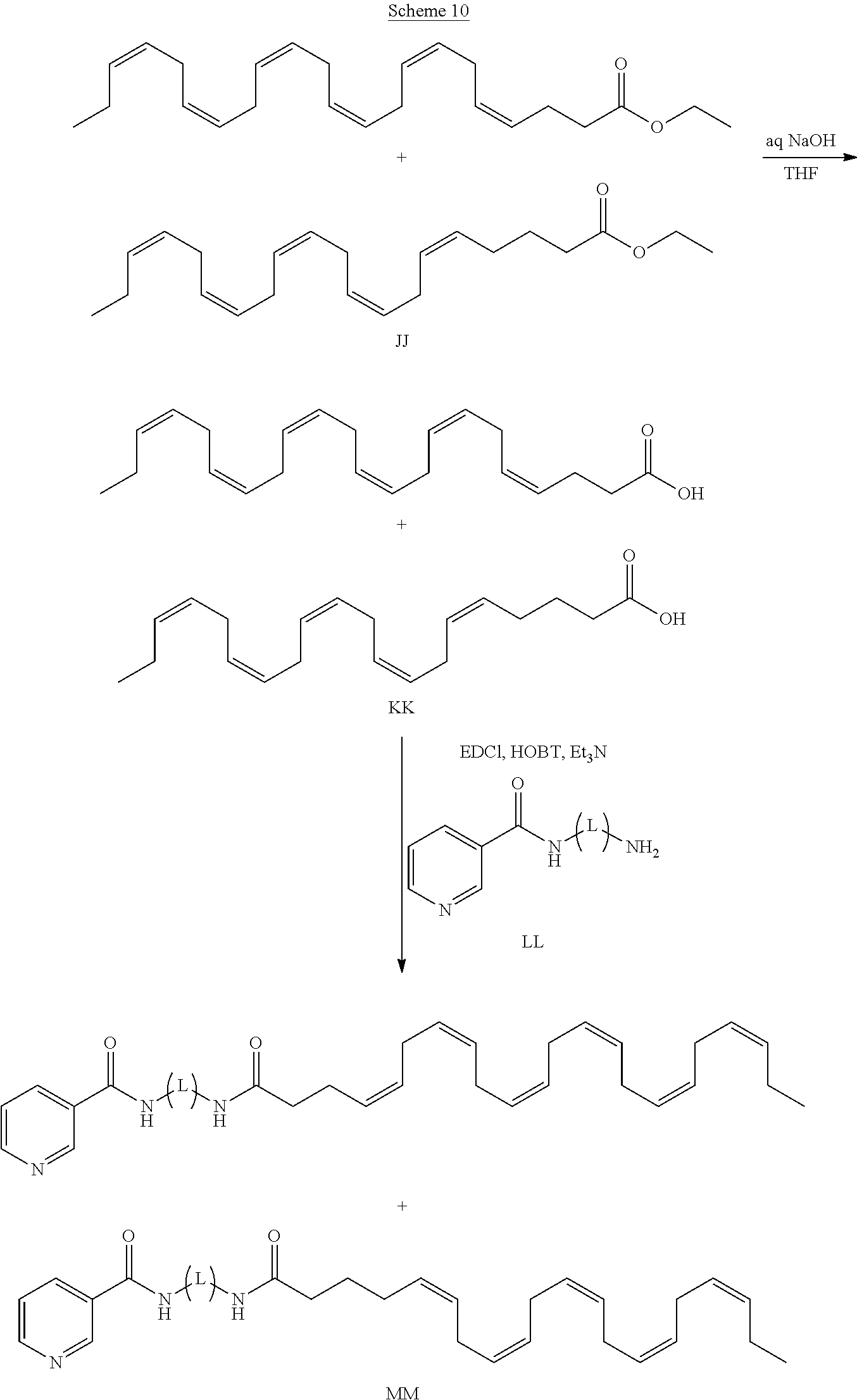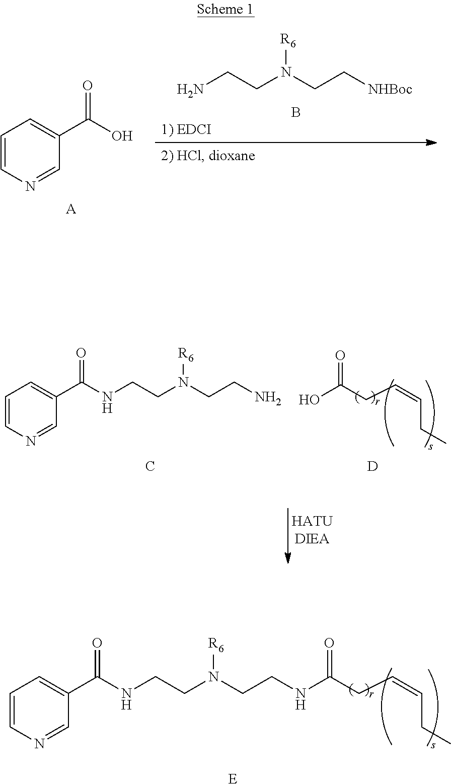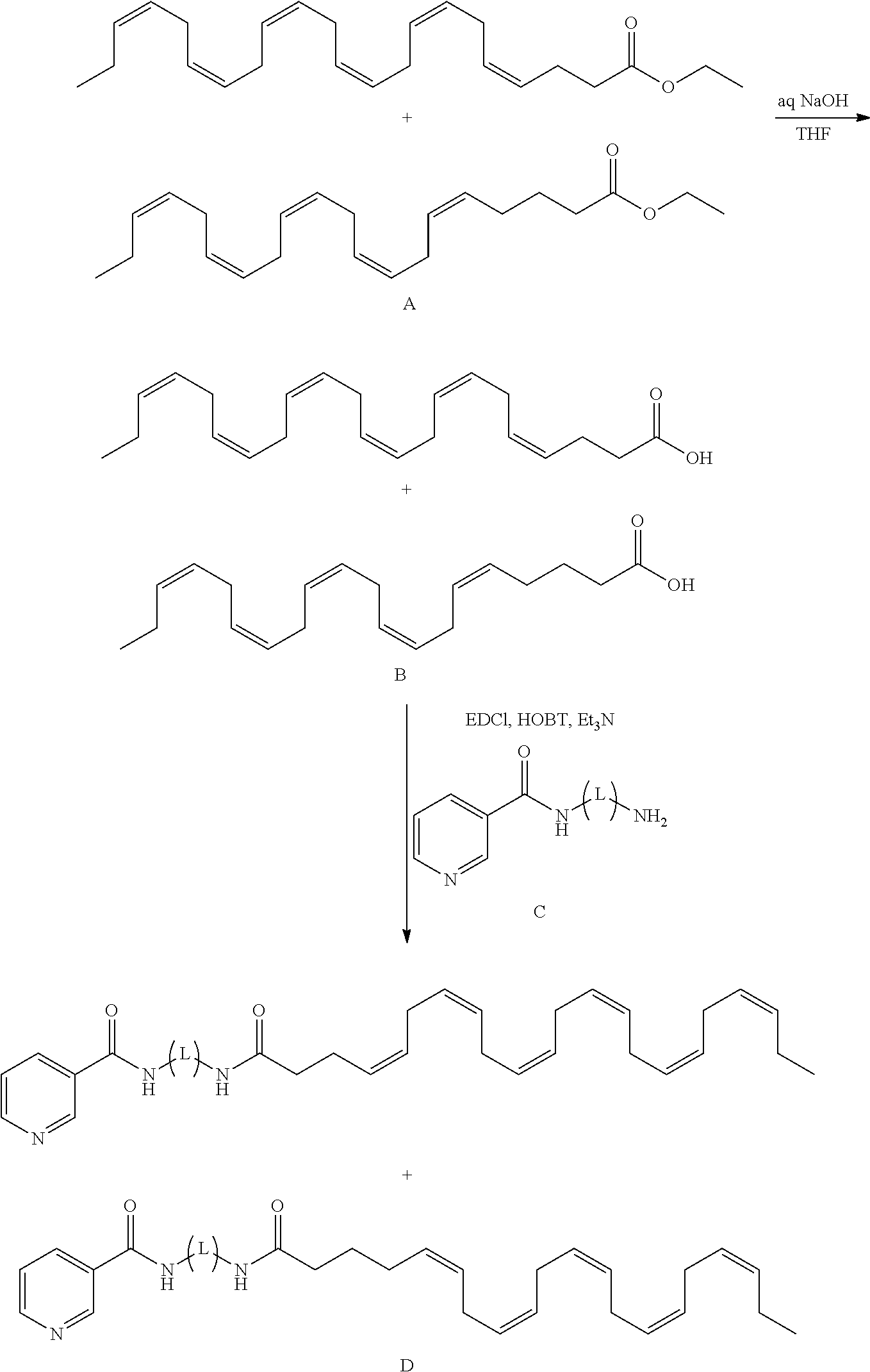 A 1.27:1 mixture of (4Z,7Z,10Z,13Z,16Z,19Z)-ethyl docosa-4,7,10,13,16,19-hexaenoate and (5Z,8Z,11Z,14Z,17Z)-ethyl icosa-5,8,11,14,17-pentaenoate was taken up in 130 mL of THF and 110 mL of a 5 N NaOH solution was added. The resulting reaction mixture was stirred at 50° C. for 4 h. It was then cooled to room temperature and concentrated under reduced pressure. The resulting aqueous mixture was cooled in an ice bath, acidified to pH 2 with 6 N HCl and extracted with EtOAc (3×200 mL). The combined organic layers were washed with water (5×200 mL), brine (300 mL), dried (Na2SO4) and concentrated under reduced pressure to afford 85 g of a 1.27:1 mixture of (4Z,7Z,10Z,13Z,16Z,19Z)-docosa-4,7,10,13,16,19-hexaenoic acid and (5Z,8Z,11Z,14Z,17Z)-eicosa-5,8,11,14,17-pentaenoic acid. The HCl salt of N-(2-aminoethyl)nicotinamide was prepared according to the procedure outlined in US 20110053990. This material (9.4 g, 39.66 mmol) was taken up in 150 mL of CH2Cl2 along with 10 g of the 1.27:1 mixture of (4Z,7Z,10Z,13Z,16Z,19Z)-docosa-4,7,10,13,16,19-hexaenoic acid and (5Z,8Z,11Z,14Z,17Z)-eicosa-5,8,11,14,17-pentaenoic acid, EDC (7.0 g, 36.4 mmol), HOBT (4.9 g, 36.4 mmol) and Et3N (14 mL, 99.3 mmol). The resulting reaction mixture was stirred at room temperature for 18 h. It was then washed with saturated NH4Cl (150 mL), brine (150 mL), dried (Na2SO4) and concentrated under reduced pressure. The resulting product was purified by silica gel chromatography (95% CH2Cl2, 5% MeOH) to afford 13.2 g of the 1.27:1 mixture of N-(2-((4Z,7Z,10Z,13Z,16Z,19Z)-docosa-4,7,10,13,16,19-hexaenamido)ethyl)nicotinamide and N-(2-((5Z,8Z,11Z,14Z,17Z)-icosa-5,8,11,14,17-pentaenamido)ethyl)nicotinamide. MS (ES+) calculated for C30H4N3O2 and C28H39N3O2: 475.32 and 449.30 respectively; found 476 and 450 respectively.
