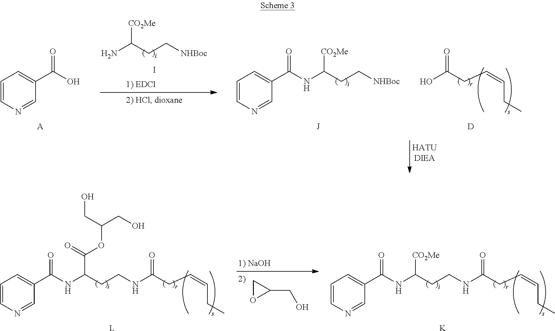 (S)-methyl 2-((5Z,8Z,11Z,14Z,17Z)-eicosa-5,8,11,14,17-pentaenamido)-6-(nicotinamido)hexanoate (140 mg, 0.225 mmol) was taken up in 2 mL of THF along with an aqueous solution of NaOH (35 mg in 2 mL of H2O). The resulting reaction mixture was stirred at room temperature for 2 h. It was then acidified to pH 4 with 2 N HCl and then extracted with EtOAc. The combined organic layers were dried (Na2SO4) and concentrated under reduced pressure to afford 31 mg of (S)-2-((5Z,8Z,11Z,14Z,17Z)-eicosa-5,8,11,14,17-pentaenamido)-6-(nicotinamido)hexanoic acid. MS calculated for C34H47N3O4: 561.36; found: [M+H]+562. MS calculated for C32H45N3O4: 535.34; found: [M+H]+536.