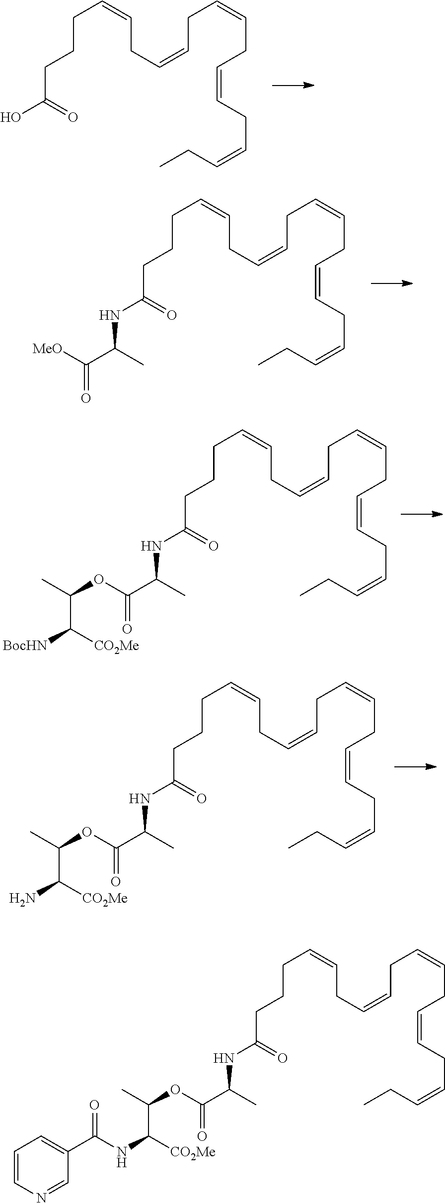 (2S,3R)-methyl 2-(tert-butoxycarbonyl)-3-((S)-2-((4Z,7Z,10Z,13Z,16Z,19Z)-docosa-4,7,10,13,16,19-hexaenamido)propanoyloxy)butanoate (300 mg, 0.488 mmol) was taken up in 4M HCl in dioxane (2 mL) and allowed to stand at room temperature for 10 min. The reaction mixture was then diluted with EtOAc and concentrated under reduced pressure to afford the HCl salt of (2S,3R)-methyl 2-amino-3-((S)-2-((4Z,7Z,10Z,13Z,16Z,19Z)-docosa-4,7,10,13,16,19-hexaenamido)propanoyloxy)butanoate. This material was taken up in CH3CN (5 mL) along with nicotinic acid (60 mg, 0.488 mmol), HATU (204 mg, 0.54 mmol) and DIEA (0.25 mL, 1.46 mmol). The resulting reaction mixture was stirred at room temperature for 1 h and concentrated under reduced pressure. The resulting oily residue was purified by silica gel chromatography (9:1 CH2Cl2/MeOH) to afford (2S,3R)-methyl 3-((S)-2-((4Z,7Z,10Z,13Z,16Z,19Z)-docosa-4,7,10,13,16,19-hexaenamido)propanoyloxy)-2-(nicotinamido)butanoate (120 mg, 40%). MS calculated for C36H49N3O6: 619.36; found: [M+H]+620.