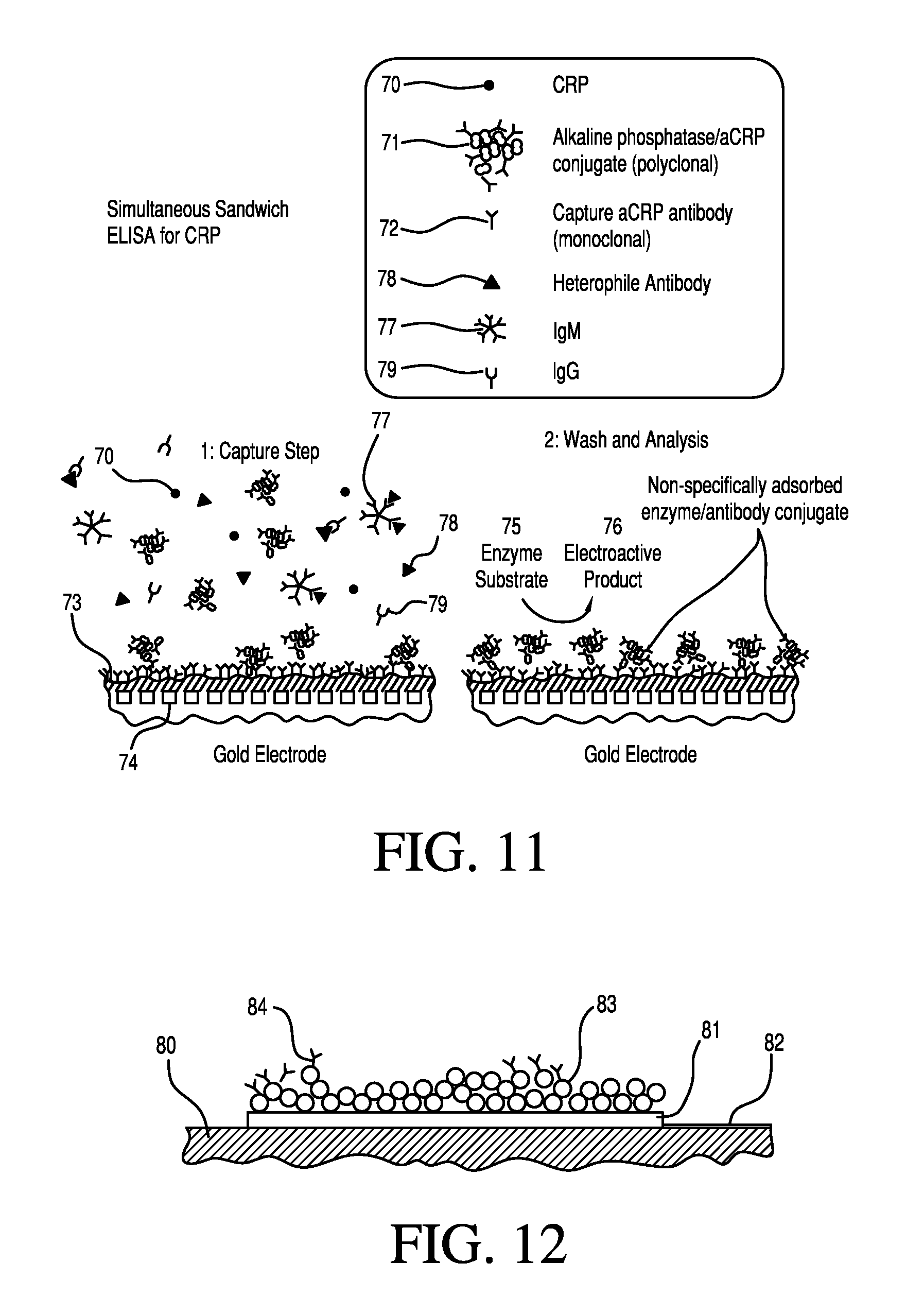 The present application is a divisional application of U.S. patent application Ser. No. 13/308,935, filed Dec. 1, 2011, and claims priority to U.S. Provisional Application No. 61/419,485, filed Dec. 3, 2010, the entireties of which are incorporated herein by reference. The present invention generally relates to devices and methods for rapid determination of analytes in liquid samples by various assay techniques including immunoassays incorporating a sample dilution feature, which preferably is suitable for low range sample dilution. The apparatus preferably is capable of being used in the point-of-care diagnostic field, including, for example, use at accident sites, emergency rooms, in surgery, in intensive care units, and also in non-medical environments. The invention is also directed to novel sample metering devices for use in such devices and methods. A multitude of laboratory immunoassay tests for analytes of interest are performed on biological samples for diagnosis, screening, disease staging, forensic analysis, pregnancy testing and drug testing, among others. While a few qualitative tests, such as pregnancy tests, have been reduced to simple kits for a patient's home use, the majority of quantitative tests still require the expertise of trained technicians in a laboratory setting using sophisticated instruments. Laboratory testing increases the cost of analysis and delays the patient's receipt of the results. In many circumstances, this delay can be detrimental to the patient's condition or prognosis, such as for example the analysis of markers indicating myocardial infarction and heart failure. In these and similar critical situations, it is advantageous to perform such analyses at the point-of-care, accurately, inexpensively and with minimal delay. Many types of immunoassay devices and processes have been described. For example, a disposable sensing device for measuring analytes by means of immunoassay in blood is disclosed by Davis et al. in U.S. Pat. No. 7,419,821, the entirety of which is incorporated herein by reference. This device employs a reading apparatus and a cartridge that fits into the reading apparatus for the purpose of measuring analyte concentrations. A potential problem with such disposable devices is variability of fluid test parameters from cartridge to cartridge due to manufacturing tolerances or machine wear. U.S. Pat. No. 5,821,399 to Zelin, the entirety of which is incorporated herein by reference, discloses methods to overcome this problem using automatic flow compensation controlled by a reading apparatus having conductimetric sensors located within a cartridge. Electrochemical detection, in which the binding of an analyte directly or indirectly causes a change in the activity of an electroactive species adjacent to an electrode, has also been applied to immunoassays. For an early review of electrochemical immunoassays, see Laurell et al., Methods in Enzymology, vol. 73, “Electroimmunoassay”, Academic Press, New York, 339, 340, 346-348 (1981). In an electrochemical immunosensor, the binding of an analyte to its cognate antibody produces a change in the activity of an electroactive species at an electrode that is poised at a suitable electrochemical potential to cause oxidation or reduction of the electroactive species. There are many arrangements for meeting these conditions. For example, electroactive species may be attached directly to an analyte, or the antibody may be covalently attached to an enzyme that either produces an electroactive species from an electroinactive substrate or destroys an electroactive substrate. See M. J. Green (1987) Philos. Trans. R. Soc. Lond. B. Biol. Sci. 316:135-142, for a review of electrochemical immunosensors. Magnetic components have been integrated with electrochemical immunoassays. See, for example, U.S. Pat. Nos. 4,945,045; 4,978,610; and 5,149,630, each to Forrest et al. Furthermore, jointly-owned U.S. Pat. No. 7,419,821 to Davis et al. (referenced above) and U.S. Pat. Nos. 7,682,833 and 7,723,099 to Miller et al. teach electrochemical immunosensing devices and methods. Microfabrication techniques (e.g., photolithography and plasma deposition) are attractive for construction of multilayered sensor structures in confined spaces. Methods for microfabrication of electrochemical immunosensors, for example on silicon substrates, are disclosed in U.S. Pat. No. 5,200,051 to Cozette et al., the entirety of which is incorporated herein by reference. These include dispensing methods, methods for attaching biological reagent, e.g., antibodies, to surfaces including photoformed layers and microparticle latexes, and methods for performing electrochemical assays. In U.S. Pat. No. 4,946,795, Gibbons et al. disclose a sample dilution cartridge that relies on hydrostatic pressure. Jointly-owned U.S. Pat. No. 6,750,053 to Widrig et al., the entirety of which is incorporated herein by reference, teaches sample metering based on a holding chamber with a capillary stop feature. Notwithstanding the above literature, there remains a need in the art for improved immunosensing devices with a greater range of detection of analytes, including, for example, analytes present at low levels such as cardiac troponin I, and analytes present at high levels, such as CRP. The need also exists for improved devices and methods for metering samples, particularly in point-of-care analyte testing. These and other needs are met by the present invention as will become clear to one of skill in the art to which the invention pertains upon reading the following disclosure. The present invention is directed to immunosensing devices and methods of performing an immunoassay with immunosensors incorporating a sample dilution feature preferably suitable for low range dilution, e.g., dilutions that are less than about 50:1 (v/v diluent:sample), to provide diverse real-time or near real-time analysis of analytes. The invention, in other embodiments, is direct