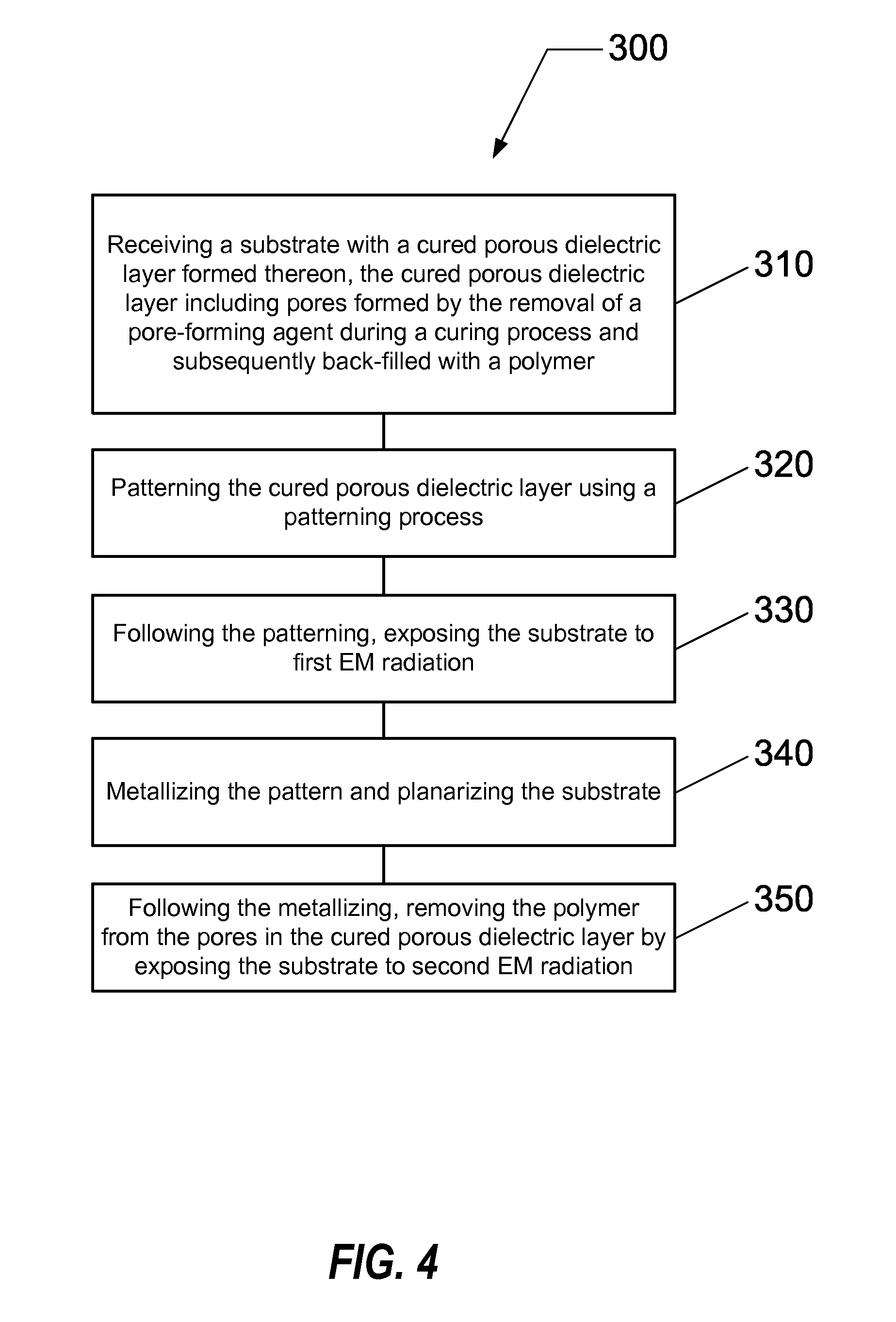 receiving a substrate with a cured porous dielectric layer formed thereon, said cured porous dielectric layer including pores formed by the removal of a pore-forming agent during a curing process and subsequently back-filled with a pore-filling agent, wherein said pores are characterized by an average pore diameter less than 10 nm, and further wherein said pore-filling agent as back-filled within said pores has a thermal decomposition temperature greater than 250 degrees C. and less than 450 degrees C.; patterning said cured porous dielectric layer using a patterning process; following said patterning, exposing said substrate to first EM radiation; metallizing said pattern and planarizing said substrate; and following said metallizing, removing said pore-filling agent from said pores in said cured porous dielectric layer by exposing said substrate to second EM radiation. 20. The method of