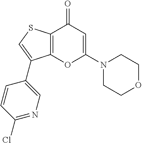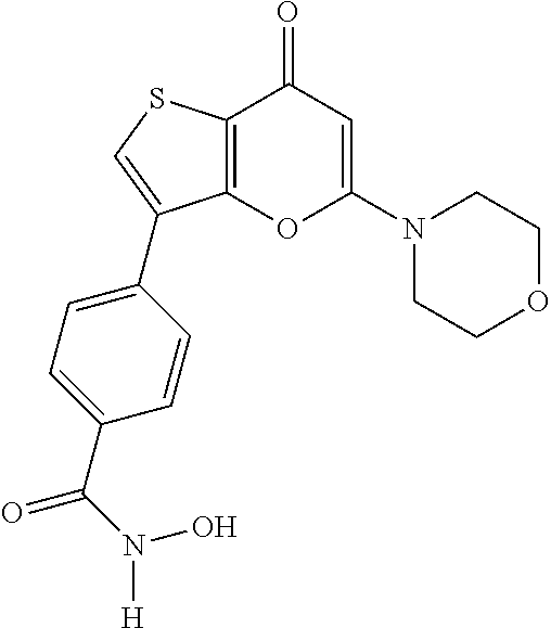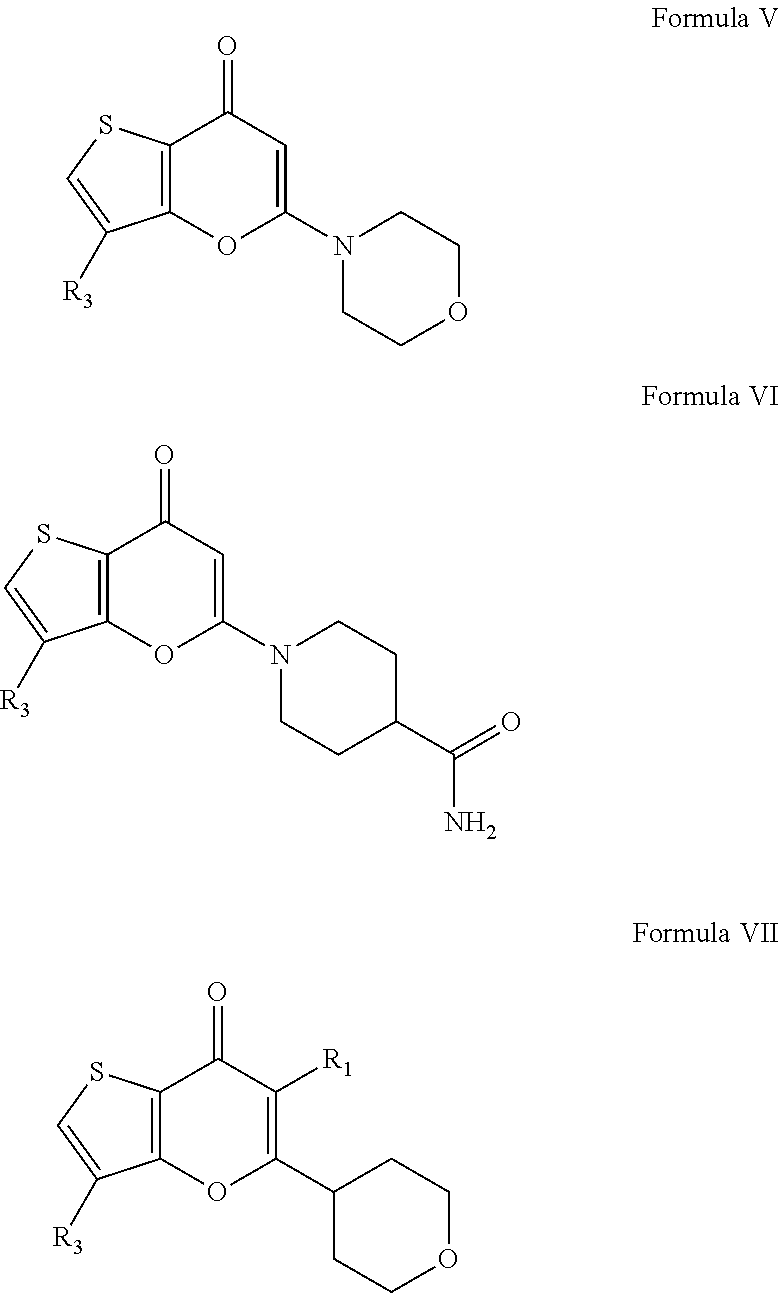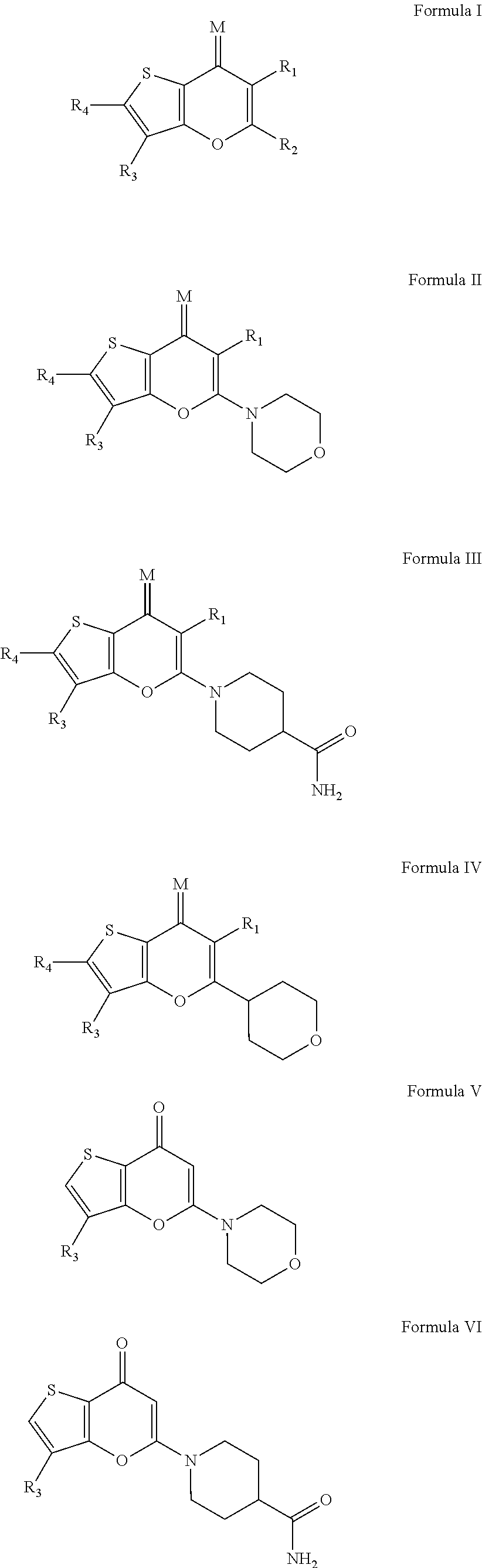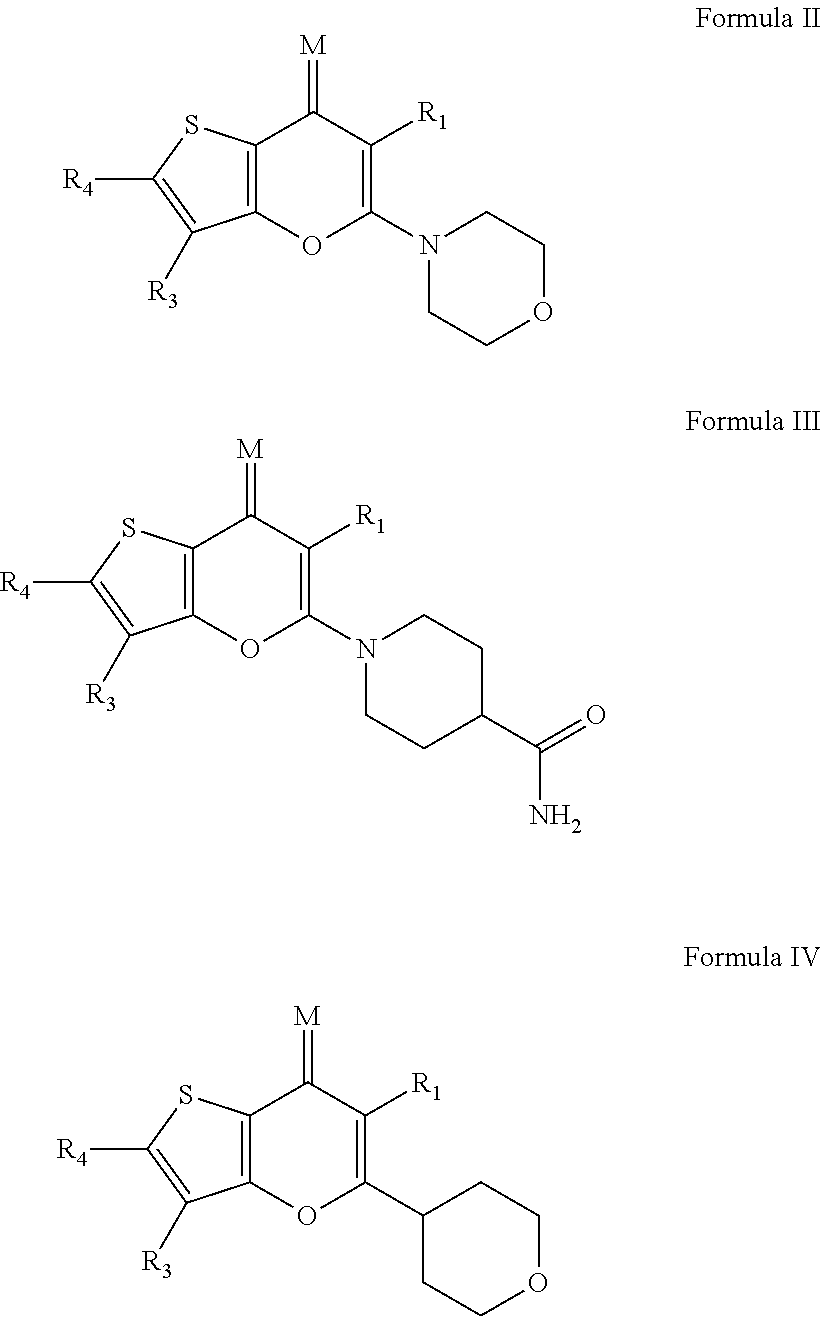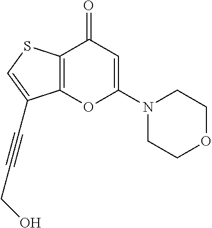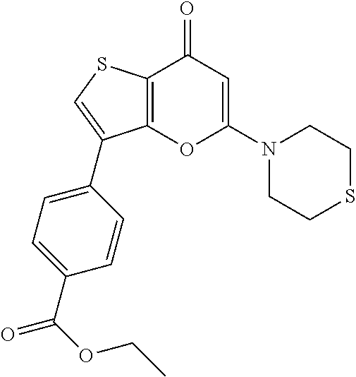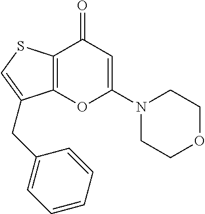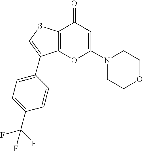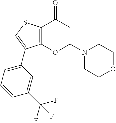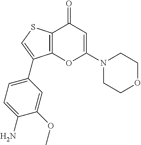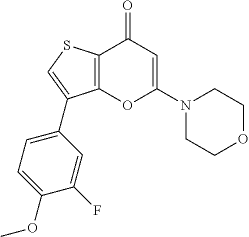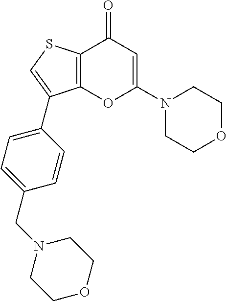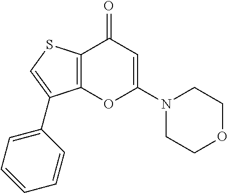 LY294002 (2-(4-morpholinyl)-8-phenyl-4H-1-benzopyran-4-one) is a potent, non-selective inhibitor of PI-3 kinases with an IC50 of 1.4 μM (C. J. Vlahos et al,. J. Biol. Chem. 1994, 269, 5241-5248). While LY294002 is an effective inhibitor of PI-3 kinase it bus several undesirable attributes for clinical use including lack of aqueous solubility, poor pharmacokinetics, unacceptable toxicity, lack of tissue specificity, rapid metabolism in anneals, and a synthetic route that involves the use of carbon disulfide, a highly toxic compound. As such, LY294002 has never been developed for clinical use.