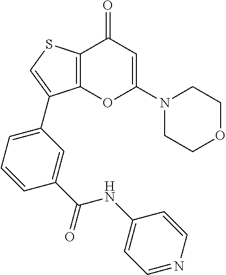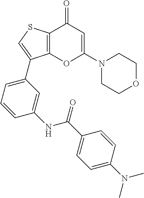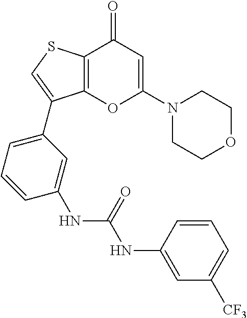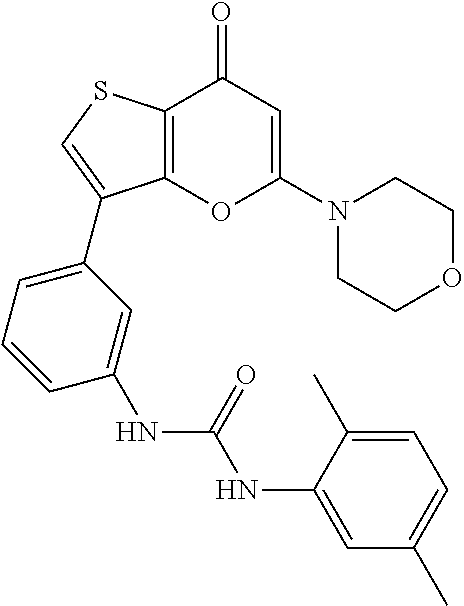 5-Morpholino-3-{m-[3-(2,5-xylyl)ureido]phenyl}-4-oxa-1-thia-7-indenone (compound 137): 3-(3-Amino-phenyl)-5-morpholin-4-yl-thieno[3,2-b]pyran-7-one (compound 11) (71 mg, 0.216 mmol) was dissolved in CH2Cl2 (4 mL) and treated with 2,5-dimethylphenyl isocyanate (32 mg, 0.216 mmol) and the solution was stirred at room temperature overnight. The next day, the solid product teas filtered and triturated with a mixture of CH2Cl2 and MeOH three times. Solids were filtered and dried to yield the final desired compound 137 (26 mg, 25%). HPLC (254 nm)-Rt 4.30 min. MS (ESI) m/z 476.4 [M+H]+. Purity=99% by UV (254 nm). 1HNMR (400 MHz-DMSO-d6) δ 9.14 (s, 1H); 8.20 (s, 1H); 8.16 (s, 1H); 7.90 (s, 1H); 7.71 (s, 1H); 7.41 (t, J=6.0 Hz, 1 H); 7.31 (d, J=6.0 Hz, 1 H); 7.18 (d, J=6.0 Hz, 1H); 7.05 (d, J=6.0 Hz, 1 H); 6.77 (d, J=6.0 Hz, 1 H); 5.53 (s, 1 H); 3.70 (t, J=4.0 Hz, 4 H); 3.49 (t, J=4.0 Hz, 4 H); 2.25 (s, 3 H); 2.20 (s, 3 H).