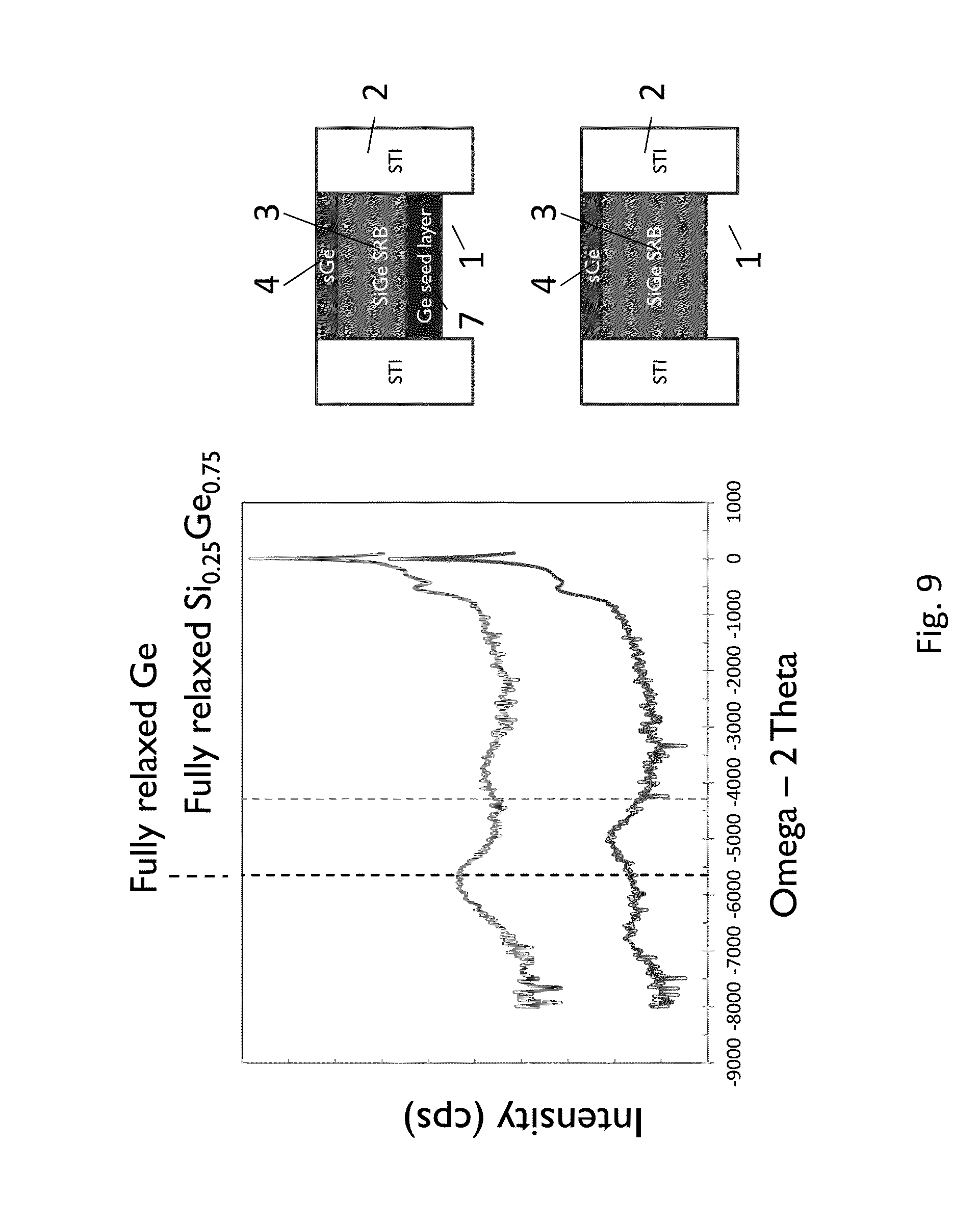 providing trenches in a dielectric layer on the silicon substrate, the trenches including at least a first trench defining an nMOS region and a second trench defining a pMOS region, the trenches extending through the dielectric layer and abutting a surface of the substrate; growing a first seed layer in the first trench on the surface; growing a common strain-relaxed buffer layer in the first trench and in the second trench, the common strain-relaxed buffer layer comprising silicon germanium (SiGe); and growing a common channel layer comprising germanium (Ge) in the first and second trenches and on the common strain-relaxed buffer layer, wherein the properties of the first seed layer and the common strained relaxed buffer layer are predetermined such that the common channel layer is under a tensile strain or is unstrained in the nMOS region and is under a compressive strain in the pMOS region. 2. The method according to 3. The method according to 4. The method according to 5. The method according to 6. The method according to 7. The method according to 8. The method according to 9. The method according to 10. A semiconductor device comprising an nMOS device and a pMOS device, the device comprising: