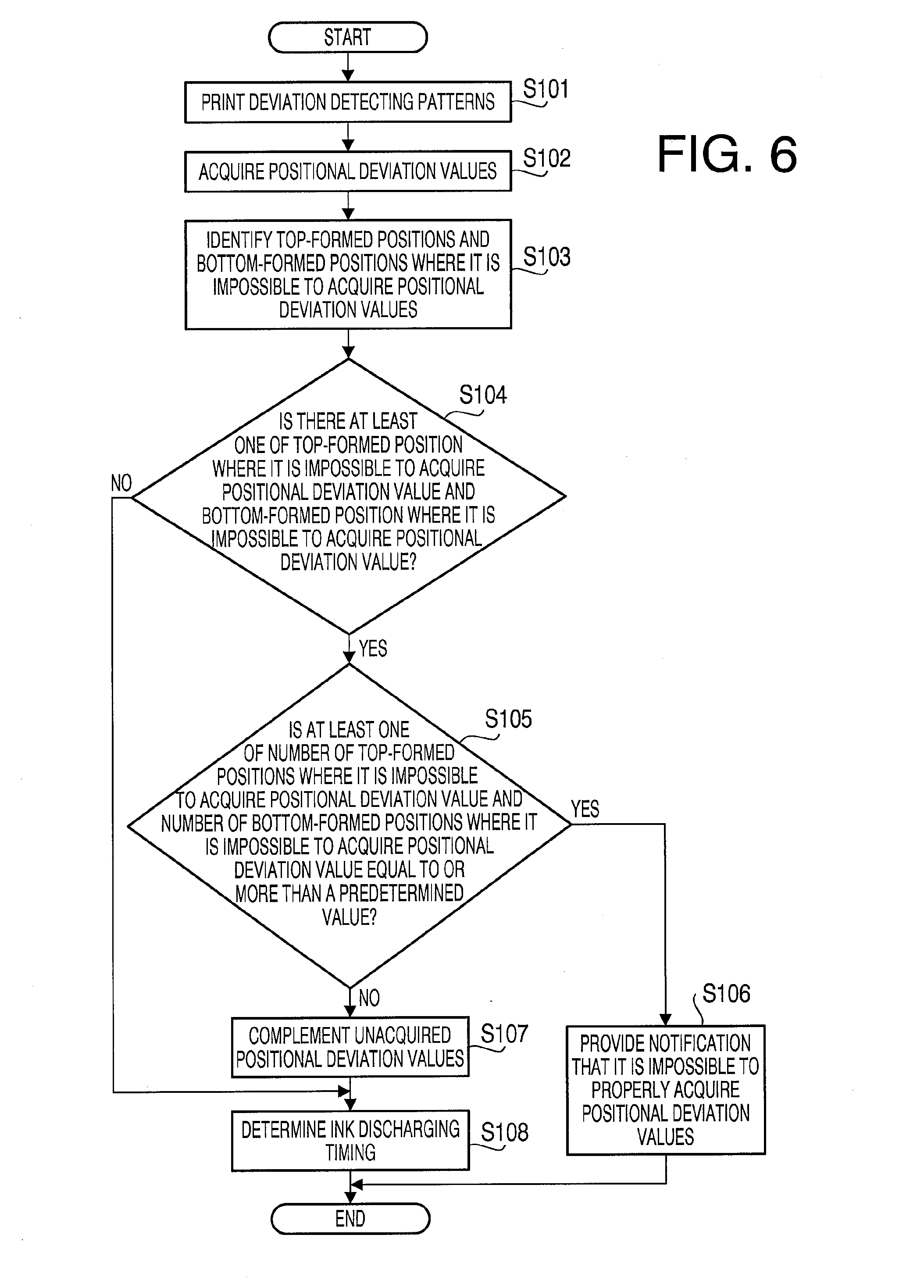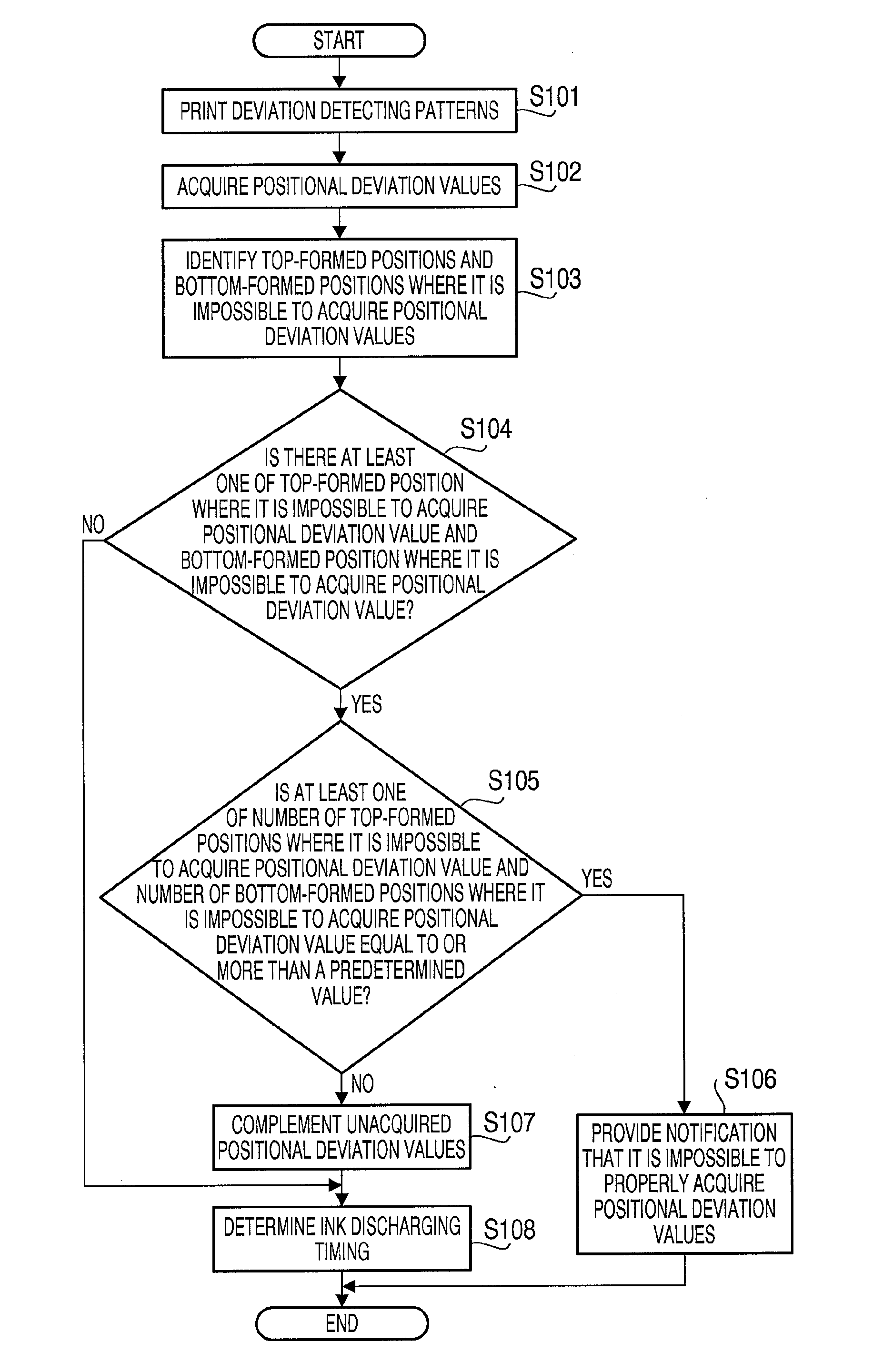 In S108, the control device 50 (the discharging timing determining unit 56) determines the ink discharging timing (moments) to discharge ink from the nozzles 10 in a printing operation, based on the positional deviation values. Specifically, when the control device 50 has successfully acquired the positional deviation values in every top-formed position and every bottom-formed position in S102, the control device 50 determines the ink discharging timing based on the positional deviation values acquired in S102. Meanwhile, when the control device 50 has failed to acquire positional deviation values in a part of the top-formed positions and the bottom-formed positions in S102, and has complemented the unacquired positional deviation values with representative values (e.g., the aforementioned average values) in S107, the control device 50 determines the ink discharging timing based on the positional deviation values acquired in S102 and the representative values used in S107.