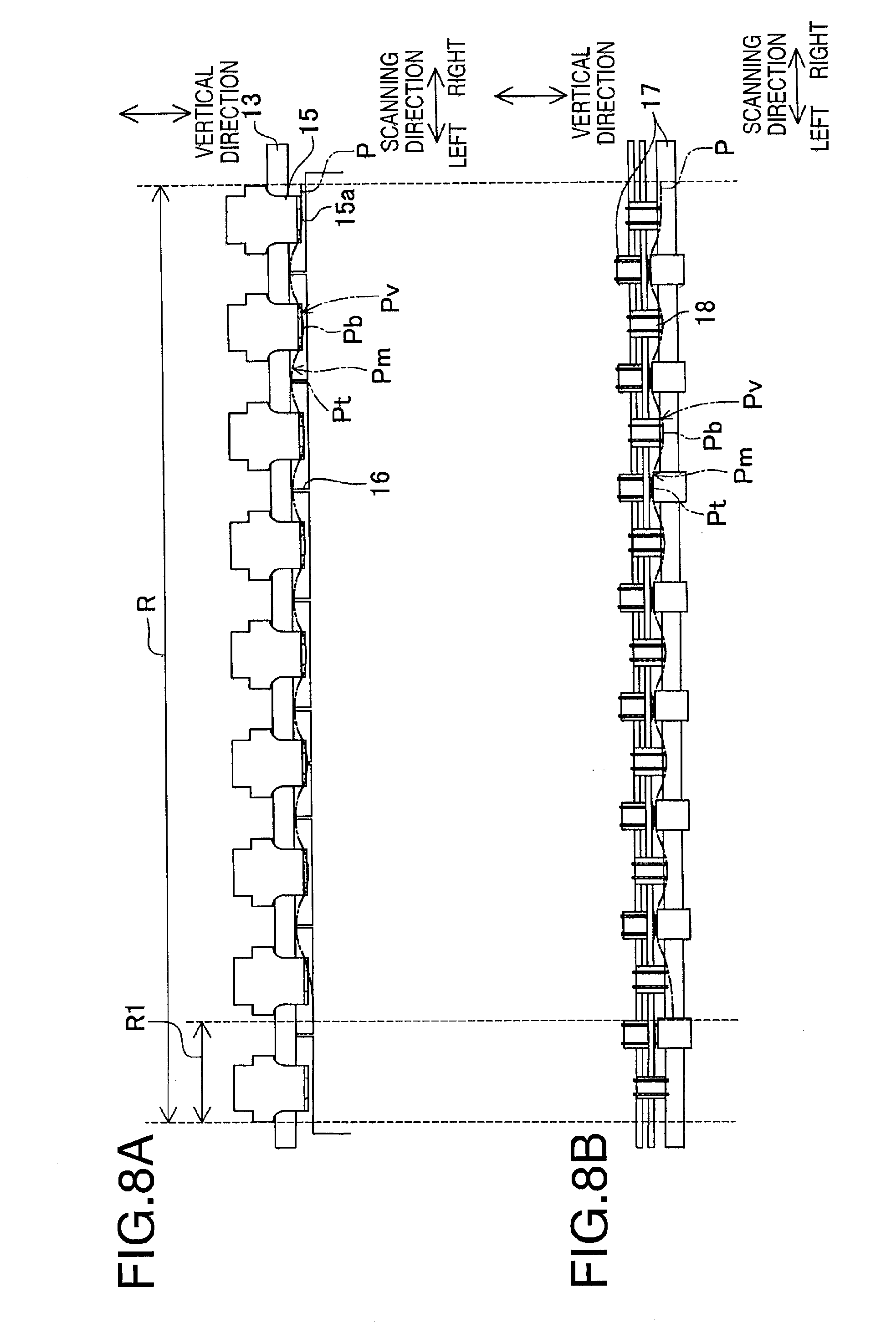On the contrary, for instance, as shown in FIG. 8, when the width of the recording sheet P in the scanning direction is shorter than the length of the range R, and the recording sheet P is not placed in a partial range R1 of the range R, it is impossible to form a top portion Pt or a bottom portion Pb in the top-formed position or the bottom-formed position in the partial range R1. Further, since the recording sheet P is not in the partial range R1, in S101, it is impossible to print a deviation detecting pattern Q corresponding to the top-formed position or the bottom-formed position in the partial range R1.