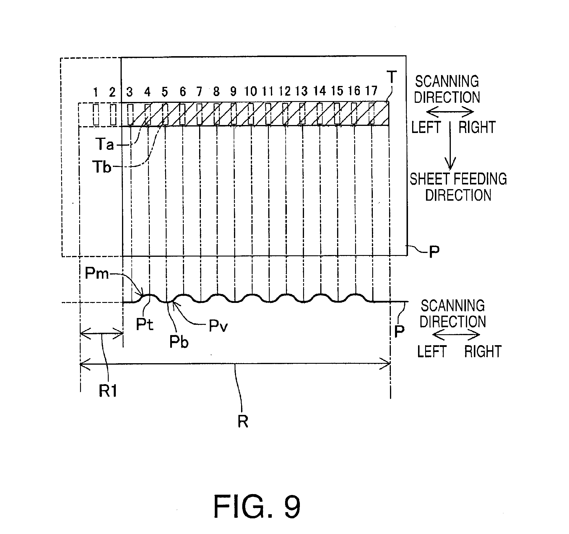 A specific explanation will be provided below with reference to FIG. 9, in which reference numbers “1” to “17” are assigned to the plurality of sections Ta and Tb (unlike a below-mentioned modification as shown in FIG. 10, the numbers are not actually printed on the recording sheet P). When the recording sheet P is not in the partial range R1, for example, the recording sheet P does not have any portion corresponding to the section Ta of the reference number “1” or the section Tb of the reference number “2.” Therefore, it is impossible to print a deviation detecting pattern Q in the section Ta of the reference number “1” or the section Tb of the reference number “2.”