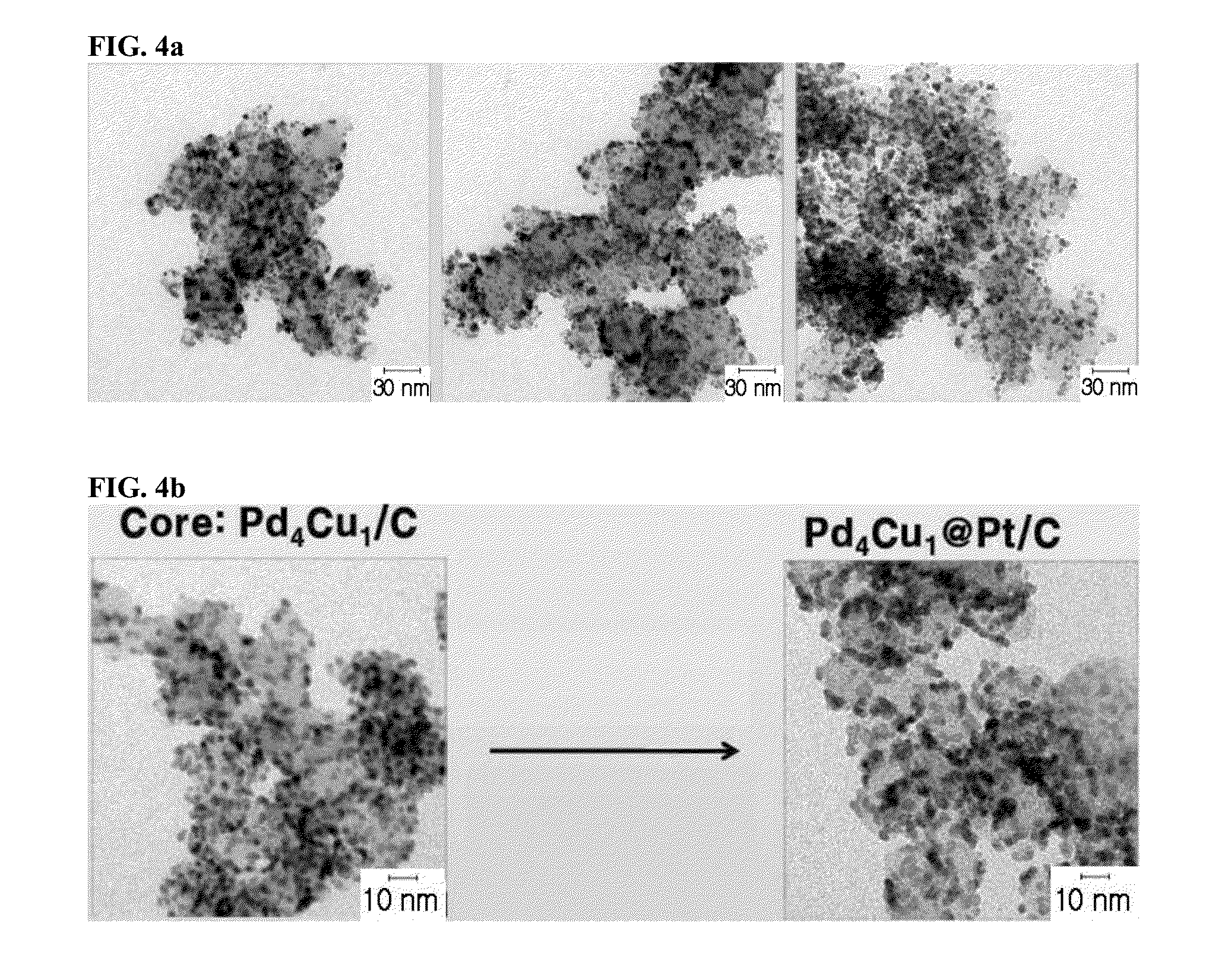 (2) The electrical activity of each of the catalysts produced in Examples 2-1a, 2-1b and 2-1c per unit area of the catalyst was measured. The results are shown in FIG. 9. The half wave potential of the catalyst produced using 1.0 eq. platinum for the formation of the shell layer was increased by 10 mV compared to that of the catalyst using 1.5 eq. platinum and was increased by 5 mV compared to that of the catalyst produced using 1.5 eq. platinum. These results indicate better performance of the catalyst produced using 1.0 eq. platinum. The excessive use (1.5 eq.) of the metal Pt for the formation of the shell layer is thought to cause bulk characteristics of Pt, and the use of a small amount (0.7 eq.) of Pt is thought to cause insufficient surrounding of the core particles by Pt, leading to slightly inferior performance. From these results, it can be concluded that a core-shell structured catalyst having preferred catalytic activity can be produced by controlling the amount of at least one shell layer-forming metal according to the invention.