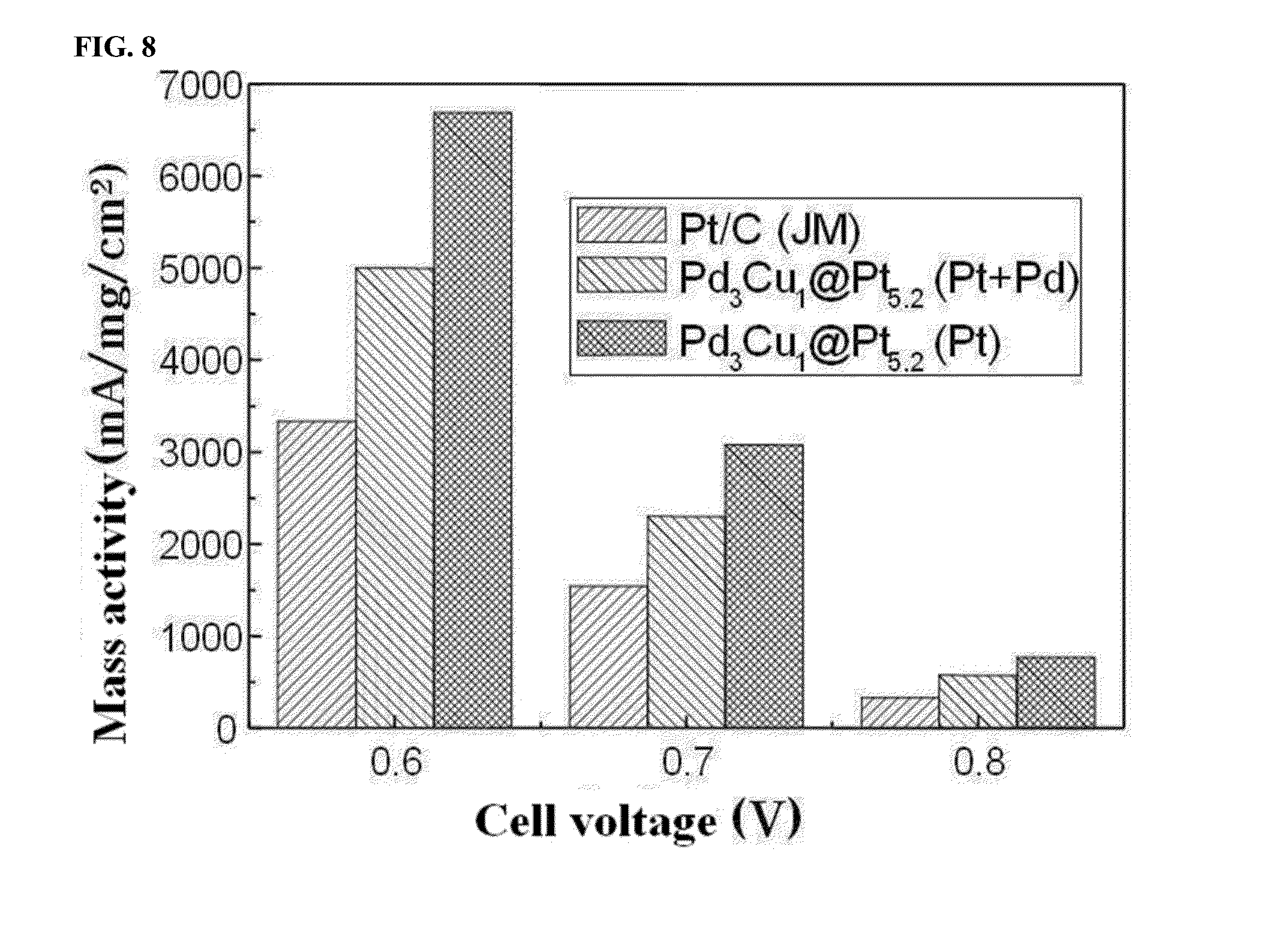 Meanwhile, FIG. 8 shows values obtained by dividing the current densities at particular voltages (0.6 V, 0.7 V and 0.8 V) by the mass of Pt or Pt+Pd to evaluate the catalytic activities of the catalyst of Example 2-1a and the commercial catalyst per unit mass from the data of FIG. 7. At least a 2-fold increase in the Pt mass and an about 1.4-fold increase in the mass of Pt+Pd were observed. These results indicate markedly improved catalytic activity of the metals used in the catalysts of Examples 2-1a and 2-2 compared to that of the commercial catalyst.