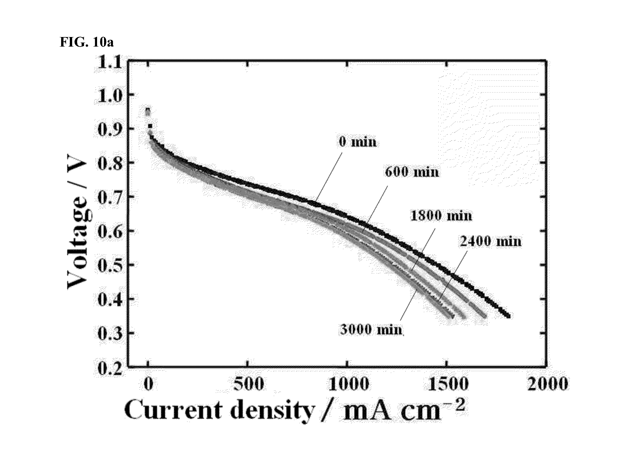 The results of FIG. 10a show that the catalyst produced in Example 2-1a is at least 5-fold more stable than the commercial catalyst, Pt/C. FIGS. 10b and 10c are graphs comparing the performance of the catalysts at 0.6 V and 0.7 V with the passage of time. The graphs show that the performance was only slightly decreased even after 500 hr. FIG. 10c shows degradation in the performance of the catalysts from the data of FIG. 10b.