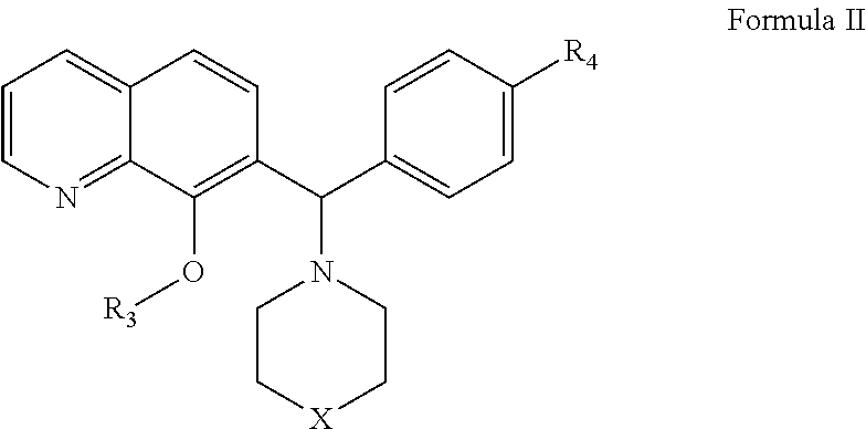 In the calculation above, the average absorbance calculated for each compound of Formula I or Formula II (of two wells) was calculated and utilized to calculate the percent inhibition. Percent inhibition was then utilized to calculate IC50 values for each compound of Formula I or Formula II.