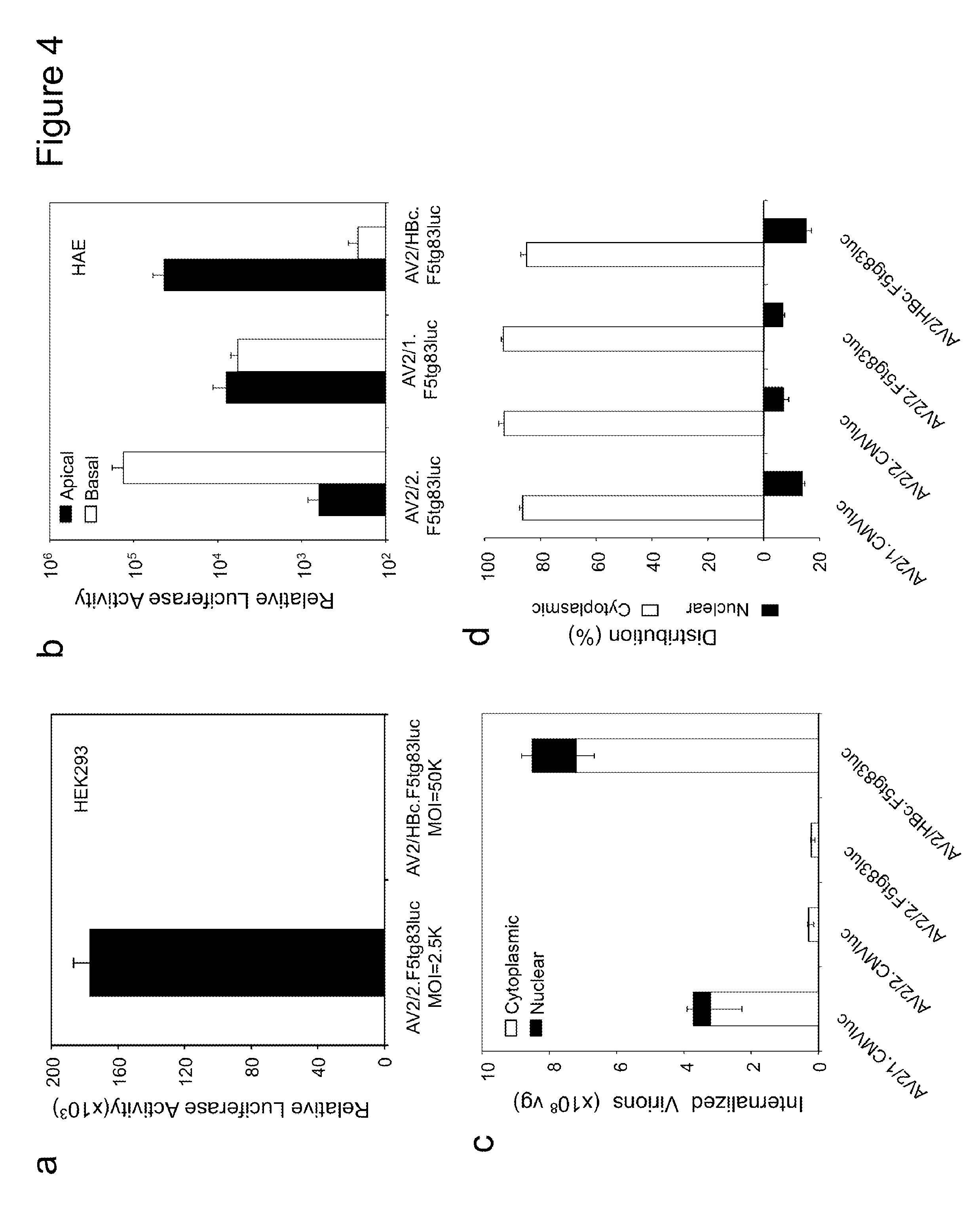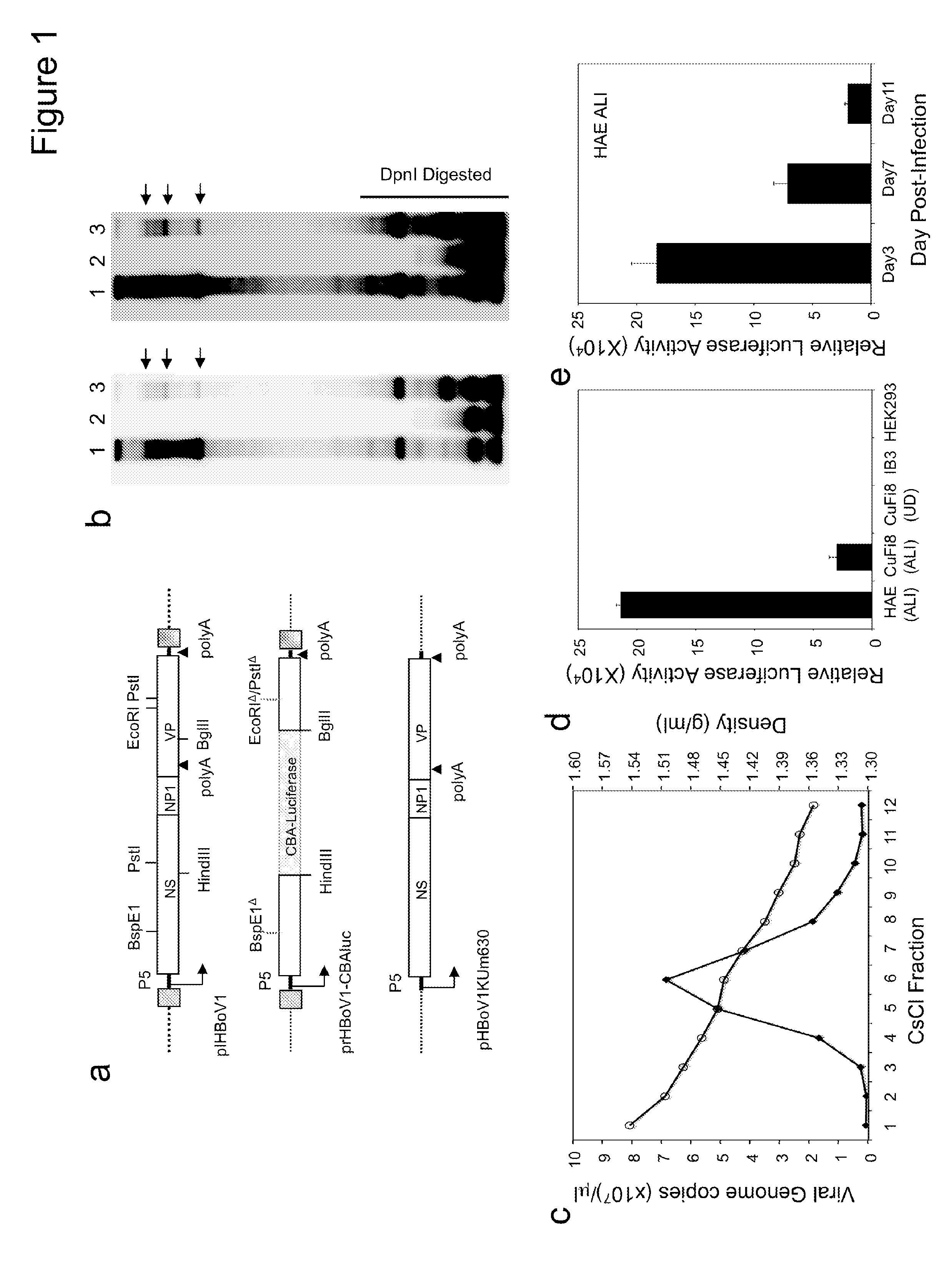 This application claims the benefit of the filing date of U.S. applcation Ser. No. 61/809,702 filed on Apr. 8, 2013, the disclosure of which is incorporated herein. This invention was made with government support under HL108902 awarded by National Institutes of Health. The Government has certain rights in the invention. Gene therapy has been widely used in clinical trials since 1990s with many successful cases reported using viral or non-viral vectors to deliver therapeutic genes. The lung is an important organ for the gene therapy treatment to patients with inherent gene defects such as cystic fibrosis (CF), alpha 1-antitrypsin (AAT) deficiency, or with other chronic acquired respiratory disorders such as asthma and lung cancers. Of these lung diseases, CF, caused by single gene defect in coding a protein cystic fibrosis transmembrane conductance regulator (CFTR), is the most common life-threatening gene defect inherent disease with about $450 million spent annually on patient care in the U.S alone. Although clinical treatments have improved CF patients' quality of life and lifespan in the recent decades, for this single gene defect inherent disease, gene therapy appears the best cure to permanently correct the disorder by replacing the defective CFTR gene (Mueller et al., 2008; Driskell et al., 2003; Griesenbach et al., 2010). CF is an autosomal recessive genetic disorder caused by mutations in the CFTR gene coding (Rommens et al., 1989). It is a multi-organ disease, but CF pulmonary disease is the most life-threatening (Rowe et al., 2005). Recombinant adeno-associated viral vectors (rAAV) are currently one gene therapy agent that is being pursued for CF lung gene therapy (Griesenbach et al., 2010; Flotte, 2007; Carter, 2005). rAAV vectors for CF lung gene therapy have been under development for nearly two decades, and most serotypes appear to be effectively endocytosed from the apical surface of airway epithelia despite varying degrees of transduction (i.e., expression of an encoded transgene). Although these vectors have demonstrated good safety profiles in CF clinical trails (Aitken et al., 2001; Moss et al., 2007; Wagner et al., 2002), they have failed to achieve complementation in vivo for two significant reasons. First, post-entry barriers in virion processing following infection appear to limit nuclear translocation, and thus transgene expression, in a proteasome-dependent manner (Duan et al., 2000; Ding et al., 2005; Yan et al., 2002; Zhong et al., 2008; Zhong et al., 2007). This feature of rAAV2 is reflected in CF clinical trials where viral genomes persisted in the airway epithelia of test subjects without detection of transgene-derived CFTR mRNA or clinical improvement in lung function (Aitken et al., 2001; Moss et al., 2007; Wagner et al., 2002). Identifying an appropriate rAAV serotype that bypassed these limitations has proved challenging due to species-specific differences between animal models and humans (Flotte et al., 2010; Liu et al., 2007a; Liu et al., 2007b). rAAV1 proves to be the most efficient serotype for apical infection of human airway (Flotte et al., 2010; Yan et al., 2012; Yan et al., 2006), while others have found success using directed capsid evolution to enhanced the tropism of rAAV for apical human epithelium (HAE) transduction (Li et al., 2009; Excoffon et al., 2009). However, effective CFTR complementation in CF HAE still requires the use of proteasome inhibitors to enhance transduction (Li et al., 2009; Zhang et al., 2004). A second major barrier to efficient CFTR expression from rAAV vectors is their limited packaging capacity (about 4.9 kb) that necessitates the use of small, weak promoters and/or the use of CFTR minigenes (Zhang et al., 1998). The first generation rAAV-CFTR tested in a clinical trial utilized the cryptic promoter within the AAV2 ITR to drive the expression of a full-length CFTR cDNA (Aitken et al., 2001), and this was later improved by the incorporation of a short 83 by synthetic promoter (Zhang et al., 2004). Other efforts to circumvent the small packing capacity of rAAV vectors have included trimming down size of the CFTR cDNA by deletion of non-critical sequences (such as partial deletion at the R-domain) to expand room for core promoter elements such as a shortened CMV promoter (Li et al., 2009; Zhang et al., 1998; Ostedgaard et al., 2005; Ostedgaard et al., 2002). Although these strategies have improved expression of CFTR, it is clear that pushing the packaging limits of rAAV can lead to inconsistent deletions at the 5′ end of rAAV genome (Kapranov et al., 2012), thus further jeopardizing genome stability and expression. As described herein, a recombinant human bocavirus virus-1 (HBoV-1) was generated from an ORF-disrupted rHBoV1 genome that efficiently transduces human airway epithelium (HAE) from the apical surface. The larger genome and high airway tropism of HBoV1 is ideal for creating a viral vector for gene transfer, e.g., airway gene transfer, including gene therapy for genetic and acquired diseases such as genetic and acquired pulmonary diseases, cancer, as well as vaccines, for instance, against respiratory disease. As further described herein, a rAAV2/HBoV1 chimeric virus (e.g., about 5.5-kb genome) was created, where HBoV1 capsids packaged oversized rAAV2 genomes. Clinical trials have supported the safety of applying the rAAV2 genome in the context of gene therapy for cystic fibrosis (CF) lung disease. The chimeric vector retains the high safety profile of the rAAV2 genome while also providing the airway apical tropism of the HBoV1 capsid. rAAV2/HBoV1 was shown to be capable of apically transducing HAE at 5.6- and 70-fold greater efficiency than rAAV1 or rAAV2 (4.7-kb genomes), respectively. Molecular studies demonstrated that polarization of airway epithelial cells was required for HBoV1 capsid-mediated gene transfer. Further, rAAV2/HBoV1-CFTR virus containing the full-length CFTR coding sequence and the strong 