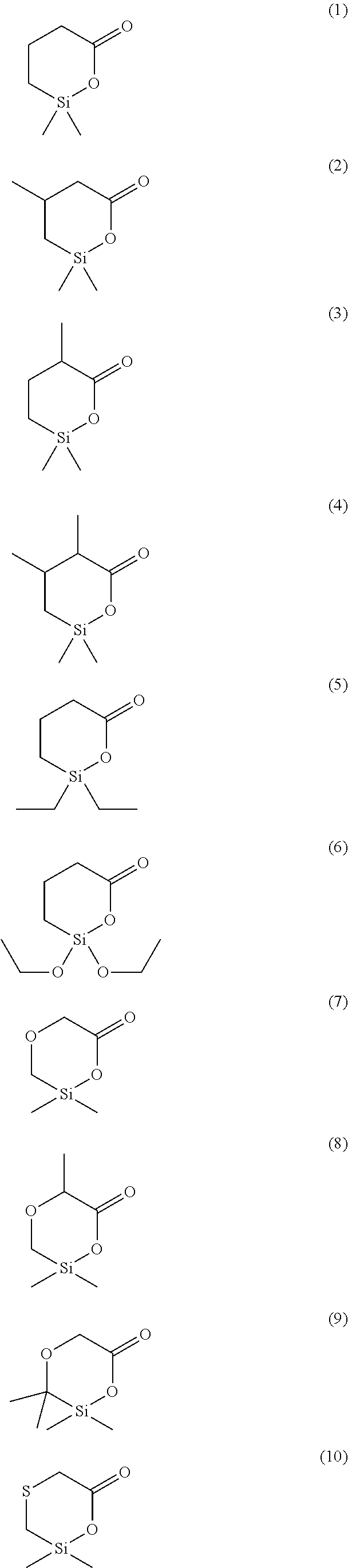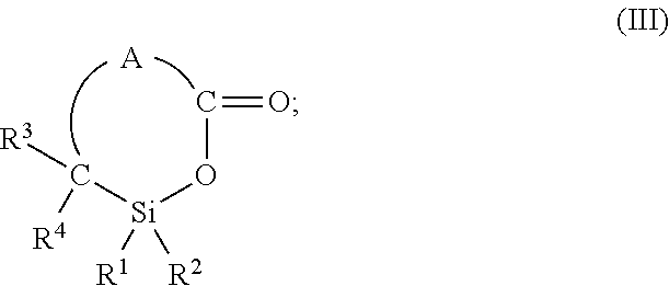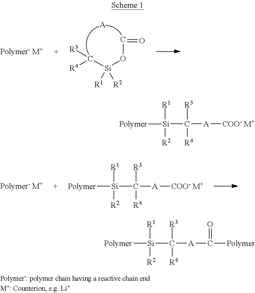 Preferred polymers for preparation of the Inventive end group-functionalized polymers are diene polymers, and diene copolymers obtainable by copolymerization of dienes with vinylaromatic monomers. Preferred dienes are 1,3-butadiene, isoprene, 1,3-pentadiene, 2,3-dimethylbutadiene, 1-phenyl-1,3-butadiene and/or 1,3-hexadiene. Particular preference is given to using 1,3-butadiene and/or isoprene. The vinylaromatic comonomers may, for example, be styrene, o-, m- and/or p-methylstyrene, p-tert-butylstyrene, α-methylstyrene, vinylnaphthalene, divinylbenzene, trivinylbenzene and/or divinylnaphthalene. Particular preference is given to using styrene. These polymers are preferably prepared by anionic solution polymerization or by polymerization by means of coordination catalysts. In this context, coordination catalysts are understood to mean Ziegler-Natta catalysts or monometallic catalyst systems. Preferred coordination catalysts are those based on Ni, Co, Ti, Zr, Nd, V, Cr, Mo, W or Fe. Initiators for anionic solution polymerization are those based on alkali metals or alkaline earth metals, for example methyllithium, ethyllithium, isopropyllithium, n-butyllithium, seobutyllithium, pentyllithium, n-hexyllithium, cyclohexyllithium, octyllithium, decyllithium, 2-(6-lithio-n-hexoxy)tetrahydropyran, 3-(tert-butyldimethylsiloxy)-1-propyllithium, phenyllithium, 4-butylphenyllithium, 1-naphthyllithlum, p-tolyllithlum and allyllithium compounds derived from tertiary N-allylamines, such as [1-(dimethylamino)-2-propenyl]lithium, [1-[bis(phenylmethyl)amino]-2-propenyl]lithium, [1-(diphenylamino)-2-propenyl]lithium, [1-(1-pyrrolidinyl)-2-propenyl]lithium, lithium amides of secondary amines, such as lithium pyrrolidide, lithium piperidide, lithium hexamethyleneimide, lithium 1-methylimidazolidide, lithium 1-methylpiperazide, lithium morpholide, lithium dicyclohexylamide, lithium dibenzylamide, lithium diphenylamide. These allyllithium compounds and these lithium amides can also be prepared in situ by reaction of an organolithium compound with the respective tertiary N-allylamines or with the respective secondary amines. In addition, it is also possible to use di- and polyfunctional organolithium compounds, for example 1,4-dilithiobutane, dilithium piperazide. Preference is given to using n-butyllithium and sec-butyllithium. In addition, it is possible to use the known randomizers and control agents for the microstructure of the polymer, for example diethyl ether, di-n-propyl ether, diisopropyl ether, di-n-butyl ether, ethylene glycol dimethyl ether, ethylene glycol diethyl ether, ethylene glycol di-n-butyl ether, ethylene glycol di-tert-butyl ether, diethylene glycol dimethyl ether, diethylene glycol diethyl ether, diethylene glycol di-n-butyl ether, diethylene glycol di-ter-butyl ether, 2-(2-ethoxyethoxy)-2-methylpropane, triethylene glycol dimethyl ether, tetrahydrofuran, ethyl tetrahydrofurfuryl ether, hexyl tetrahydrofurfuryl ether, 2,2-bis(2-tetrahydrofuryl)propane, dioxane, trimethylamine, triethylamine, N,N,N′,N′-tetramethylethylenediamine, N-methylmorpholine, N-ethylmorpholine, 1,2-dipiperidinoethane, 1,2-dipyrrolidinoethane, 1,2-dimorpholinoethane and potassium and sodium salts of alcohols, phenols, carboxylic acids, sulphonic acids. Such solution polymerizations are known and are described, for example, in I. Franta, Elastomers and Rubber Compounding Materials; Elsevier 1989, pages 113-131, in Houben-Weyl, Methoden der Organischen Chemie [Methods of Organic Chemistry], Thieme Verlag, Stuttgart, 1961, volume XIV/1 pages 645 to 673 or in volume E 20 (1987), pages 114 to 134 and pages 134 to 153, and in Comprehensive Polymer Science, Vol. 4, Part II (Pergamon Press Ltd., Oxford 1989), pages 53-108. The preparation of the preferred diene homopolymers and diene copolymers preferably takes place in a solvent. The solvents used for the polymerization are preferably inert aprotic solvents, for example paraffinic hydrocarbons such as isomeric butanes, pentanes, hexanes, heptanes, octanes, decanes, cyclopentane, methylcyclopentane, cyclohexane, methylcyclohexane, ethylcyclohexane or 1,4-dimethylcyclohexane, or alkenes such as 1-butene, or aromatic hydrocarbons such as benzene, toluene, ethylbenzene, xylene, diethylbenzene or propylbenzene. These solvents can be used individually or in combination. Preference is given to cyclohexane, methylcyclopentane and n-hexane. Blending with polar solvents is likewise possible. The amount of solvent in the process according to the invention is typically in the range from 100 to 1000 g, preferably in the range from 200 to 700 g, based on 100 g of the total amount of monomer used. However, it is also possible to polymerize the monomers used in the absence of solvents. The polymerization can be performed in such a way that the monomers and the solvent are initially charged and then the polymerization is started by adding the initiator or catalyst. Polymerization in a feed process is also possible, in which the polymerization reactor is filled by addition of monomers and solvent, the initiator or catalyst being initially charged or added with the monomers and the solvent. Variations such as initial charging of the solvent in the reactor, addition of the initiator or catalyst and then addition of the monomers, are possible. In addition, the polymerization can be operated in a continuous mode. Further addition of monomer and solvent during or at the end of the polymerization is possible in all cases. The polymerization time may vary within wide limits from a few minutes to a few hours. Typically, the polymerization is performed within a period of 10 minutes up to 8 hours, preferably 20 minutes to 4 hours. It can be performed either at standard pressure or at elevated pressure (from 1 to 10 bar). It has been found that, surprisingly, the use of one or more silalactones as functionalizing reagents can produce carboxyl-terminated polymers which do not have the disadvantages