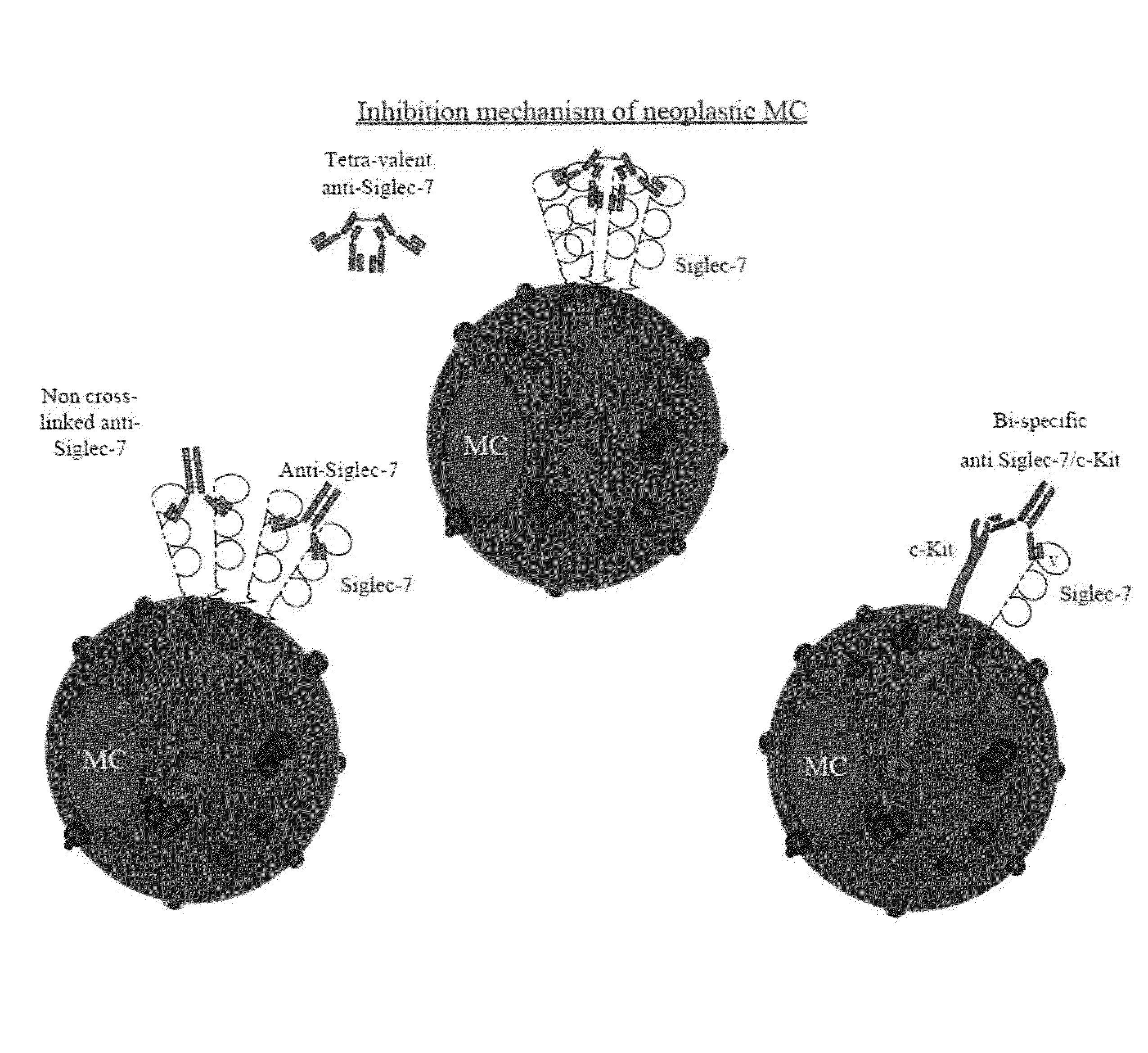 Unless otherwise defined, all technical and/or scientific terms used herein have the same meaning as commonly understood by one of ordinary skill in the art to which the invention pertains. Although methods and materials similar or equivalent to those described herein can be used in the practice or testing of embodiments of the invention, exemplary methods and/or materials are described below. In case of conflict, the patent specification, including definitions, will control. In addition, the materials, methods, and examples are illustrative only and are not intended to be necessarily limiting. Some embodiments of the invention are herein described, by way of example only, with reference to the accompanying drawings. With specific reference now to the drawings in detail, it is stressed that the particulars shown are by way of example and for purposes of illustrative discussion of embodiments of the invention. In this regard, the description taken with the drawings makes apparent to those skilled in the art how embodiments of the invention may be practiced. In the drawings: The present invention, in some embodiments thereof, relates to compositions for and methods of inhibiting activation of a mast cell and treating a disease induced by activation of a mast cell. Before explaining at least one embodiment of the invention in detail, it is to be understood that the invention is not necessarily limited in its application to the details set forth in the following description or exemplified by the Examples. The invention is capable of other embodiments or of being practiced or carried out in various ways. Mast cells (MCs) are highly granulated cells widely distributed throughout the body. Classical activation of MCs is triggered by the binding of allergens to two adjacent IgE molecules bound to FcεRI, however there are other IgE-independent ways for MCs stimulation. It has recently become clear that MCs degranulation is regulated by additional activating and inhibitory surface receptors such as KIR, IRP60, FcγRIIB and gp49A/B1/B2. Siglec-7, a type 1 trans-membrane protein that belongs to the human Siglec family of receptors, is known to be constitutively expressed on natural killer (NK) cells, monocytes and on a small subset of CD8+CD3+ T cells. Siglec-7 has generally been indicated as transmitting inhibitory signals, however targeting of Siglec-7 was also shown to induce activation of monocytes, to induce monocytes' cell death and to inhibit the proliferation of chronic and acute myeloid leukemia. Whilst reducing the present invention to practice the present inventors have surprisingly uncovered that Siglec-7 is expressed on the surface of normal and tumorigenic MCs. Indeed Siglec-7 was found to function on the surface of these cells by eliciting inhibitory signaling. The present inventors have therefore harnessed these new findings towards configuring a novel tool for MC activation inhibition. Thus, while further reducing the present invention to practice, the present inventors have shown that co-cross-linking of the inhibitory receptor Siglec-7 with an activation receptor inhibits degranulation of non-cancerous MCs without reducing their viability. In addition, cross-linking of Siglec-7 increases the mortality of transformed MCs and inhibits their proliferation. Taken together, according to this invention, an agent that activates Siglec-7 can be used to reduce viability of cancerous MCs. In addition, according to this invention an agent that binds Siglec-7 while cross linking it to a MC activating receptor can be used to inhibit activation of MCs. As is illustrated hereinunder and in the Examples section, which follows the present inventors have shown that Siglec-7 is expressed on the surface of normal human cord blood MCs, isolated human foreskin MCs and neoplastic MC lines such as HMC-1, HMC-1.1 and LAD (Example 1, As is shown in The inventors further demonstrate that cross-linking Siglec-7 alone did not inhibit FcεRI-induced degranulation ( Additionally, tyrosine-phosphorylated SHP-1 co-immunoprecipitated with Siglec-7 in cord blood MCs ( The present inventors have further demonstrated in Consequently, the present invention provides agents and compositions that binds and activates Siglec-7 and can be used to inhibit activation of MCs and reduce viability of cancerous MCs in-vitro, ex-vivo and in-vivo. Furthermore, the agents and composition of the present invention can be used in the treatment of medical conditions induced by activation of MCs. Thus, according to an aspect of the present invention, there is provided a method of inhibiting activation of a cancerous MC, the method comprising contacting the cancerous MC with an effective amount of a multivalent agent which binds and activates Siglec-7, thereby inhibiting activation of the cancerous MC. According to an additional or an alternative embodiment, there is provided a method of inhibiting activation of a MC, the method comprising contacting a MC with an effective amount of an agent comprising: (i) a first moiety which binds and activates Siglec-7; and (ii) a second moiety which binds activates a MC activating receptor, thereby inhibiting activation of the mast cell. According to an additional or an alternative embodiment, there is provided a method of inhibiting activation of a MC, the method comprising contacting the MC, with an effective amount of a multivalent agent which binds and activates Siglec-7, thereby inhibiting activation of the mast cell. As used herein “a mast cell (MC)” refers to a highly granulated cell containing numerous granules comprising substances such as histamine and heparin. Typical markers of MCs include but are not limited to CD117 (c-Kit) and FcεRI. Activation of mast cells is defined by at least one of the following processes growth, maturation, proliferation, migration, survival, apoptosis, degranulation, mediator release, priming (preparing the cell for action, alerting it to standby), chemot