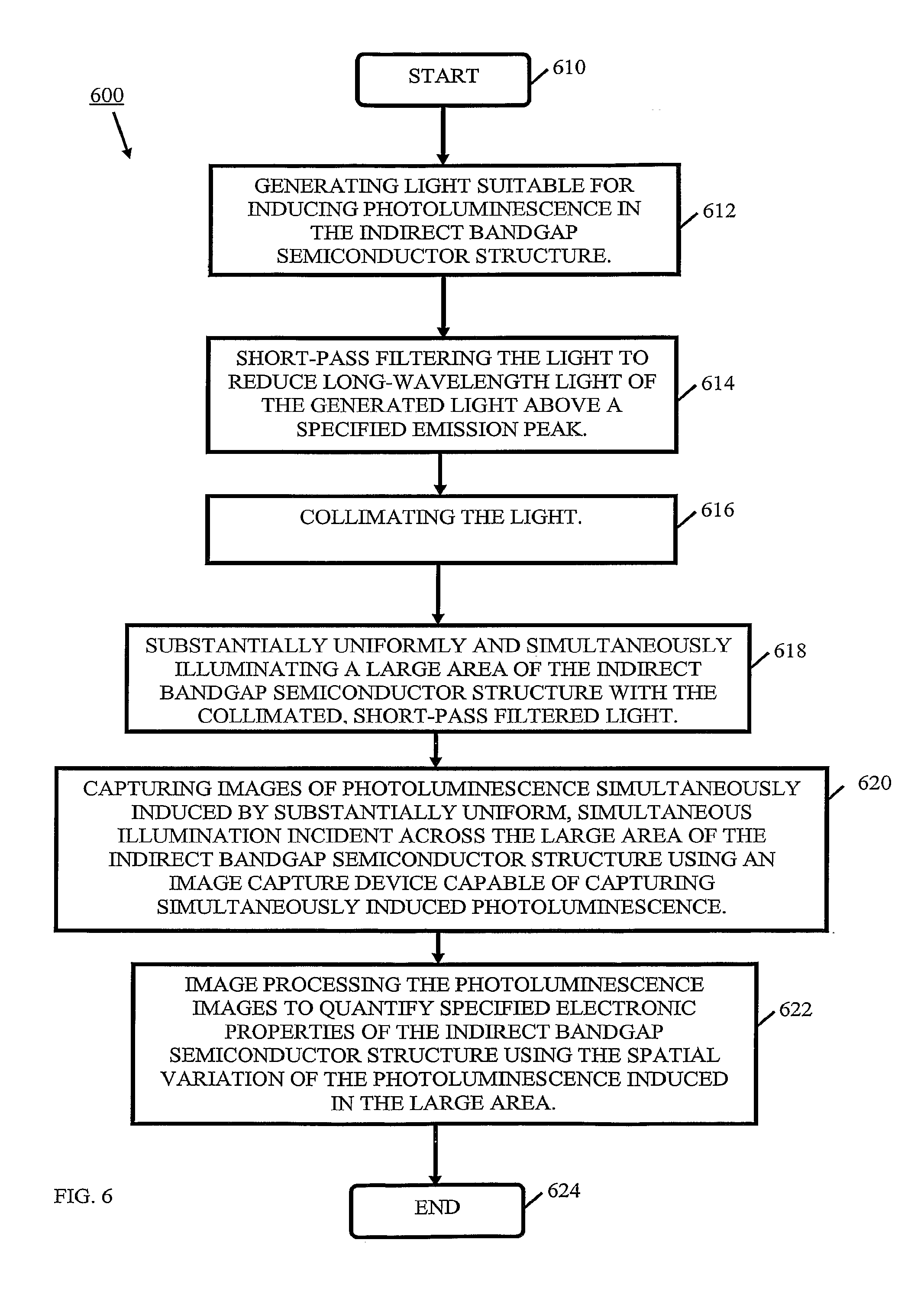 The present invention relates generally to semiconductor testing and more particularly to testing of indirect bandgap semiconductor material. Photovoltaic manufacturing is a rapidly expanding market with typical growth rates of greater than thirty percent (30%) per annum. The predominant sector of solar cell manufacturing is multi-crystalline wafer-based technology. In this industry, a significant proportion of total throughput is below specifications and is rejected, causing substantial financial losses to the industry each year. The production of a solar cell involves a highly specialized sequence of processing steps that starts with a bare semiconductor wafer, such as silicon. Bel'kov, V V, et al, “Microwave-induced patterns in n-GaAs and their photoluminescence imaging”, Physical Review B, Vol. 61, No. 20 The system of Bel'kov can be used to test n-GaAs, which is a direct bandgap semiconductor, Given the high magnitude of photoluminescence efficiency in such a semiconductor the n-GaAs sample allows relatively low powered LEDs to be used as light sources for inducing photoluminescence, in which the source illumination diverges. Also, the arrangement of the waveguide and cryostat windows limits the viewing area of the camera. Disadvantageously, this only permits small areas (3 mm×7 mm) to be tested. Further, the system requires samples to be tested at low temperatures produced by a cryostat. The configuration of Bel'kov permits source illumination from the LEDs to be captured by the video camera. The long-pass filter is intended to block illumination from the LEDs and to transmit photoluminescence above 820 nm to the camera, but also transmits any illumination from the LEDs above 820 nm to the camera. For n-GaAs samples, the high efficiency photoluminescence generated greatly exceeds any undesired illumination from the LEDs. In view of these and other limitations, the system of Bel'kov is not suited for testing indirect bandgap semiconductors. Masarotto, et al, “Development of an UV scanning photoluminescence apparatus for SiC characterization”, Eur J AP 20, 141-144, 2002, describes an adapted scanning PL apparatus for characterizing SiC. PL mapping is obtained by scanning the sample using an x-y stage with a 1 μM step and a doubled Ar+ laser beam focused by a microscope objective, with a spot diameter of 4 μm. Either integrated PL intensity or spectrally resolved PL can be obtained. This system scans PL in a point-by-point fashion. Such a system disadvantageously only permits a small area, i.e. a point, to be tested at any given time due to the scanning operation. Photoluminescence cannot be simultaneously captured across a large area of the sample under homogeneous illumination across the large area, which would better approximate operating conditions of a semiconductor device. Further, such a system is disadvantageously slow due to the scanning operation of the system. A need therefore exists for an inspection system for indirect bandgap semiconductor structures, especially silicon, including bare or partially processed wafers that might otherwise result in a rejected solar cell. In accordance with an aspect of the invention, there is provided a method of inspecting an indirect bandgap semiconductor structure. The method comprises the steps of: generating light suitable for inducing photoluminescence in the indirect bandgap semiconductor structure; short-pass filtering the light to reduce long-wavelength light of the generated light above a specified emission peak; collimating the light; substantially uniformly and simultaneously illuminating a large area of the indirect bandgap semiconductor structure with the collimated, short-pass filtered light; capturing images of photoluminescence simultaneously induced by the substantially uniform, simultaneous illumination incident across the large area of the indirect bandgap semiconductor structure using an image capture device capable of capturing simultaneously the induced photoluminescence; and image processing the photoluminescence images to quantify spatially resolved, specified electronic properties of the indirect bandgap semiconductor structure using the spatial variation of said photoluminescence induced in said large area. The indirect bandgap semiconductor may comprise silicon. The structure may comprise a bare or partially processed wafer of indirect bandgap semiconductor material, at least one partially formed electronic device, or a bare or partially processed silicon-on-insulator (SOI) structure. The electronic device may be a photovoltaic device. The short-pass filtering step may be implemented using one or more short-pass filters. The short-pass filtering step may be implemented using dielectric mirrors, which reflect short wavelength light to be used and transmit unwanted long wavelength components. The short-pass filtering step may reduce by a factor of about 10 or more the total photon flux in a long-wavelength tail of the generated light, the long-wavelength tail beginning at a wavelength that is about ten percent (10%) higher than a longest wavelength emission peak of a source for generating the light. The illuminated area of the indirect bandgap semiconductor structure may be equal to or greater than about 1.0 cm2. The method may further comprise the step of homogenizing the generated light. The method may be performed at room temperature. The generated light may be monochromatic or substantially monochromatic light. The light may be generated by at least one laser, laser diode, laser diode array, or high-powered light emitting diode (LED). Alternatively, the light may be generated by an array of light emitting diodes (LEDs) or a broad spectrum lamp and filtered to limit the spectrum of the light. The total optical power of the light may exceed about 1 Watt. A source of the generated light may be oriented toward the surface of one side of the structure for illumination of that surface and the image capture