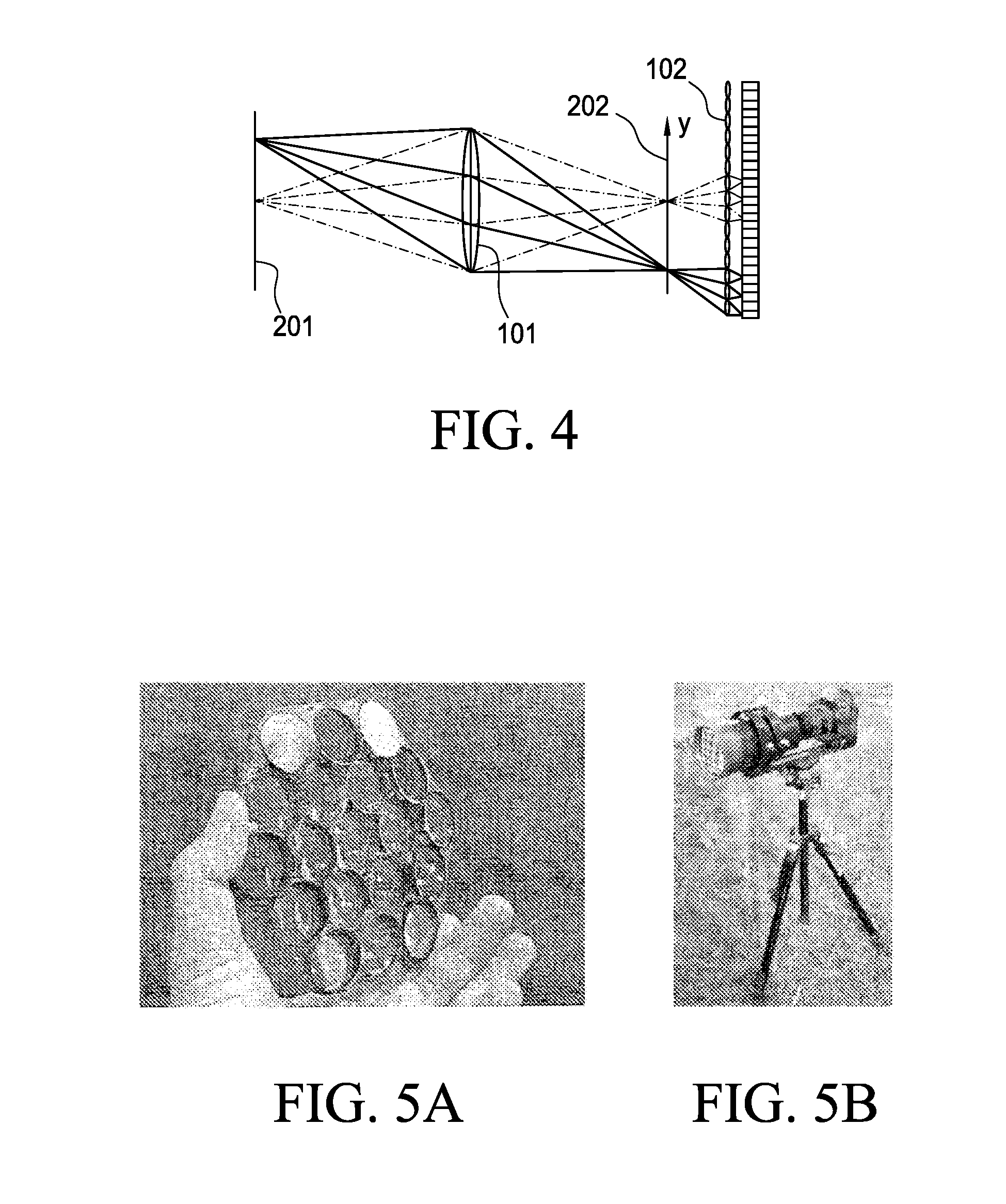 [0010]FIGS. 3 and 4 (reproduced from GB 2,488,905, inventors Norihito Hiasa and Koshi Hatakeyama) illustrate the propagation of the light rays and the source of algorithms that can be used for various tasks such as refocusing, the calculation of distances, etc. FIG. 3 illustrates the case where a pair of points of the target plane come to focus in a plane which is positioned beyond the plane of the microlenses, however, these rays never reach focus, they are diffracted by the microlenses and give rise to several pixels in the sensor (instead of a single pixel in the plane that would be focused). FIG. 4 illustrates the case in which a couple of points in the plane object comes to focus on an earlier plane of the microlenses and from that point diverge, are diffracted by the microlenses and result in several pixels in the sensor plane. In both cases, if the sensor (or film) were in the place where the microlenses are, the image of these points would appear blurred; however, with a plenoptic camera, where you can determine the direction of arrival of the rays, there are multiple algorithms to calculate what would be the focused image of the items described in FIGS. 3 and 4, calculating the “backtracking” of the light rays (from the image sensor in the space to the right of the main lens up to the focal plane, and even the origin of these rays in the object space, to the left of the lens). Due to similarity of triangles of space with the object image space, it is also possible to calculate the distance from the focal plane (201) to the planes described in FIGS. 3 and 4 (101, 102 and 202), it is even possible to calculate the distance between pixels of an image to the origin of these pixels in the object space, with this information it is then possible to create images for 3-dimensional (3D) televisions images, refocus images produce images completely focused, etc.
