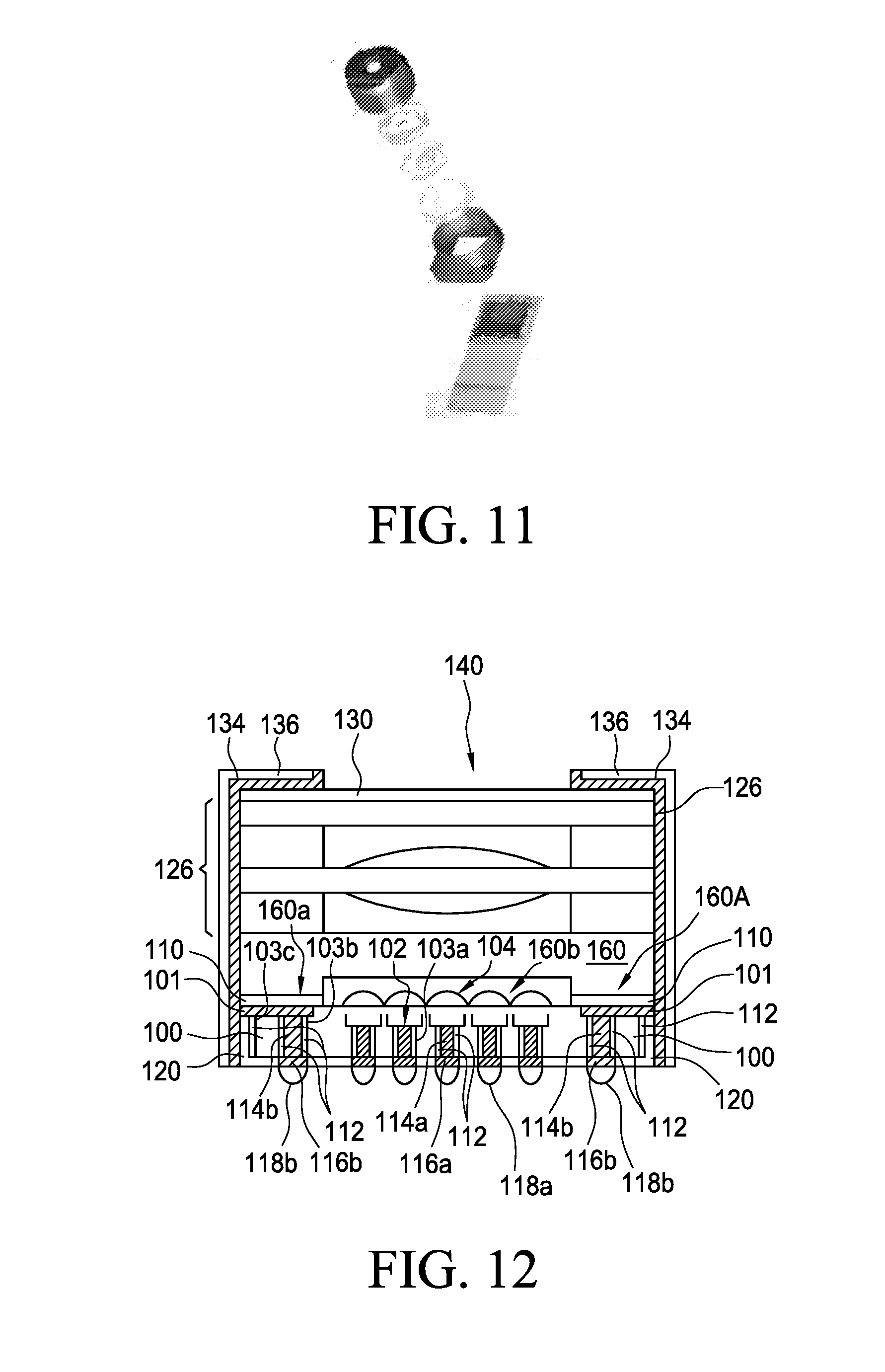 [0027]The structure described above, despite their relatively low cost, implies a non-negligible mechanical and assembly complexity, even thanks to the use of robotic or automated assembly techniques the price of a large number of lenses in the mechanical structure described is relatively high compared to similar structures that can be assembled using processing techniques similar to those employed in microelectronics or micro-optics. Following this trend, in November 2007, Weng and Lin described (in US 2009/0134483 A1) a compact camera module, reproduced in FIG. 12, comprising a photo-sensor chip (102), a set of lenses (126) and an outer shell with electrically conductive material (134). The module includes a substrate 100 which may be of silicon or another semiconductor material, and may contain a CCD image sensor or CMOS, a transparent substrate 160 located on the semiconductor substrate 100 and an array of microlenses 104 located between the two structures, the CCD or CMOS sensor contains an array of opto-electronic components 102 such as photodiodes or phototransistors, built in the substrate 100 by typical semiconductor techniques. At least one land pin (I/O pin) 114b is connected to the semiconductor substrate 100 and the conductive layer 101 formed on the substrate using microelectronic fabrication techniques. Also a set of pin 114a is positioned to take outside readings of photo-sensors. Both ground pins as the pins of the photo-sensors are isolated electrically from the substrate by a dielectric layer 112. On the semiconductor substrate 100 a transparent substrate 160 (glass or quartz) is deposited, forming a cavity 160b on the sensors 102 and their respective microlenses 104. On the transparent substrate 160 a set of lenses 126 is placed, then a conductive layer is thereafter positioned on the semiconductor substrate 134 and the lens, whose function is to protect all sensory structure against interference from electromagnetic noises, since this layer is grounded through the layer 101 and the pin 114b. Further, an opaque layer 136 can be used (which may be as simple as a simple opaque paint) on the conductive layer 134 in order to obtain a better luminous insulation structure. To increase immunity to external electromagnetic radiation structure a transparent conductive layer 130 can be used on top of the structure formed by materials such as IZO (Indium Zinc Oxide, Zinc Indium Oxide) or ITO (Indium Tin Oxide, Indium Tin Oxide). This patent also describes a manufacturing method based on wafer processing, allowing production of large quantities of camera modules at very low prices, for example, not only are such techniques used to manufacture the sensors, but also to placing glass wafers or quartz wafer 160 on the semiconductor substrate 100, or to position lens 126 on the wafer substrate 160, or to deposit a transparent conductive layer 130 over all sub-modules built in a wafer. Finally, this structure may be subjected to a cutting process (dicing), or separation of each of the sub-modules built on a wafer, then the usual techniques of microelectronics packaging are used, such as BGA (Ball Grid Arrays) or “solder balling” at the bottom of the chip, normally available in modern packaging high density chips (represented in the figure with numbers 118b and 118a), allowing a very high and dense number of entry and exit pins, very convenient to quickly dump outside an increasing number of mega-pixels with new CMOS technology more commonly used in high-density sensors.