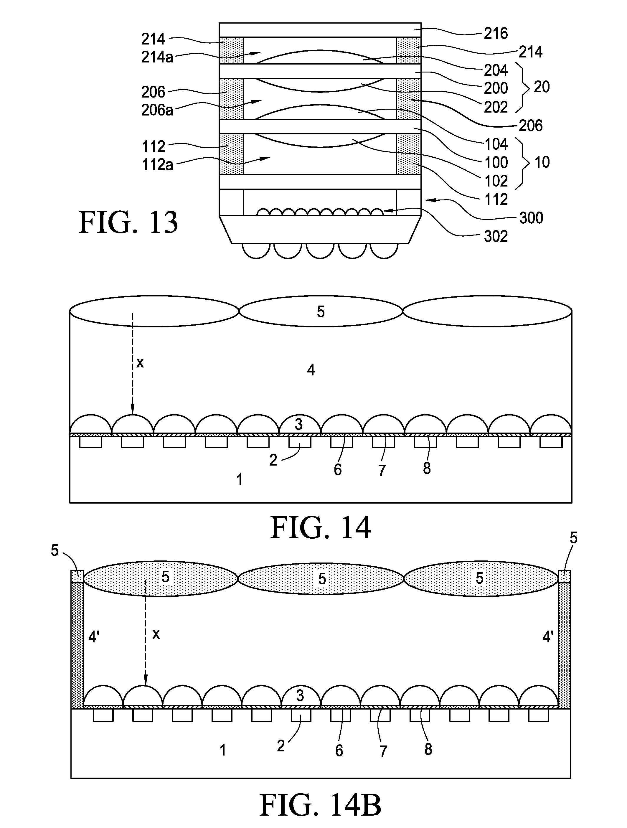[0028]T. Y. Lin, C. Y. Cheng and H. Y. Lin described in May 2007 from novel modules in patent US2011/292271 A1 (reproduced in FIG. 13), the bottom of the figure includes solder balls to connect the module to a printed circuit module, photo-sensors 300 (CMOS or CCD) modules on which is deposited an array of micro-lenses 302 similar to those described above, whose purpose is to concentrate light on the active area of each photo-sensor, on said structure a transparent substrate materials such as glass, quartz or other transparent material has been placed. This structure is similar to that of any other CCD or CMOS sensor, but from here a planar structure 112 is placed consisting of a dry photo-resistive film (dotted area), very similar to that commonly used in micro-electronic processes but with characteristics of high adhesiveness, said layer, whose thickness can be controlled at will depending on the distances designed between the sensor and the lens is subjected to a photolithographic process and attacked, leading to a structure with an empty space (112a) between the transparent substrate and the lenses 10; lens (10) is formed by a substrate 100 and two elements 102 and 104 in the two opposite surfaces of the substrate 100 (which in the image are convex but it could be concave) lenses are made of organic materials such as glass, epoxy, acrylates or silicone; the mechanical link between the different layers is carried out by heating processes. More lenses can be added to said structure by depositing new layer of photo-resistive material (206 and 214) and their selective etching to form gaps of spacing between the lenses (206a and 214a), finally placing a transparent substrate 216 in the top of the structure. The manufacturing process described lends itself to wafer processing, with the first wafer containing photo-sensor, on which the pixel microlenses 302, and from that structure several lenses are built, one after another on all sensors of the wafer, finally proceeding to the cutting process (dicing or obtaining a dice) from which a large number of camera modules are derived.