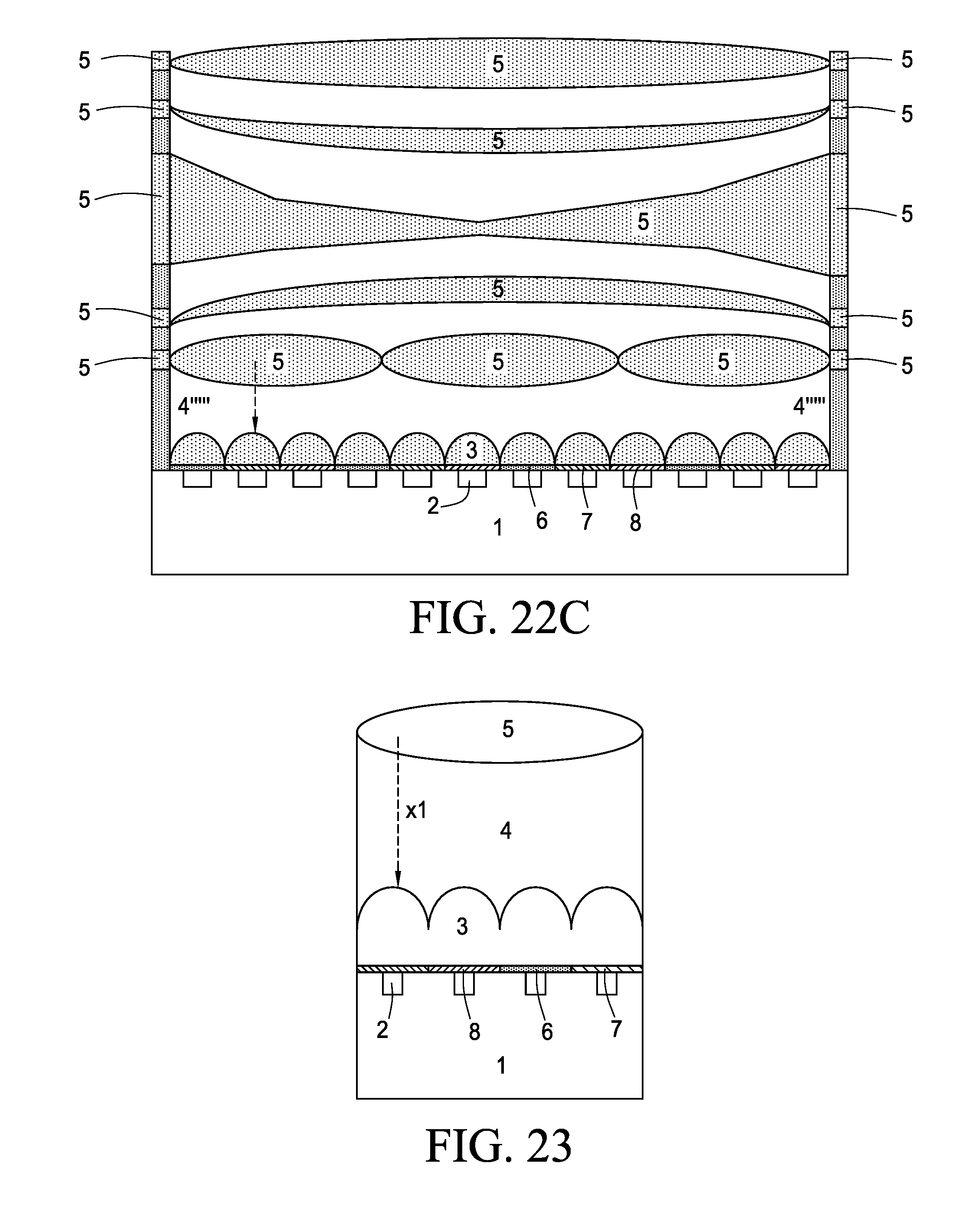 [0083]Without reaching the extreme size reduction reported in FIG. 22.B thanks to the use of materials monolithically integrated chambers with refractive indices of less than 1, are obtained as described in FIG. 22.C (where gaps between layers are not drawn to the same scale as in 22.B). Materials of low refractive index (4) of FIG. 22.B were replace with air (or other gas), and the spacing between the high refractive index lenses (5), including microlenses, are guaranteed thanks to the use of spacing wafers 4′″″ so that on the sensors wafer (including layers 1, 2, 6, 7, 8 and optionally 3) it is located a first spacing wafer 4′″″, on which is placed a plenoptic microlenses wafer 5, on this a second spacing wafer which is placed supports for placement of a first lens (convex-concave in this example), and so on, building a micro-camera of excellent performance suitable for use in portable devices (mobile phones, laptops, tablets, etc., etc.). This invention is a super-set of the depicted in FIG. 14.b, through the addition of more lenses by stacking optical wafers on the sensor wafer and the first plenoptic lens wafer.