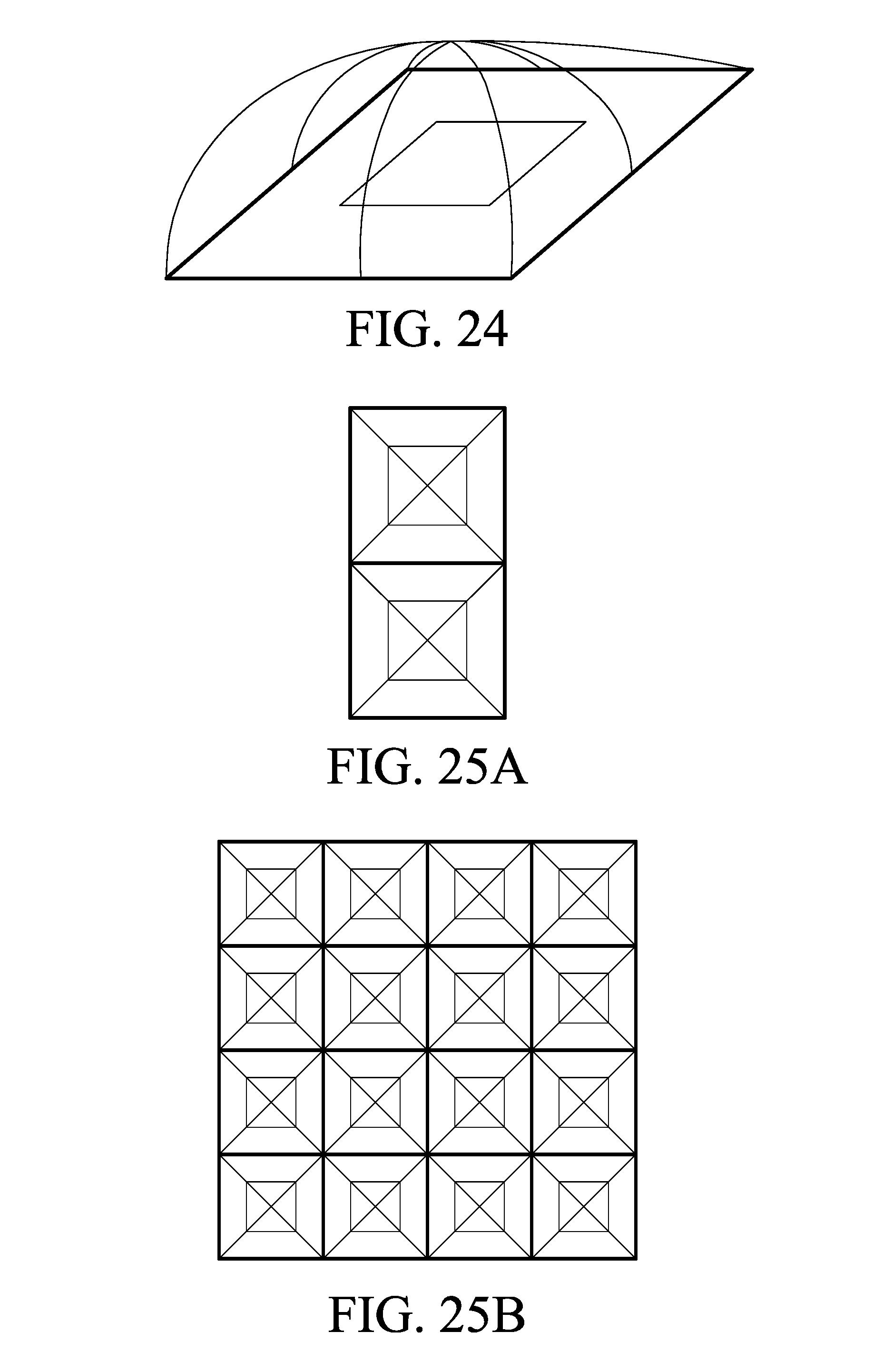 [0046]FIG. 24 shows how a micro-lens on a square area of a photo-sensor substrate is built (the square of the line with smaller thickness is the area of the photo-sensor), high precision of the photolithographic processes enable designs and manufacturing spherical lenses square bases rather than hemispherical lens with circular bases. Such manufacturing processes allow structures in which the lens on the photo-sensor, instead of placing a single hemisphere, places 4 parts of the hemisphere intersecting each other in 4 lines. The FIG. 25.A shows two pixels built next to each other, the thin square line is the photo-sensor constructed on the substrate (such as a CMOS substrate) between said photo-sensors and the squares of thick line appears the area of the substrate area reserved for bias electronics and reading, the blades (as X) placed in the upper part represent the intersections between the four hemispherical portions constituting each micro-lens associated with each pixel.