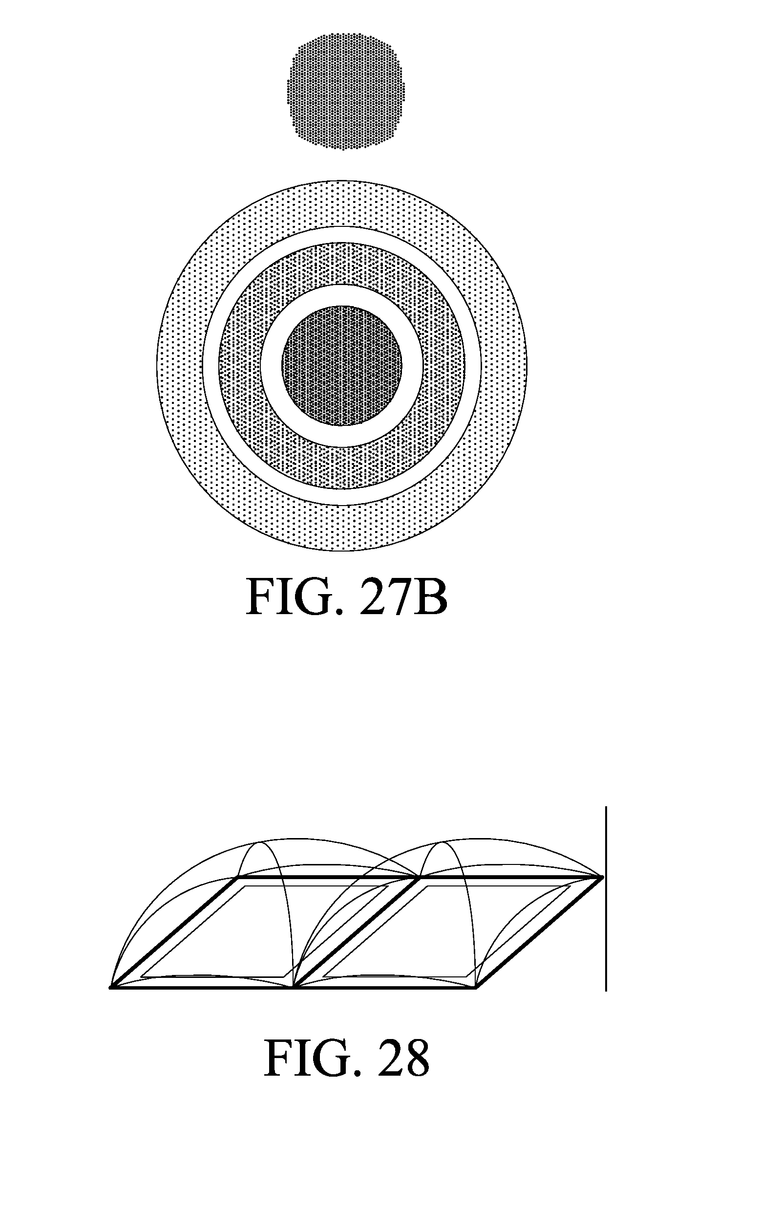 [0100]The need for space, the trend towards miniaturization and the increased number of pixels, has pushed structures where the beams illuminating adjacent pixels overlap between them, in that situation wave phenomena, which can be neglected working with more dimensions high, they must be taken into account so that the sensors continue to operate. The irradiance of FIG. 27.A form called Airy circles on the sensors (or quadri-circles in FIG. 27.B in our example lenses of square pixel, or “trian-circles” when using pixels and triangular pixel lenses), given by the expression: