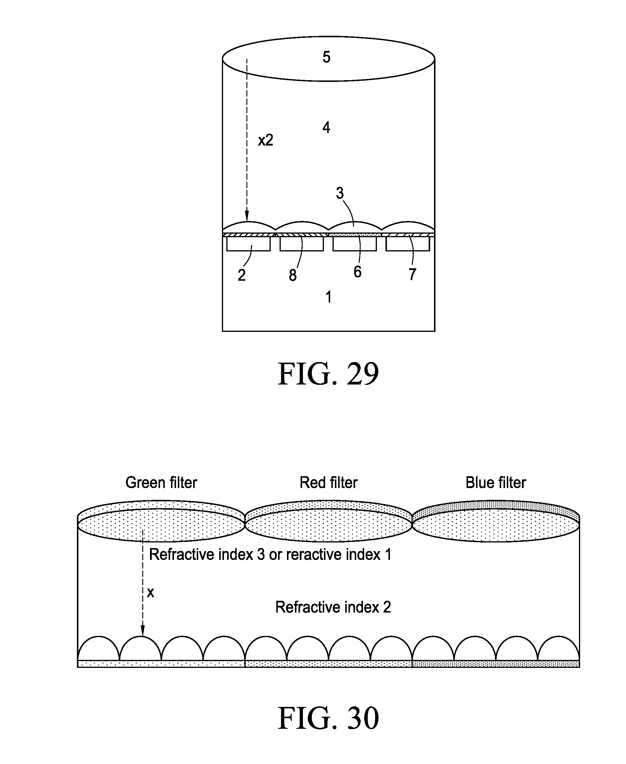 [0161]FIG. 29. Figure lateral section 28 including substrate (1), photo-sensors (2), color filters (6, 7, 8) pixel microlenses (3) low refractive index layer (4) and plenoptic micro-lens (5). Note that the layer 4 of low refractive index never actually touch the color filters (8, 6 and 7).