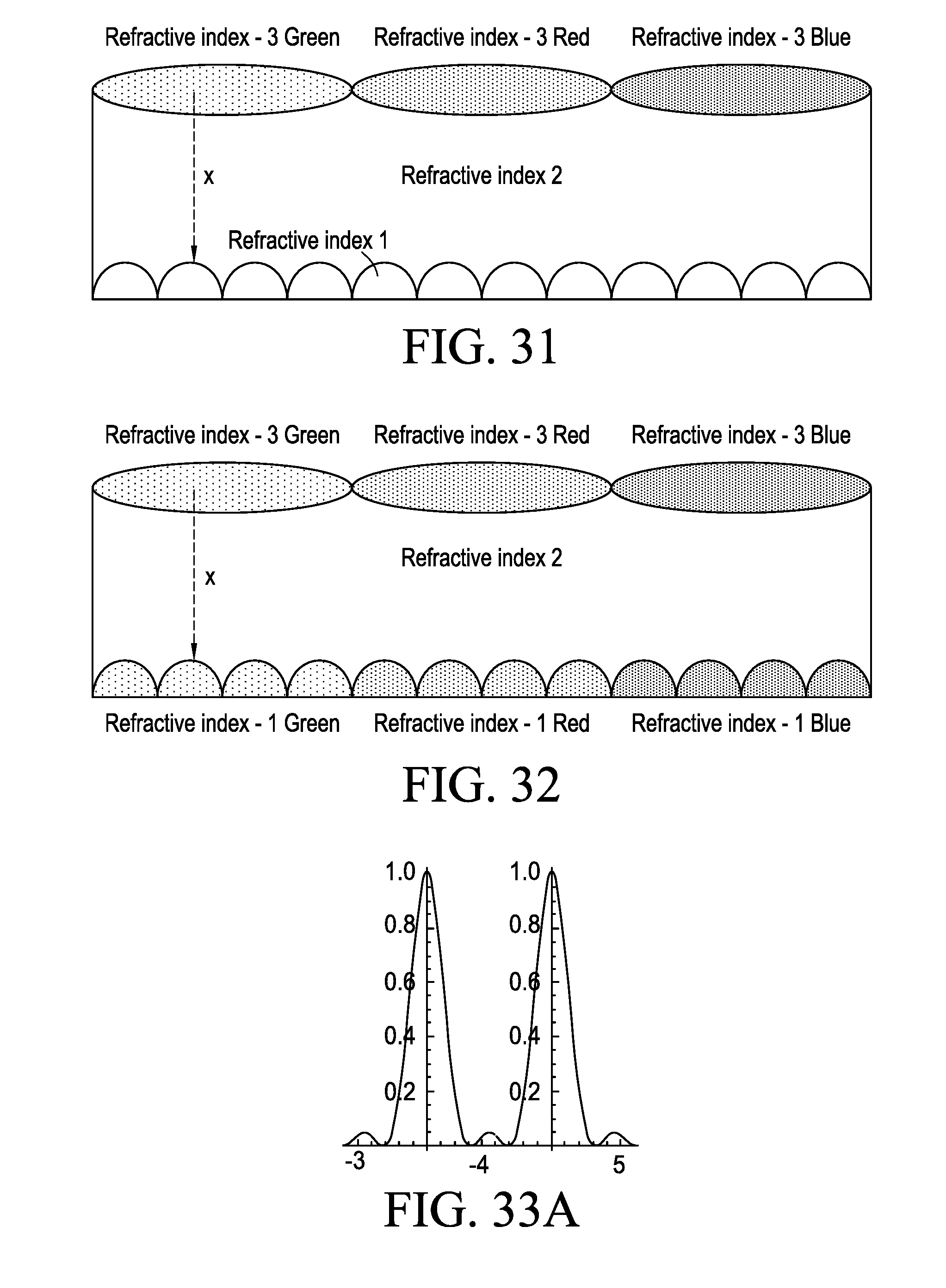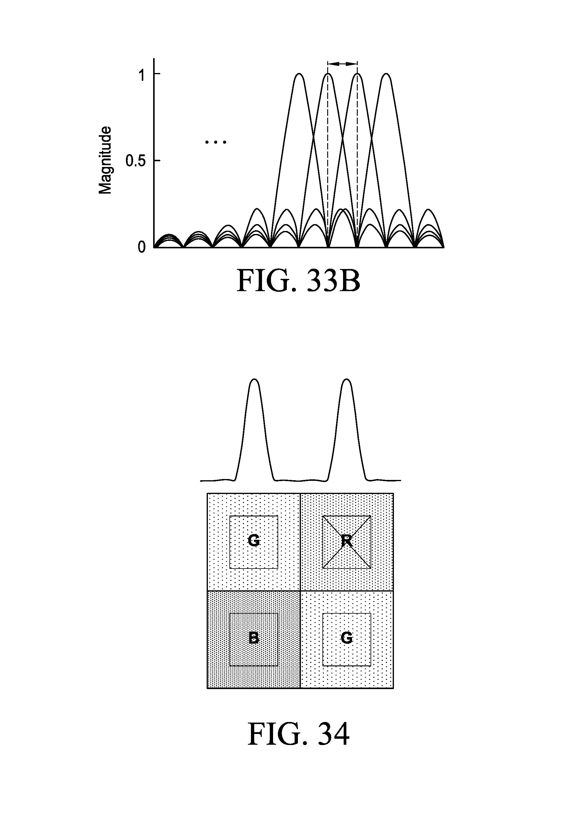 [0165]FIG. 33.A. Irradiance distributions associated with images of two adjacent point objects in the object space projected onto two adjacent pixels in the sensor plane through two adjacent microlenses, resulting in two non-overlapping Airy disks and two interfering rings Airy including in an area between pixels.