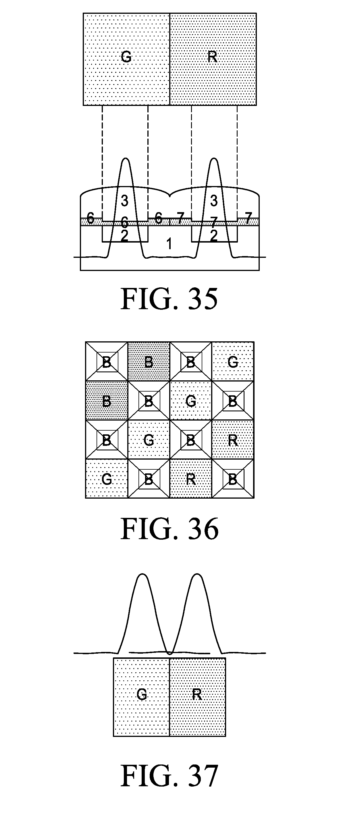 [0168]FIG. 35. Cross section of FIG. 34, wherein it is seen (bottom-up) the substrate photo-sensors (1), the photosensor (2), green color filters (6) and red (7) and pixel microlenses (3). Color filters, in the area of the substrate where no photo-sensors are located on a metal layer (used for polarization and/or reading) or other opaque material. The magnitude of the irradiance of the two circles of green and red Airy contained entirely in the area of photo-sensors is shown.