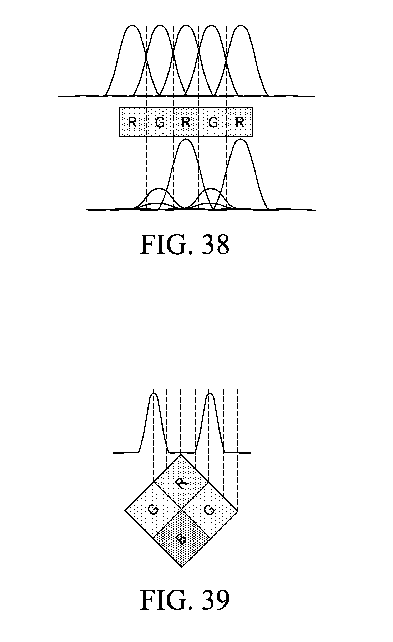 [0171]FIG. 38. In order to further increase the density of pixels per unit area has even accept Airy peaks are located in the neighboring pixel zeros, accepting that not all the energy of the main lobe will be used by sensors, interference between pixels of different colors is minimized by filtering colors.