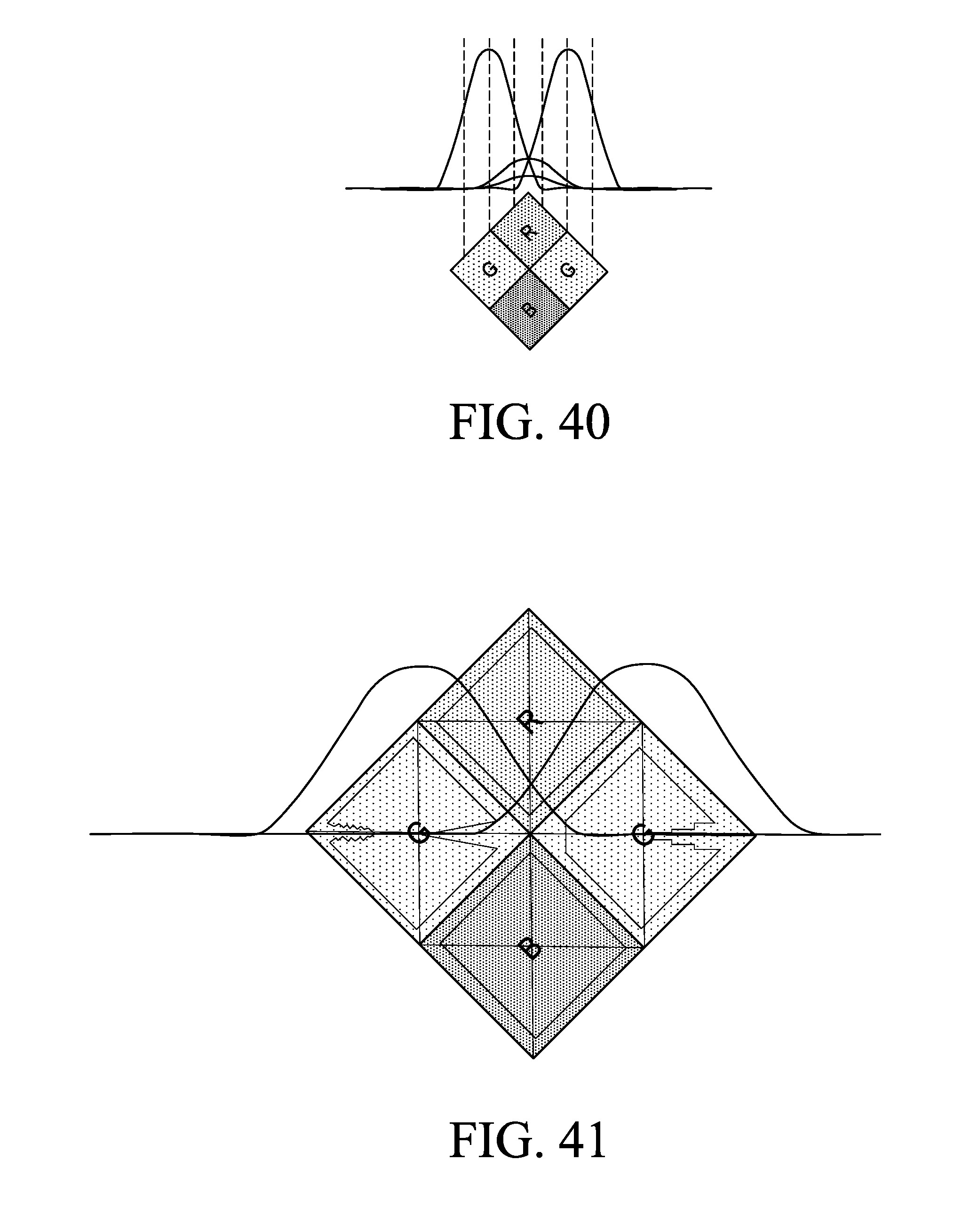 [0099]More critical is the interference of neighboring points of the same color as the adjacent pixel noise is not filtered. In this respect the Bayer pattern provides better performance, as only the green pixels have green diagonal neighbors, while the YOTSUBA pattern all points are neighbors of the same color diagonally. This phenomenon is illustrated in FIG. 39, in this case the area ratio of the photo-sensor to the total of the substrate is sufficiently low that the two green light beams having their first lobe power in the area of the photo-sensor, and the second and third lobes illuminate the opaque area between photo-sensors. However, as the need for more pixels in less area pushes it, and sub-micron technologies allow, it comes to situations like the one in FIG. 40, which may be good enough for certain applications, but the design criteria have pushed the light beams between “microlens/sensor” adjacent overlapping each other, not only the attenuated overlap between colors (red—shown with large attenuation in the figurative and blue with green) but also two beams of green overlapping between them. Remember that it is not possible to design or area sensors or smaller microlenses, since for these dimensions below a certain threshold wave phenomena start to prevail over the rectilinear propagation, and below these thresholds these structures leave to be efficient, resulting in multiple refractions and diffractions preventing the arrival of an appreciable amount of photon sensors. At this point we must accept certain inefficiencies, which nevertheless will result in enough sensors suitable for a vast majority of applications requiring very small sizes and high density of pixels per unit area, especially if we minimize the problem with inventions described below. First, FIG. 40 shows that not all the main beam irradiance is projected onto sensor area, of the main lobe falls opaque area (a deterioration in the efficiency we must accept the sake of miniaturization), but even more serious is the fact that the second and third lobes of a green pixel introduces noise into other adjacent green pixel, increasing the inter-pixel noise, as shown in FIG. 40, since there is no attenuation filters when being neighbors of the same color. FIG. 40 also shows how the red pixel irradiance (and also blue, which though not exactly be drawn) in green area is greatly attenuated by the filters.