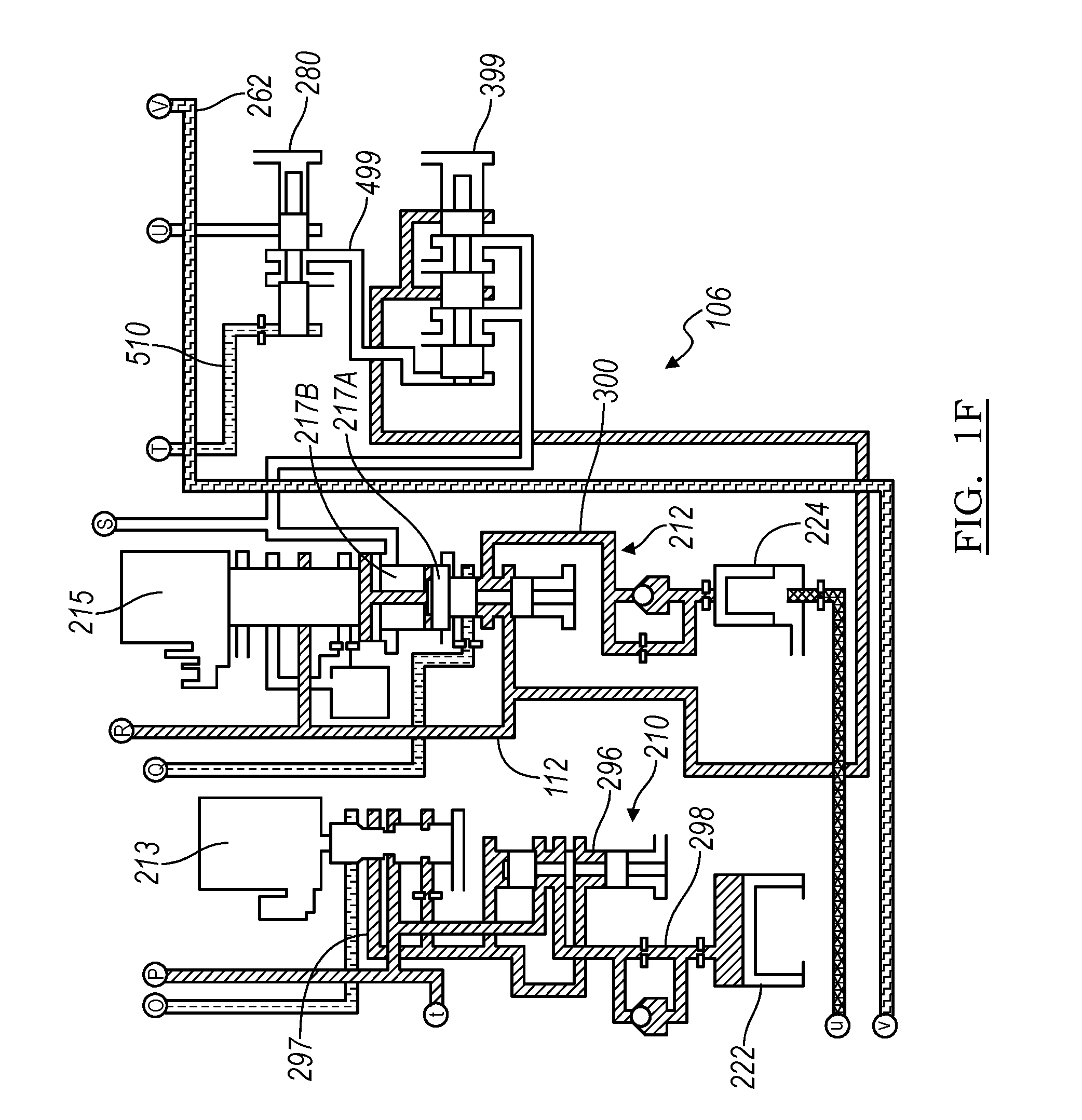 Turning now FIGS. 2A-2F, another arrangement of a hydraulic control system is generally indicated by reference number 400. The hydraulic control system 400 is substantially similar to that shown in FIGS. 1A-1F and like components are indicated by like reference numbers. However, in the hydraulic control system 400, a clutch select valve 401 replaces the clutch select valve 200 shown in FIGS. 1A-1F. The clutch select valve assembly 401 generally includes ports 401A-L. Ports 401D, 401G and 401K are exhaust ports that communicate with the sump 107 or an exhaust backfill circuit. Port 401A communicates with the fluid line 156. Port 401B communicates with the clutch regulation assemblies 202 and 206. Port 401C communicates with a clutch feed line 234. Port 401E communicates with the feed line 154. Port 401F communicates with a clutch feed line 144. Port 401H communicates with a feed line 240. Port 401L communicates with the signal line 156. Port 401J communicates with a check valve 402. And port 401M communicates with the line 234.