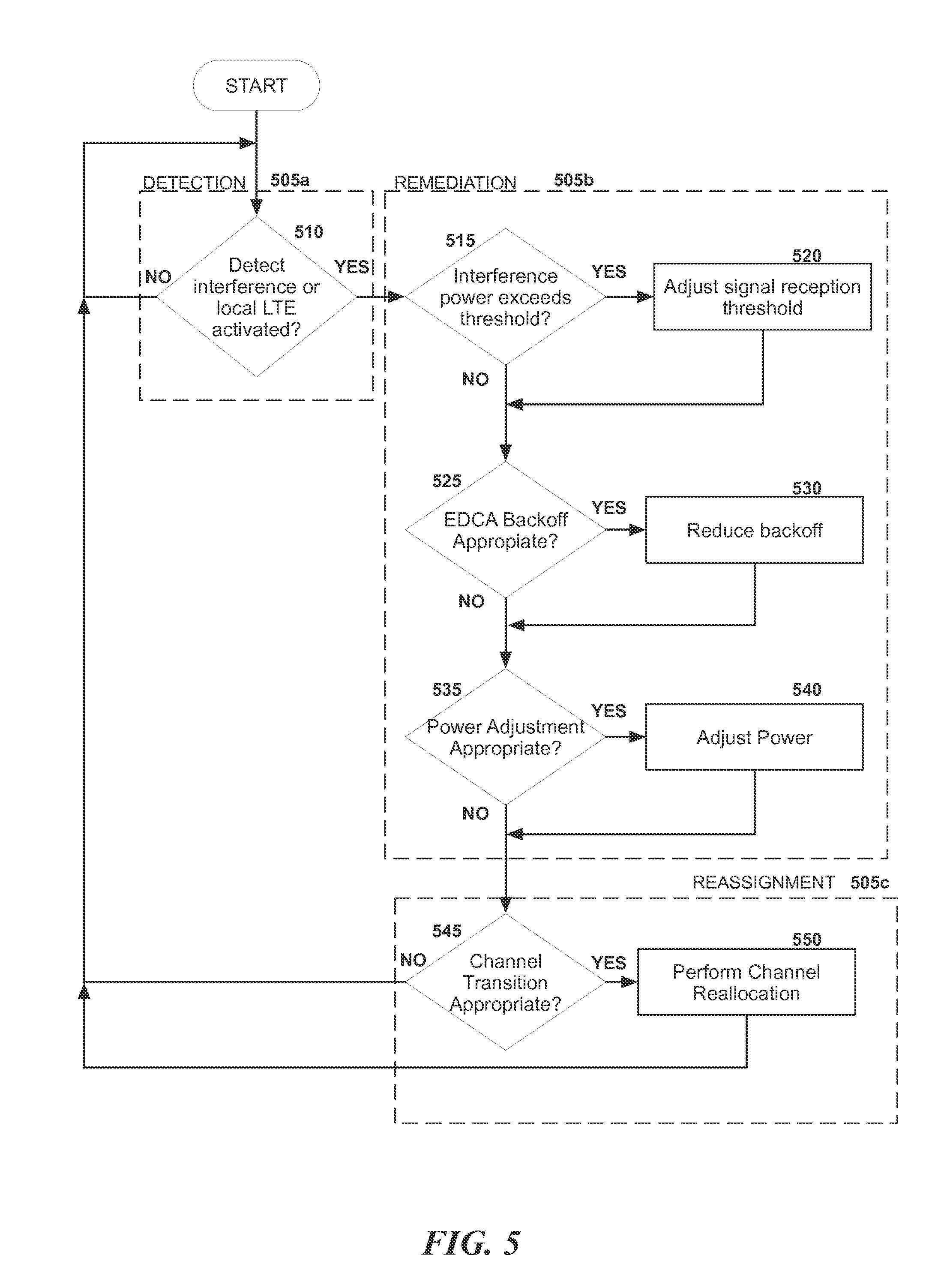 determining a first measurement of channel quality in a first wireless band; detecting the presence of interference in a first wireless band; determining a duration of the interference in the first wireless band; determining an interference power level of the interference in the first wireless band; determining that the interference power level exceeds a threshold; reducing a backoff interval based upon the duration and the interference power level; increasing a transmission power level based upon the duration and the power level; determining a second measurement of channel quality in the first wireless band following the reducing the backoff interval and following the increasing the transmission power level; and effecting a channel transition from the first wireless band to a second wireless band based on the second measurement of channel quality. 10. The non-transitory computer-readable medium of 11. The non-transitory computer-readable medium of determining that a first component on a wireless device communicates on a frequency between 2300 MHz and 2400 MHz simultaneously with a second component communicating in the first wireless band. 12. The non-transitory computer-readable medium of 13. The non-transitory computer-readable medium of 14. The non-transitory computer-readable medium of 15. A computer system comprising: