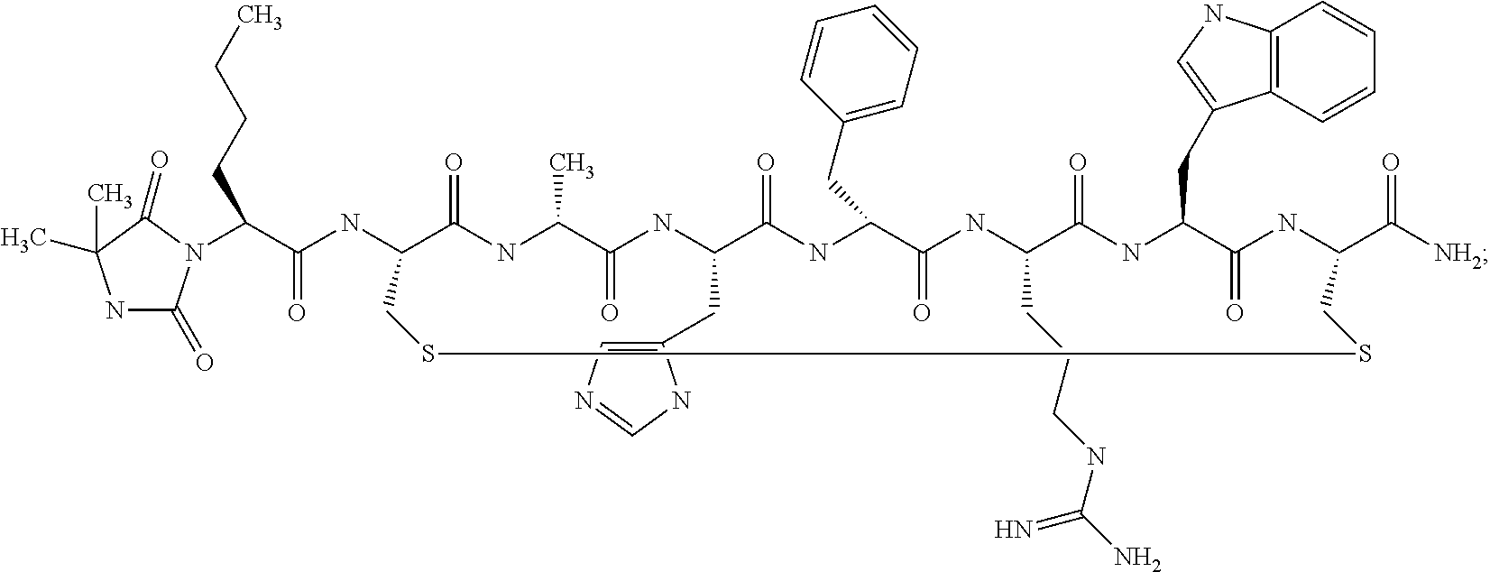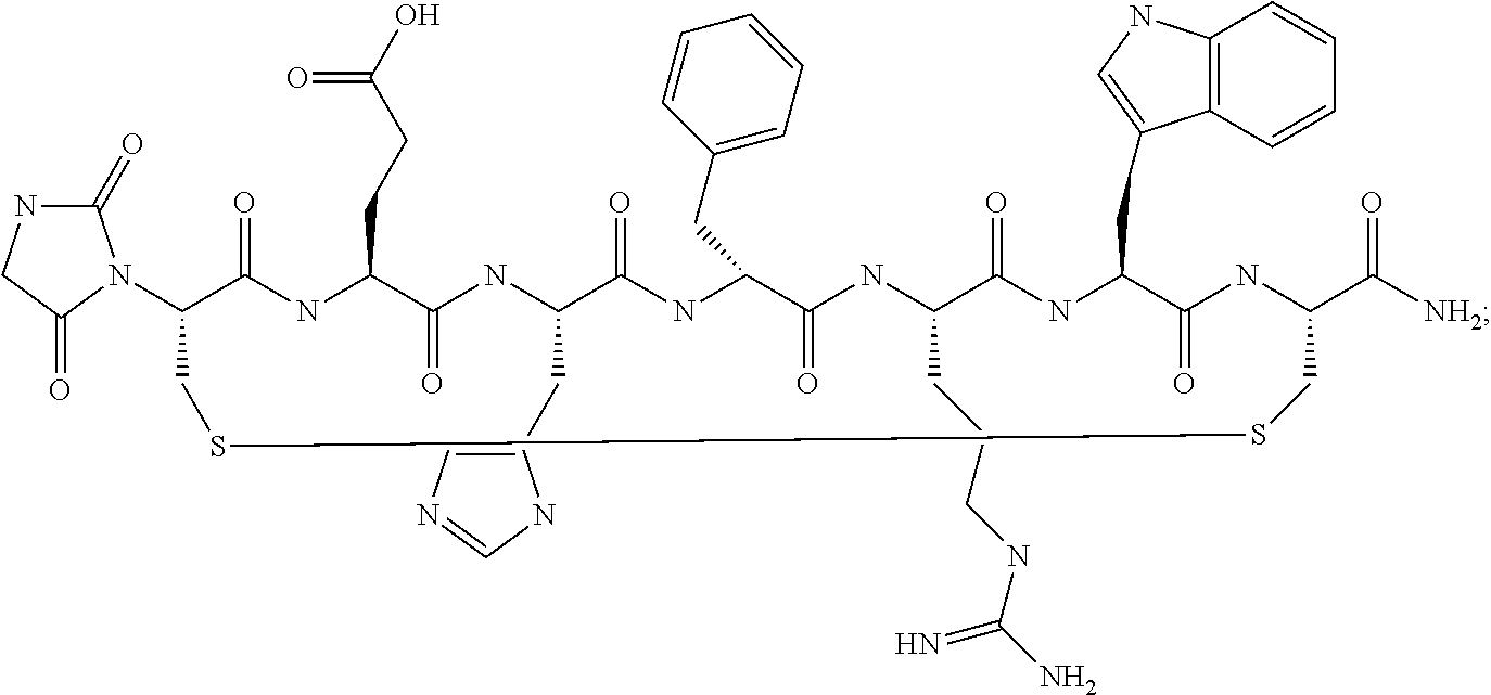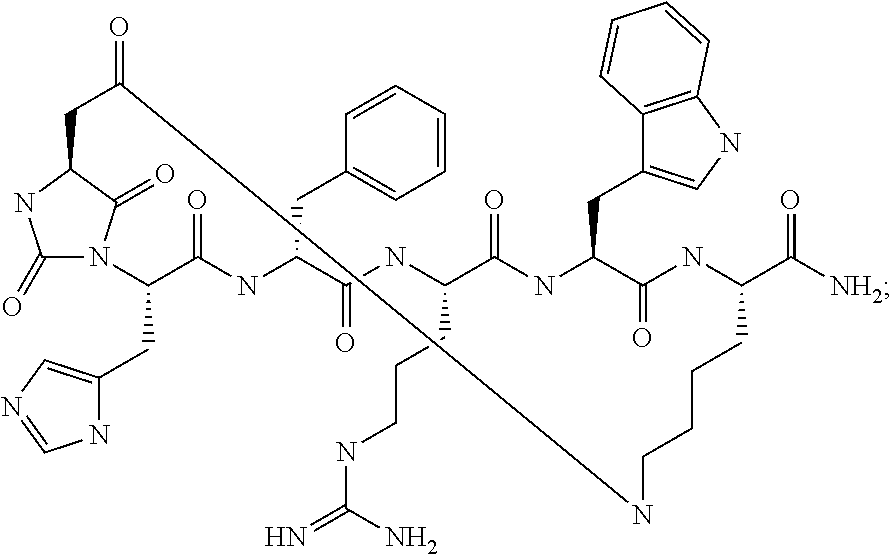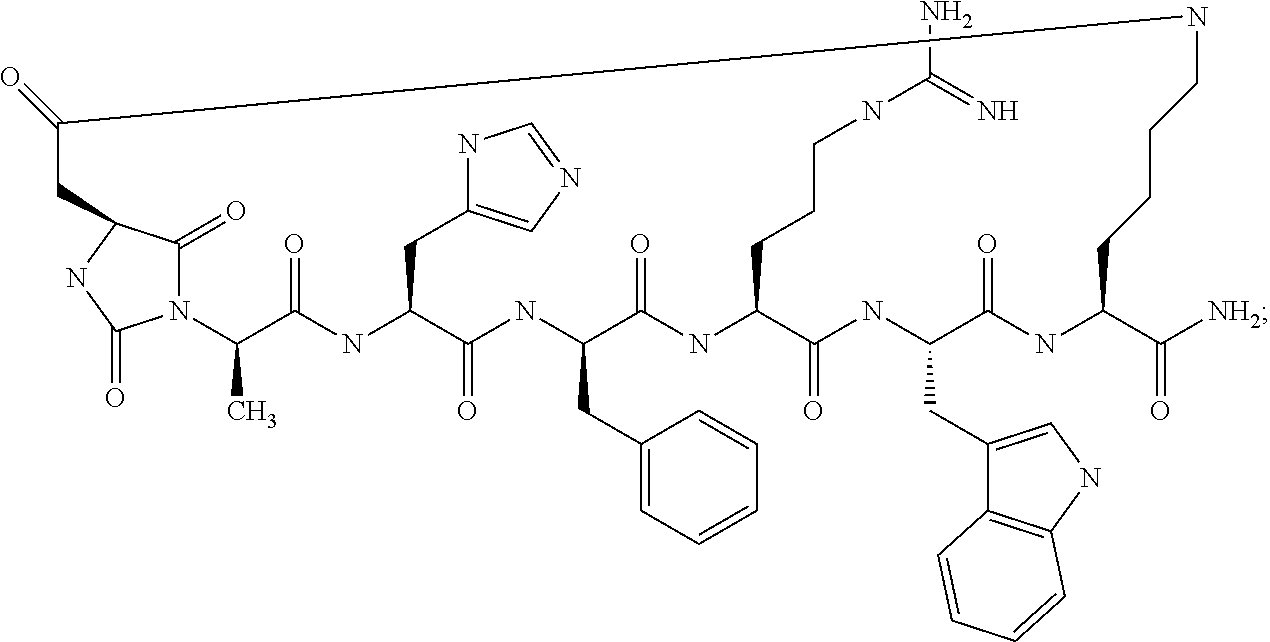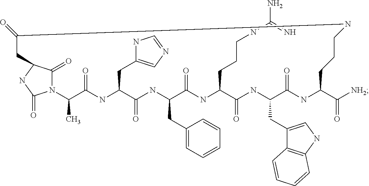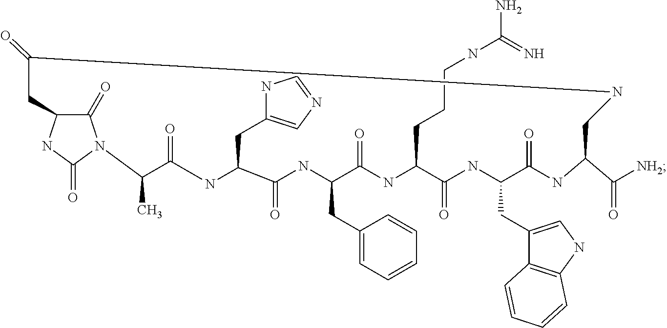 14. The method according to claim 13, wherein cyclo[Hydantoin(C(O)-(Glu-D-Ala))-His-D-Phe-Arg-Trp-Dap]-NH2; or a pharmaceutically acceptable salt thereof is administered