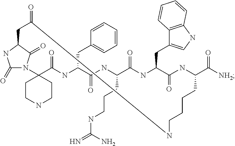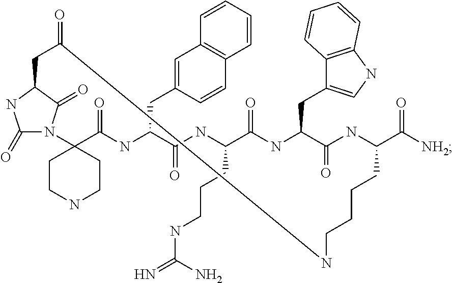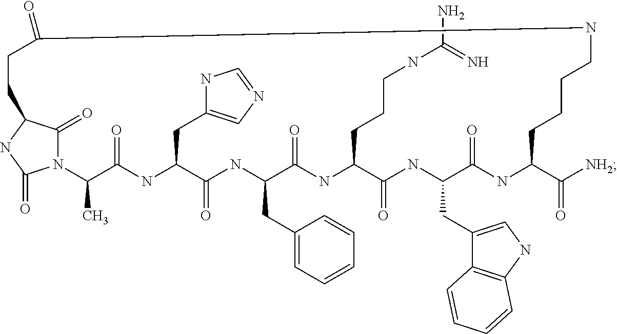 16. The method according to claim 15, wherein cyclo[Hydantoin(C(O)-(Glu-D-Ala))-His-D-Phe-Arg-Trp-Dap]-NH2; or a pharmaceutically acceptable salt thereof is administered