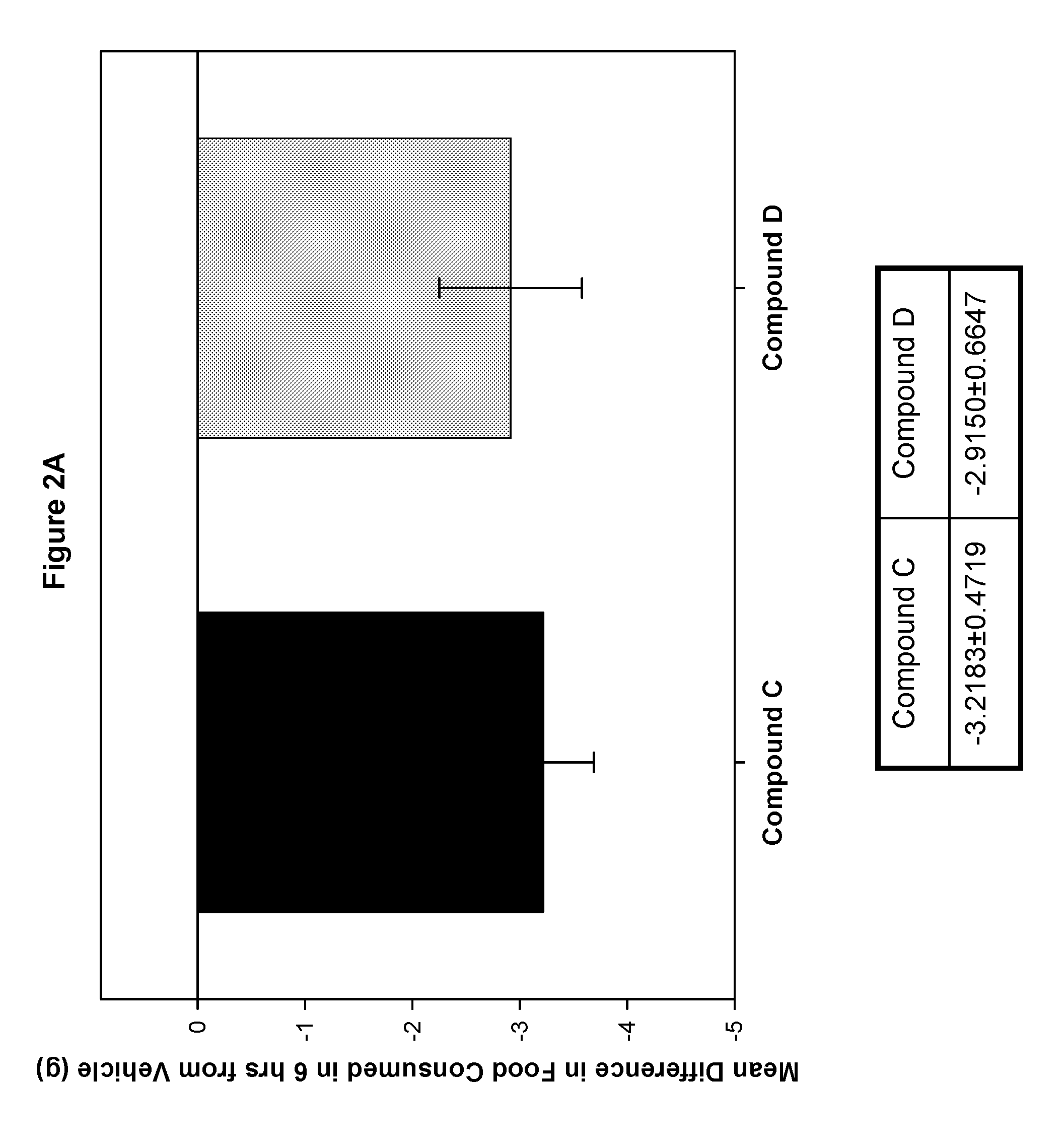 Male Sprague Dawley rats (250 g) were housed in individual cages and maintained under 12:12 hour light:dark conditions. Food and water was available ad libitum throughout the experiment. At time 0, the rats were injected sc with compound at doses of either 8 μmole/kg, or with vehicle. Individual food consumption was measured at about 0.5, 1, 1.5, 2, 3 and 4 hours after injection. Data for selected compounds of the invention are reported in FIG. 1.
